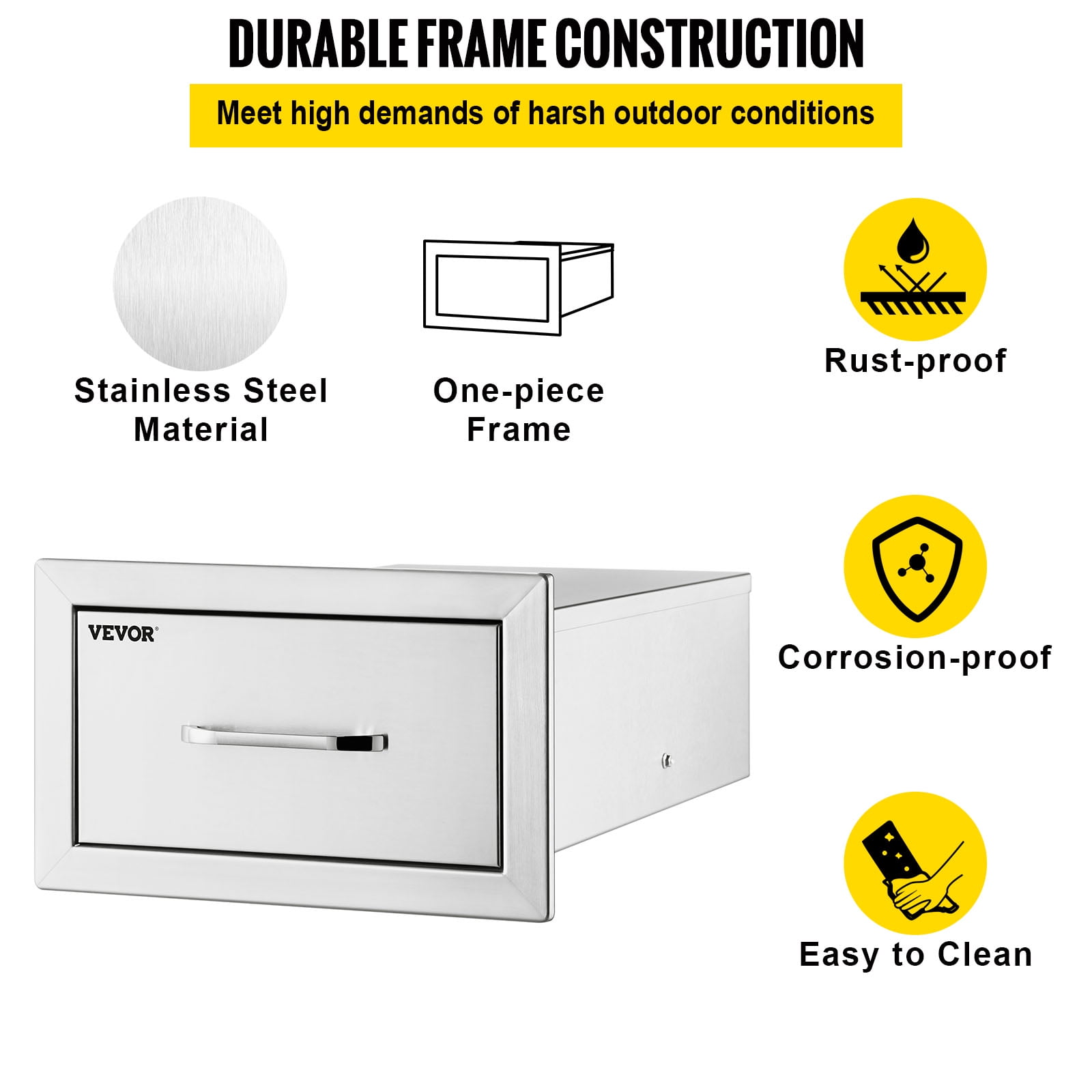 Brand Introduction VEVOR is a leading brand that specializes in equipment and tools. Along with thousands of motivated employees, VEVOR is dedicated to providing our customers with tough equipment & tools at incredibly low prices. Today, VEVOR has occupied markets of more than 200 countries with 10 million plus global members. Why Choose VEVOR? 1.Tough Quality Assurance 2.Incredibly Low Prices 3.Fast & Secure Delivery 4.30-Day Free Returns 5.24/7 Professional Customer Service Product DescriptionOutdoor Kitchen Drawer Premium outdoor kitchen drawer with single storage space, able to contain more kitchen tools. Made of stainless steel, it is durable and sturdy for long time use. Also anti-corrosion and easy to clean. With the fully enclosed box, it can effectively prevent the insides from rain, wind, dust, and insect. Perfect for the outdoor kitchen and BBQ island to use. Durable Material The stainless steel drawer is made of high-quality stainless steel, it can be cleaned up well with no marks or smudges left, one-piece frame construction for durability. Large Storage Space Provide 8.5″x14″ storage space in a weather-sealed box, able to contain more kitchen tools and offers convenient storage opportunities. Enclosed Drawer Completely enclosed construction with durability and rigidity, door closely according to the main body. Effectively prevents the insides from rain, wind, and dust. Smooth Sliding Rails The pull-out tray connected to the main body by the sturdy sliding rails which ensure easy opening and closing of the door with no noise. Exquisite Handle Solid stainless steel handle attached for easy opening of the door. It allows for convenient and easy use. Also boasts a long life span and is easy to keep clean. Widely Used It can be used in any weather condition, no matter rain or shine. Widely used in the outdoor kitchen, such as tableware, into the cabinet, lockers. Specifications Material: Food-grade Stainless Steel Color: Sliver Type: single Overall Size: 14″ x 8.5″ x 23” (WXHXD) Cutout Size: 11.6″ x 6″ x 23.4″(WXHXD) Item Weight: 18.67 l Package Content 1 x Single drawer