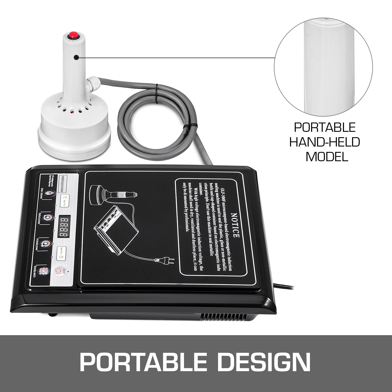 Brand Introduction VEVOR is a leading brand that specializes in equipment and tools. Along with thousands of motivated employees, VEVOR is dedicated to providing our customers with tough equipment & tools at incredibly low prices. Today, VEVOR has occupied markets of more than 200 countries with 10 million plus global members. Why Choose VEVOR? 1.Tough Quality Assurance 2.Incredibly Low Prices 3.Fast & Secure Delivery 4.30-Day Free Returns 5.24/7 Professional Customer Service Product DescriptionHandheld Induction Sealer 110 V The induction sealing machine enables to seal non-metallic bottles with aluminium foil under the electromagnetic induction device. It works by applying instant high heat to the foil that needs to be melted in order to seal the bottle. It seals in a matter of seconds and preserves and protects whatever is stored inside.The sealing diameter range is from 20 mm to 100 mm. Sealing power is 800-1200 W. High power could improve sealing speed and low power could get better sealing quality, which depends on your sealing needs. Efficient and convenient. Electromagnetic Induction Adopt the electromagnetic induction principle. The pure copper induction coil makes the machine rum more efficiently and consume loss energy. And the thickening head lets the machine more sensitive and reliable. Sensitive Button On the top of the induction thickening head, a new and red inductive handle switch is selected for the equipment, which is sensitive to use and easy to replace and repair. Start the machine with one button, efficient and convenient. Multifunctional Touch Screen The power can be adjusted by increasing power or decreasing power. Automatically counts and controls the number of seals. The seal time adjustment has two buttons. The left: single number(0-5), the right: decile(0-9),time adjustment range: 0.1 s-5.9 s. Efficient Heat Dissipation Equipped with a high quality heat dissipation fan. Ventilation and heat dissipation is faster. Avoid equipment overheating to multiple protection of machine circuit. The power cord is thickened and high temperature resistant. 15min Automatic Power-off The handheld electromagnetic induction sealing machine will shut down automatically if there is no operation within 15 minutes. A design for energy saving and environmental protection. Portable Design The machine has a portable, light-weight design. Perfect for industrial sealing in a limited space and also personal sealing for home usage. Dimensions: Length 28 x Width 34 x Height 6 cm. Specifications: Model: GLF-500F Power: 800W-1200W Sealing Diameter: Φ20-Φ100 (mm) Voltage: AC 110V/60Hz Dimension: 11.02″ x 13.39″ x 2.36″ Relative Humidity(RH): ≤80% Max. Allowable Current: <6A Static Power Consumption: ≤0.1A Shell Protection Grade: Ip21 Weight: 2.7kg Package Content: 1 x Handheld Induction Sealer 2 x Bottles 1 x Users’ manual