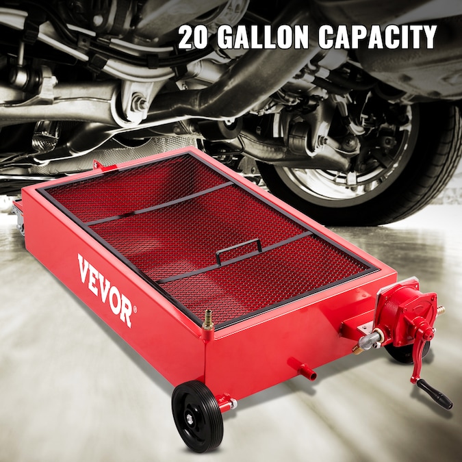 - Specification: Capacity: 18 Gallons / 68 L; Front Wheel Size: 6-Inch Fixed Wheel; Rear Wheel Size: 3-Inch Universal Wheel; Oil Draining Method: Hand Pump; Oil Discharge Section Port: 1/2 Port; Oil Drain Pipe: 7.2′ / 2.2 M; Steel Plate Thickness: 0.08” / 2 mm; Mesh Grille: 0.05” / 1.2 mm; Oil Drain Pan Size: 50.4” x 22.4” x 11.81” / 128 x 57 x 30 cm; Fuel Tank Size: 31.5” x 19.9 x 6.7” / 80 x 50 x 17 cm