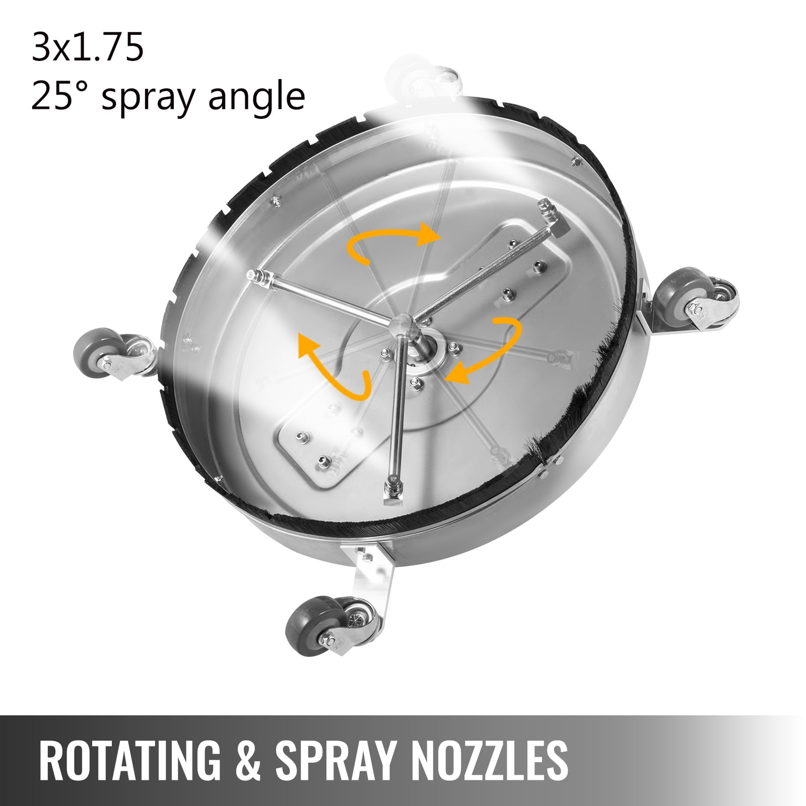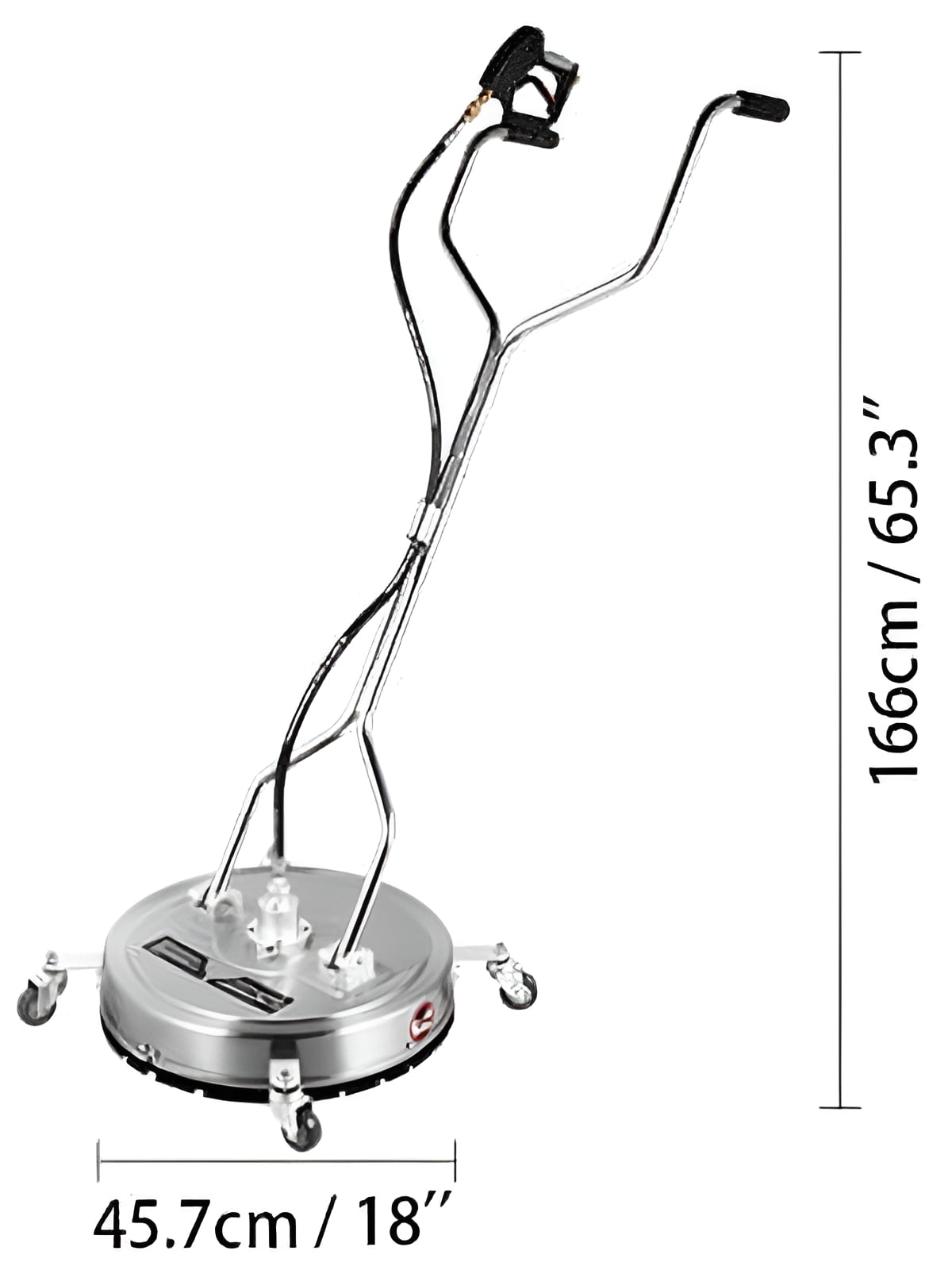 Brand Introduction VEVOR is a leading brand that specializes in equipment and tools. Along with thousands of motivated employees, VEVOR is dedicated to providing our customers with tough equipment & tools at incredibly low prices. Today, VEVOR has occupied markets of more than 200 countries with 10 million plus global members. Product Description 18″ Flat Surface Cleaner This pressure flat surface cleaner is capable of cleaning any flat surface area. It can be used with both cold and hot water. It features lightweight, corrosion resistance, and premium stainless steel material for long-lasting use. Professional Cleaner Range This product is made of stainless steel, which can resist corrosion & rust and withstand the toughest abuse. Designed to clean large surfaces of 18″, it is efficient. Rotating & Spray Nozzles Three rotary rods with three 1.75 orifice nozzles with a 25° spray angle offer a broad cleaning surface. Sturdy bristled brushes give efficient cleaning and control over-spray. Trigger Gun & Handle The handle is angle adjustable to suit different needs. The joints are smooth. Trigger gun has a 3/8-inch quick connect female inlet plug to connect the pressure washer hose. Quiet & Universal Wheels This surface cleaner is with four scratch-resistant 360-degree swivel casters that are screwed to the bottom. Movement is smooth. The operation is convenient. Easy & Quick Install It comes with all necessary accessories for easy assembly in just a few minutes. It is suitable for cold and hot water applications. Max Temp: 212 °F. Various Application Places This surface cleaner is suitable for cleaning horizontal surfaces, used on the road, driveways, decks, patios, sidewalks, driveways, pool decks, parking lots, etc.