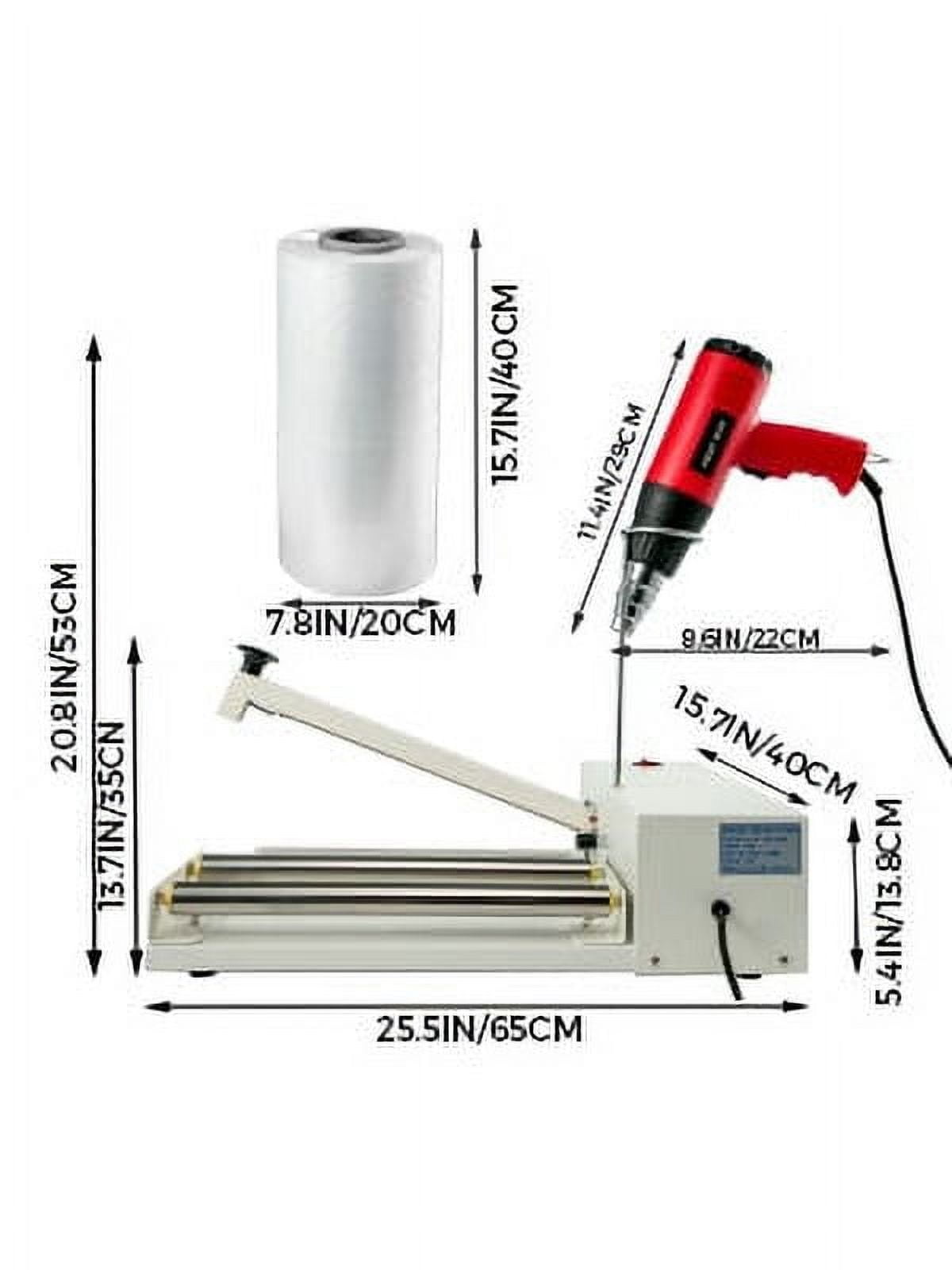 Brand Introduction VEVOR is a leading brand that specializes in equipment and tools. Along with thousands of motivated employees,VEVOR is dedicated to providing our customers with tough equipment & tools at incredibly low prices. Today, VEVOR has occupied markets of more than 200 countries with 10 million plus global members. Why Choose VEVOR? 1.Tough Quality Assurance 2.Incredibly Low Prices 3.Fast & Secure Delivery 4.30-Day Free Returns 5.24/7 Professional Customer Service Product Description Shrink Wrap Machine W/ Heat Gun 18″/45.7CM Sealing Length With an iron construction, this durable and high-efficient shrink wrap machine comes with a hot air gun and a roll of film, suitable for sealing 18″ length film or plastic bags. Easy to operate and safe to use. Keep a neat appearance for products, like books, toys, foods and so on. Durable Iron Structure The shrink wrap machine has a sturdy iron construction, powder-coated, good resistant to rusk, wear, scratch and corrosion, solid and durable for a long time use. High-quality Heat Gun Heat gun has 2 level adjustable wind speed, high and low settings. High quality with an air inlet, a grid-type air outlet, and a stainless steel wind mouth, insulated with plastic shell. Sealing Bar & Rollers Have an excellent sealing effect with a lever, heating wires and silicone strip, easy to operate. Two stainless steel rollers support the film roll, allowing the film flat, and the sealing efficient. Adjustable Temperature Pure copper transformer allows for an efficient heating process. 9-level temperature adjustable, offers a stable support and multiple temperature choice, to suit films of different thickness. Available Film Roll This shrink wrap machine comes with a roll of 170m/558feet long, 16 inch wide shrink film, for you to seal product. It protects products against pilfering, dirt, dust, moisture and handling. Wide Application I-bar Sealer is Ideal to shrink wrap books, CD, food, toys, medicine etc., suitable for both home and commercial use. Compatible with PVC film, POF film, plastic bags etc.. Specifications Material: Iron Seal Length: 18″/ 45.7cm Heat Gun Power: 1800W Shrink Wrap Machine Power: 530W Film(L x W): 558′ x 16″ Package Content 1 x Shrink Wrap Machine 1 x Hot Air Gun 1 x 558′ Centerfold Film 2 x Heating Wires 1 x Tape