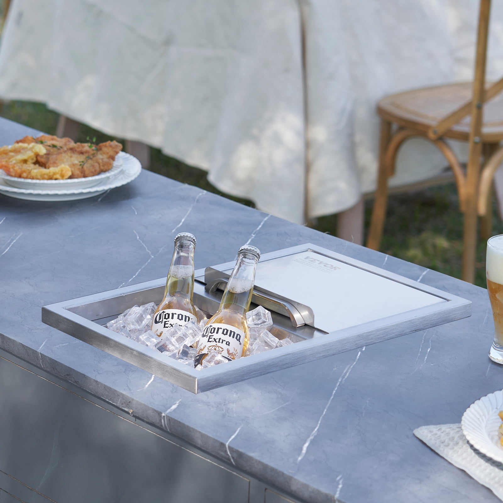 Large Capacity: A large-capacity drop in ice bin that can hold about 28QT (26.7L) of ice. When filled, it can make approximately 112 cups of 16oz beverages. Ideal for storing a large amount of ice or chilling various drinks. Non-Electric Insulation: Constructed with a stainless steel surface and a 0.79″ (20mm) PU foam layer. The sliding cover creates an exceptional insulating space. Offers over 24 hours of insulation without the need for electricity or energy. Food-Grade Material: The entire ice chest is made from stainless steel (top lid + interior SUS304, exterior SUS201), making it durable and rust-resistant. The interior uses an integrated full-welding process, greatly reducing the possibility of leaks. Additional Details: Specially equipped with a filter-style water pipe for easy installation and use. It quickly drains accumulated water, maintaining dryness and hygiene inside the ice chest. The filter mesh prevents ice cubes from falling out. Embedded Installation: The ice storage chest can be installed in beverage stores, hotels, or bar counters. Also suitable for indoor and outdoor kitchen counters. The embedded installation saves significant space.