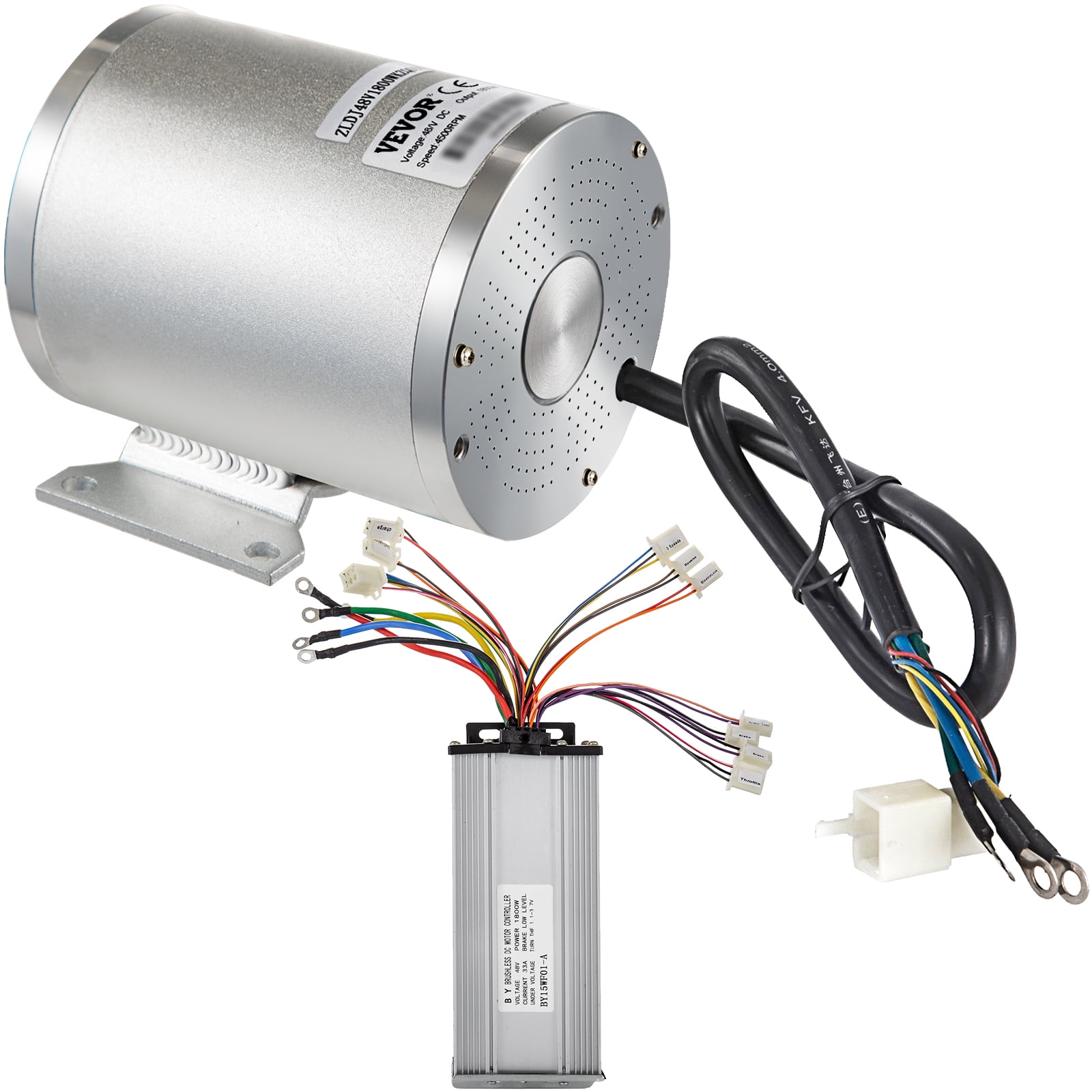Brand Introduction VEVOR is a leading brand that specializes in equipment and tools. Along with thousands of motivated employees,VEVOR is dedicated to providing our customers with tough equipment & tools at incredibly low prices. Today, VEVOR has occupied markets of more than 200 countries with 10 million plus global members. Why Choose VEVOR? 1.Tough Quality Assurance 2.Incredibly Low Prices 3.Fast & Secure Delivery 4.30-Day Free Returns 5.24/7 Professional Customer Service Product Description 48V 2000W Brushless DC Motor Kit w/ Controller 4300RPM Rated Speed & Controller & Throttle Grip This brushless electric motor is built with a 100% copper core for low noise operation and high working efficiency. It features an aluminum alloy shell and a complete accessories kit to help you fix the motor safely. It is ideal for go karts, electric scooters, e-bikes, ATVs, motorized bicycles, etc. Hit the ground running faster than ever with our brushless DC motor kit. Pure Copper Motor The electric brushless dc motor features a 100% pure copper core for high conductivity, high-temperature resistance, low noise, and saves energy during extended use. 4300 RPM High Speed This dc brushless motor kit runs at 2000W, the rated speed is 4300RPM, and the maximum speed is 5400 RPM. Thus, it can provide fast acceleration and unmatched power for your machines. Durable Aluminum Alloy Shell The electric go kart motor is constructed from aluminum alloy material, which can resist oxidation, compression, and deformation. Besides, it is lightweight enough to carry and process with ease. Dual-Direction Design You can switch the rotation to either a clockwise or counterclockwise direction by reversing the go kart electric motor’s power wires, which are easy to adjust. Simple Speed Control The speed controller allows you to control the speed effortlessly. The complete brushless motor set, speed controller, and other necessary components assist in operating the machine. Wide Application Electric brushless motor is ideal for Electric Scooters, Motorcycle, Ebike Bicycles, Motorcycle, E Tricycle, Mid Drive Motor Kit, Complete Sets, DIY Engine Systems, Cycling Parts, Mini Electric Motorcycles, DIY Engine Kit, etc. Specifications Motor Model: MY1020D Input Voltage: 48V DC Output Power: 2000W Rated Current: 34A Rated Speed: 4300 RPM Maximum Speed: 5400 RPM Sprocket: T8F-11T Horsepower: 2.67HP Rated Torque: 4.2 N.m / 594.77 oz.in Maximum Current: 42A No-load Current: ≤ 3.8A Peak Efficiency: ≥ 85% Working Temperature: < 120 °C / 248 ℉ Shaft Length: 5.28'' / 134 mm Net Weight: 10.36 lbs / 4.7 kg Mount Bracket Size: 2.2 x 4'' / 56 x 102 mm Dimensions(L x W x H): 6.7 x 4.2 x 4.3'' / 169 x 107 x 110 mm Controller Model: BY15WF02-A Current: 34A Phase Degree: 120° Conversion Efficiency: 90% Under Voltage Protection Voltage: 41±0.5V Package Content 1 x Brushless DC Motor 1 x Controller 2 x Throttle Grip 1 x Multi-purpose Wrench 1 x L-Shaped Wrench 1 x Screw Set 1 x Ignition key