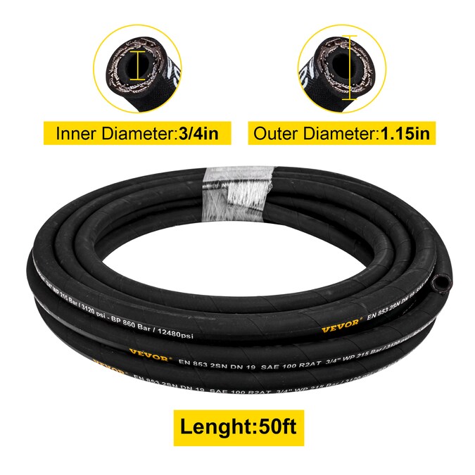 - Specification: Outermost: Fabric, Synthetic Rubber; Innermost: Synthetic Rubber; Inner Material: 2 high-tensile steel wire braid; Length: 50 ft(15.2 m); Inner Diameter: 3/4 inch; Outer Diameter: 1.15 inch; Pressure: 3120 PSI; Explosion Pressure: 12470; Work Temperature: 40 to 248 degrees Fahrenheit