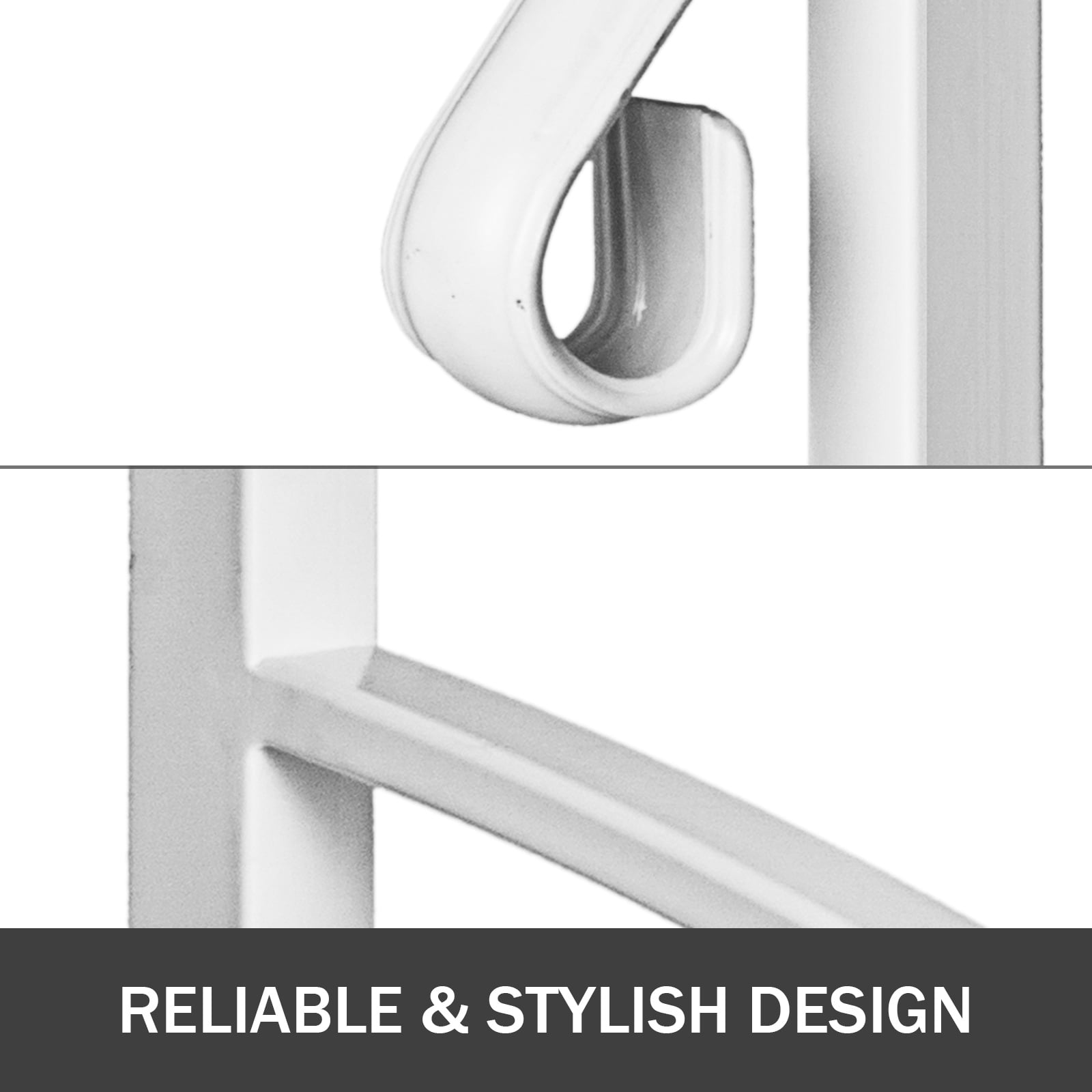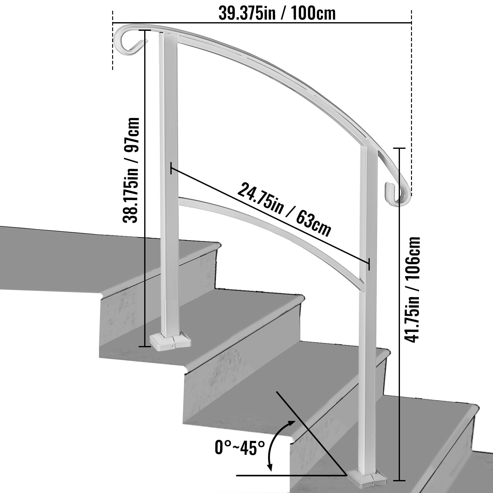 Brand Introduction VEVOR is a leading brand that specializes in equipment and tools. Along with thousands of motivated employees, VEVOR is dedicated to providing our customers with tough equipment & tools. Today, VEVOR has occupied markets of more than 200 countries with 10 million plus global members. Why Choose VEVOR? 1.Tough Quality Assurance 2.Fast & Secure Delivery 3.30-Day Free Returns 4.24/7 Professional Customer Service Product DescriptionTransitional Handrail Fits 3 Steps This matte white handrail is transitional handrail that fits for 3 steps. It is an elegant handrail that’s a comfortable fit for any budget. Constructed with real iron metal and adopted powder coating technology, it is suitable for gardens, residential buildings, commercial office buildings, hotels, etc. 3-step Handrail This is transitional handrail for 3 steps. Real Iron Metal This handrail is constructed with real wrought iron, not aluminum. It is more strong and reliable and will not fail or bend like aluminum. Also, stainless steel post mounts will not rust or flex. Powder Coating Technology Adopted powder coating technology, the handrail picket is designed to be matte white. It is rustproof for durability and easy to clean. Reliable & Stylish Design All the connections are strongly welded and perfectly connected. The iron picket and curved design is beautiful and stylish. Easy To Assemble The handrail includes all necessary assembly and installation hardware. Universal Application Suitable for gardens, residential buildings, commercial office buildings, hotels, etc. Specification Model: Transitional Handrail Color: Matte white Material: Real Iron Metal Package Content 1 x Handrail Powder Coating White 1 x Installation Kit