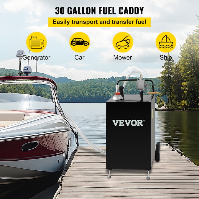 30 Gallon Fuel Caddy: Siphon Pump and Move It Around and Sturdy Construction; This large capacity 30-gallon fuel caddy is easily maneuverable, making it efficient and effortless to refuel during various applications, with less spilling and waste of fuel; It is a piece of ideal equipment for an auto repairs, farms, gardens, small engines, motorcycle/ATV, marine uses, and more; This quick and clean fuel caddy is handy to have around; Our caddy will always be by your side, no matter the conditions; High Volume 30 Gallon Fuel Caddy; Piston Structure and Siphon Pump; Easy to Move and Store; Highly Robust Construction; Speedy and Convenient Fuel Filling