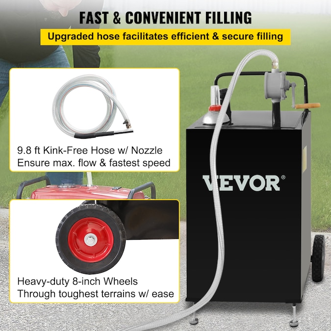 - Transport Effortlessly and Easy to Use: The anti-static ground clamp can prevent static discharges and eliminate static electricity; An accurate fill gauge lets you quickly determine your fuel level at a glance, reducing the risk of overflows; Heavy-duty 8 in wheels transport your caddy through the toughest terrains with ease; Filler neck with gas cap, handy tube holder, and leveraging push handle are also equipped