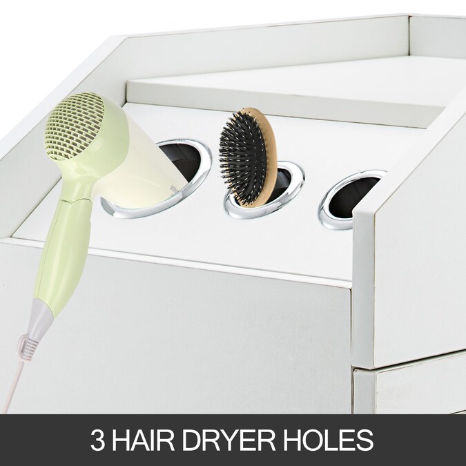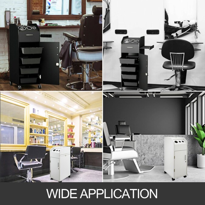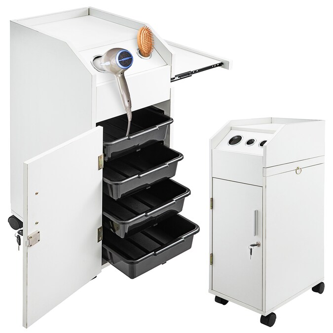 - This cart has 4 sliding drawers, 3 hair dryer holes and a spacious top work area
