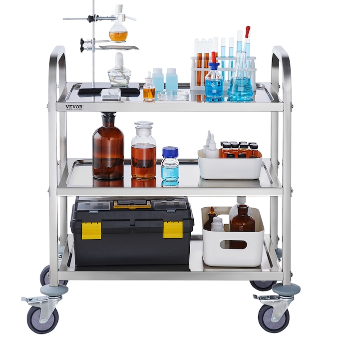 Upgrade Your Lab Efficiency with VEVOR Stainless Steel Cart;: Do you need more space? Upgrade your laboratory storage with the VEVOR lab cart; Our durable stainless steel construction, 3-tier design, and versatile casters offer an effective solution for lab organization; Whether you work in a salon, clinic, or hospital, our multi-functional trolleys meet your needs;; [Package Content] 1 x Lab Cart; 1 x Tool Gloves; 1 x Instruction Manual; 13 x Screw (With Spacer); 1 x Allen Wrench; 1 x Hexagonal Nut Wrench