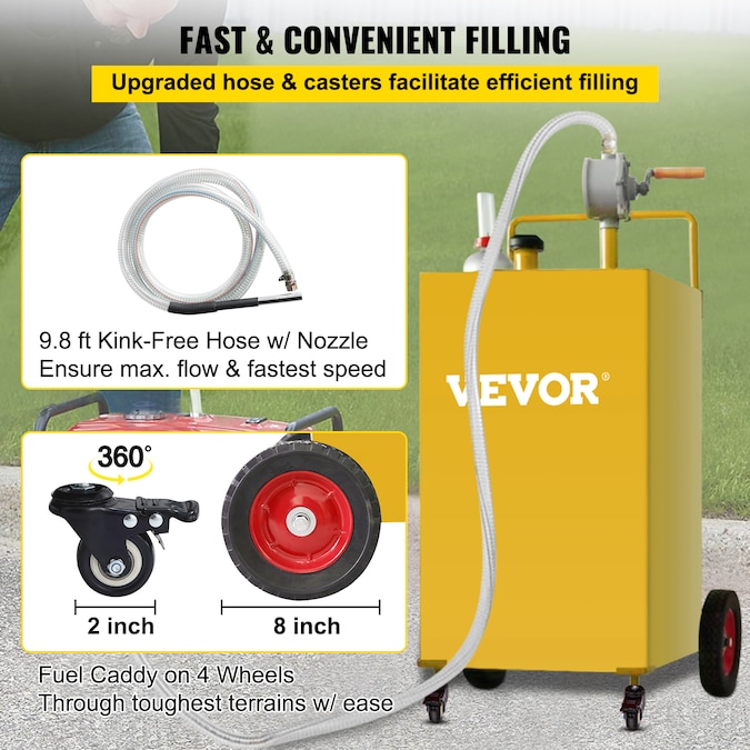 - Transport Effortlessly and Easy to Use: The anti-static ground clamp can prevent static discharges and eliminate static electricity; An accurate fill gauge lets you quickly determine your fuel level at a glance, reducing the risk of overflows; Heavy-duty 8 in wheels and 2 in wheels transport your caddy through the toughest terrains with ease; Filler neck with gas cap, handy tube holder, and leveraging push handle are also equipped