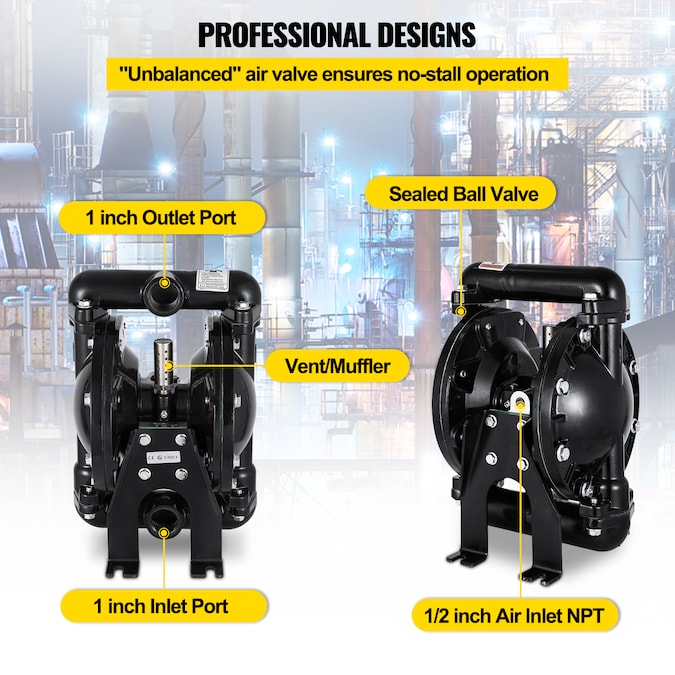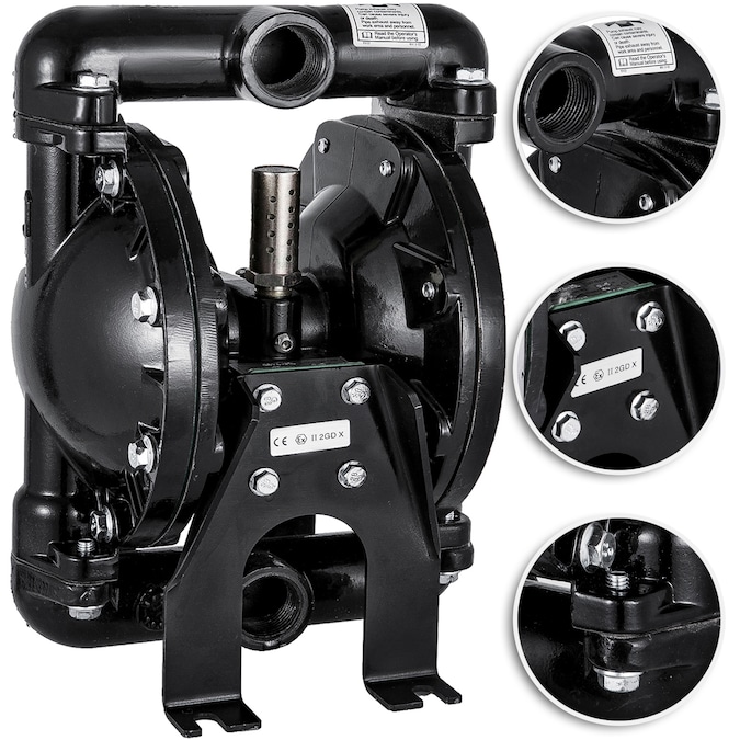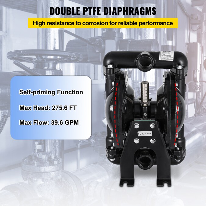 Air-Operated Double Diaphragm Pump Aluminum Alloy Construction and PTFE Diaphragm and 39.6 GPM Flow Rate Our self-priming diaphragm pump features an all-bolted aluminum alloy body and double PTFE diaphragms, sturdy and corrosion-proof, without leakage; Sealed ball valves and non-stall operation provides outstanding performance; It is perfect for transferring viscous and flammable fluids; Our top of the line self-priming diaphragm pump will ensure your operations are flowing smoothly;: Excellent Air-operated Performance; [Package Content] 1 x Air-Operated Double Diaphragm Pump; 1 x Product Manual