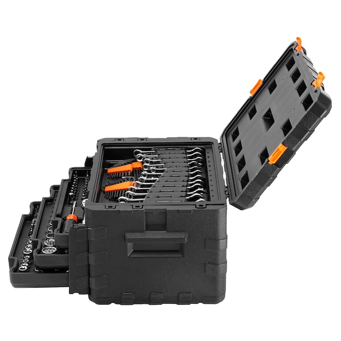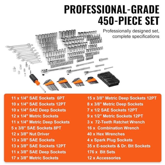 Your toolkit for conquering tasks with confidence and ease!: Our mechanics tool set boasts CR-V chrome vanadium construction, ensuring it’s not just durable but also rust and wear-resistant; It’s a toolbox that’s ready for action, whether you’re fixing things around the house or taking on pro-level repairs; Tackle high torque with confidence, and enjoy the convenience of handy attachments; Don’t just get the job done – get it done right with our ultimate toolkit!; [Package Content] 11 x 1/4″ SAE Sockets 6PT; 10 x 1/4″ SAE Sockets 12PT; 10 x 1/4″ SAE Deep Sockets; 12 x 1/4″ Metric Sockets; 11 x 1/4″ Metric Deep Sockets; 5 x 3/8″ SAE Sockets 8PT; 12 x 3/8″ Nut Driver; 13 x 3/8″ SAE Sockets; 13 x 3/8″ SAE Sockets 12PT; 11 x 3/8″ SAE Deep Sockets; 17 x 3/8″ Metric Sockets; 15 x 3/8″ Metric Deep Sockets 12PT; 8 x 3/8″ Metric Deep Sockets; 7 x 1/2 SAE Sockets 12PT; 9 x 1/2″ Metric Sockets 12PT; 3 x 72-Teeth Ratchet Wrench; 16 x Combination Wrench; 40 x Hex Wrenches; 4 x Spark Plug Sockets; 35 x E-sockets & Dr; Bit Sockets; 176 x Bit Sets; 12 x Accessories
