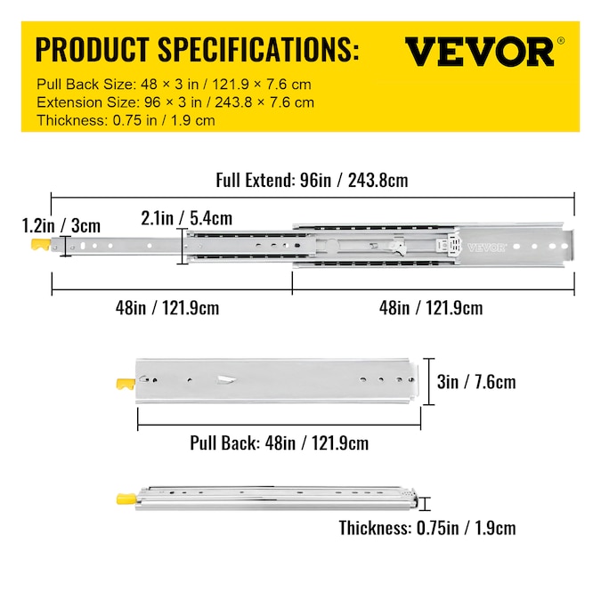 - Specifications: Model: VV-SJTTDGDS-22IN; Material: Cold Rolled Steel; Finish: Zinc Plated; Amount: 1 Pack(2 PCS); Load Capacity: 500 lbs/ 227 kg; Fully Pull-Out Length: 96 in / 243.8 cm; Fold Product Size: 48 x 3 x 0.75 in / 121.9 x 7.6 x 1.9 cm; Inner Size (L x W): 48 x 1.2 in / 121.9 x 3 cm; Middle Size (L x W): 48 x 2.1 in / 121.9 x 5.4 cm; Outer Size (L x W): 48 x 3 in / 121.9 x 7.6 cm