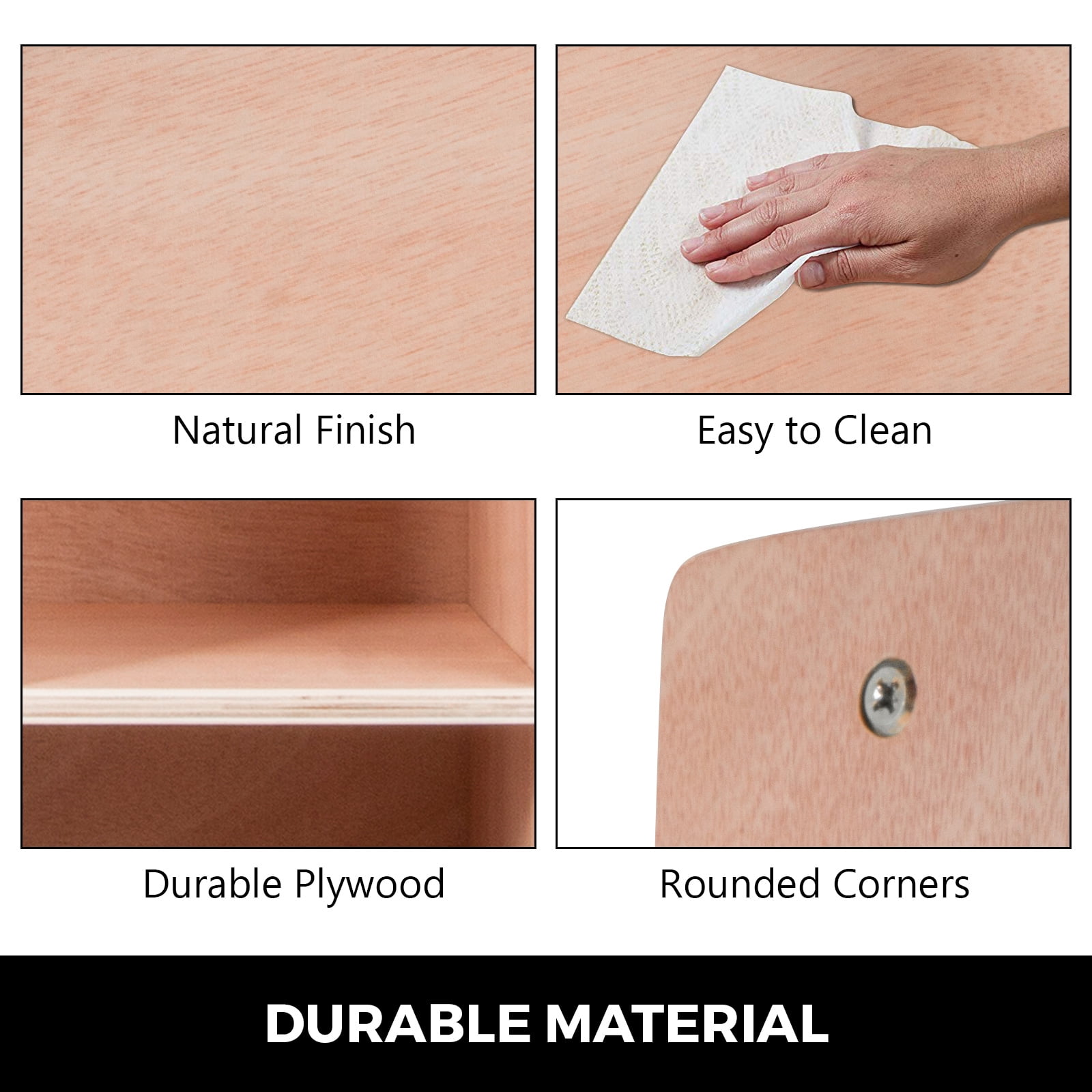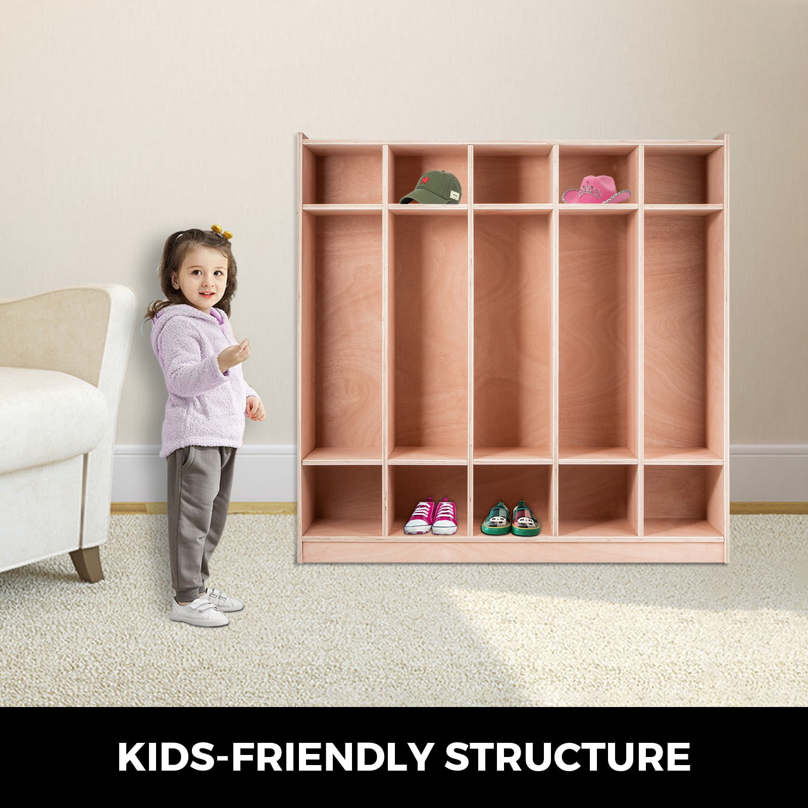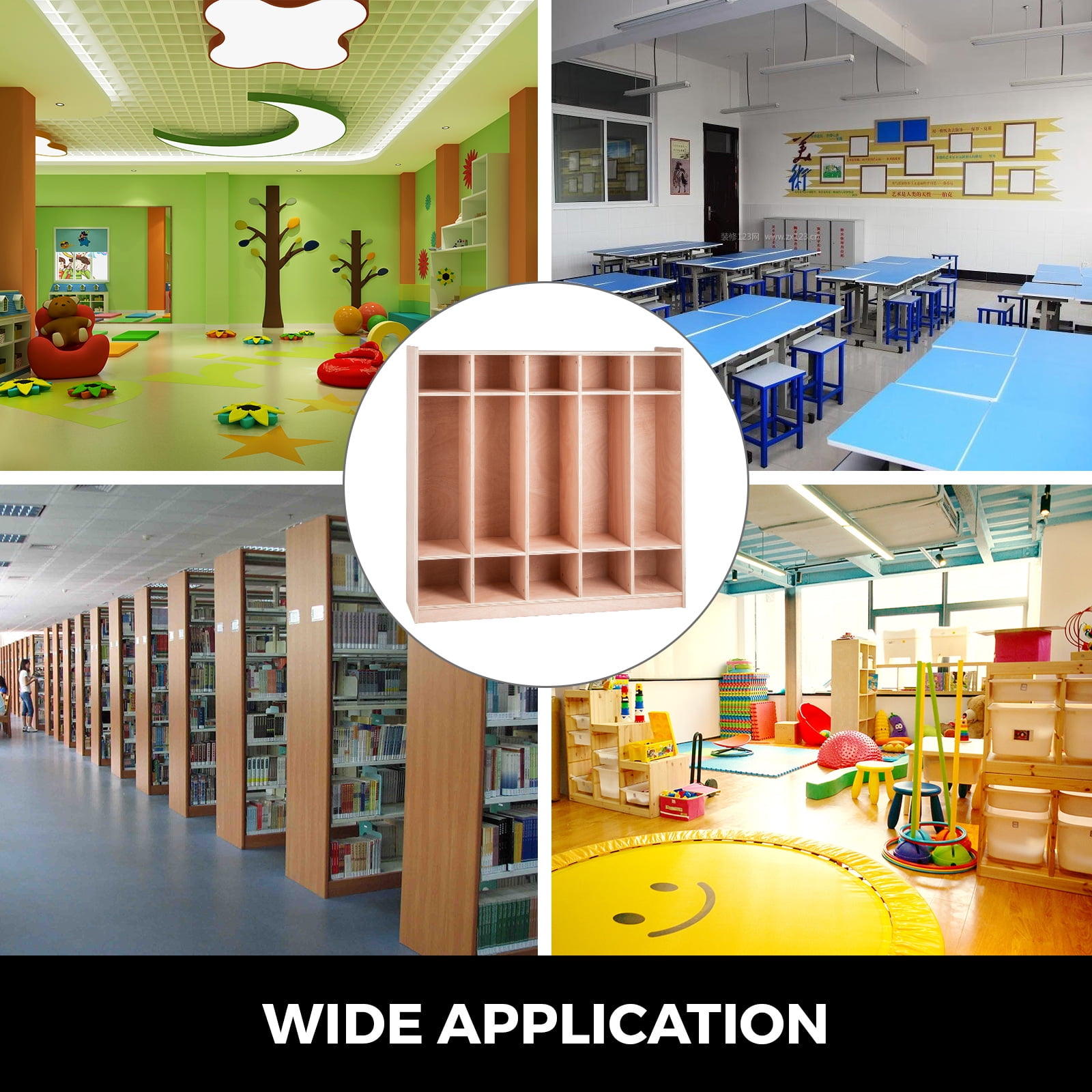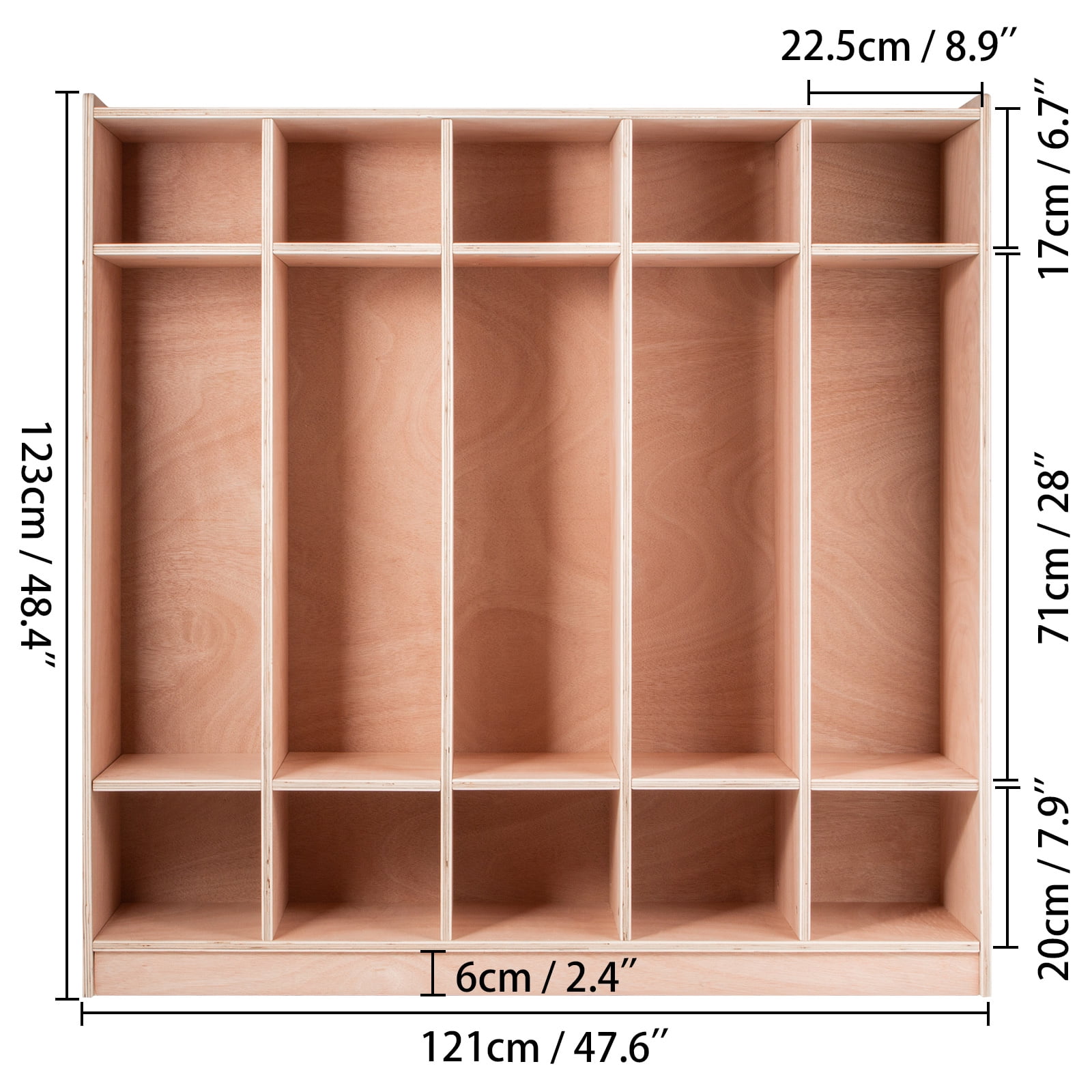 Brand Introduction VEVOR is a leading brand that specializes in equipment and tools. Along with thousands of motivated employees,VEVOR is dedicated to providing our customers with tough equipment & tools at incredibly low prices. Today, VEVOR has occupied markets of more than 200 countries with 10 million plus global members. Why Choose VEVOR? 1.Tough Quality Assurance 2.Incredibly Low Prices 3.Fast & Secure Delivery 4.30-Day Free Returns 5.24/7 Professional Customer Service Product Description Heavy Duty Preschool Cubby Lockers 5-Section The preschool coat locker is made of durable plywood with 5-section storage construction. It has a perfect height for kids and toddlers to keep all of their personal belongings stored safely. The stylish wood locker fits right into classrooms, daycare, offices, or at home. It comes with 5 hooks and two storage bins. All-in-one Storage This multi-functional unit features 5-section storage structure, offering 5 long compartments and 10 cubbies to store coats, shoes, backpacks and other supplies. Keep space organized and neat. Kids-friendly Structure The total dimensions of the coat locker are. A proper height makes it easy for children to easily store and reach their belongings. Recommended age: for children ages 4 years old and up. Durable Material Constructed in environmental friendly birch plywood multilayer, the coat locker features a smooth and cleanable natural finish. Rounded edges for added safety. 15mm thickness for durability. 6cm high base for stability. Extra Storage Space 5 robust coat hooks are used for hanging sweaters, jackets and backpacks in long compartments for plentiful storage options. 2 extra bins for storing small things to keep space neatly organized. Move With Casters At the bottom of the cubby locker, there are 4 durable casters equipped for easy moving. You can effortlessly push the coat locker to any place. Smooth, quite and labor saving on moving. Wide Application The sturdy and durable storage cubby is an excellent choice for a daycare, preschool, or classroom, or even at home, for kids to safely store away their backpacks, coats and other supplies. Specifications Material: Birch Plywood Total Dimensions(L x W x H): 47.8×12.8×48.4in/121.5×32.5x123cm Top Layer Grid Size(L x H): 8.9 x 6.7in/22.5 x 17cm Middle Layer Grid Size(L x H): 8.9 x 28in/22.5 x 71cm Bottom Layer Grid Size(L x H): 8.9 x 7.9in/22.5 x 20cm Bottom Height: 2.4in/ 6cm Box Dimensions(L x W x H): 14.6×9.4×9.4in/37x24x24cm; 10.2×7.5×6.1in/26x19x15.5cm Package Content 1 X Cubby Locker 5 X Hooks 2 X Storage Boxes 1 X Accessory
