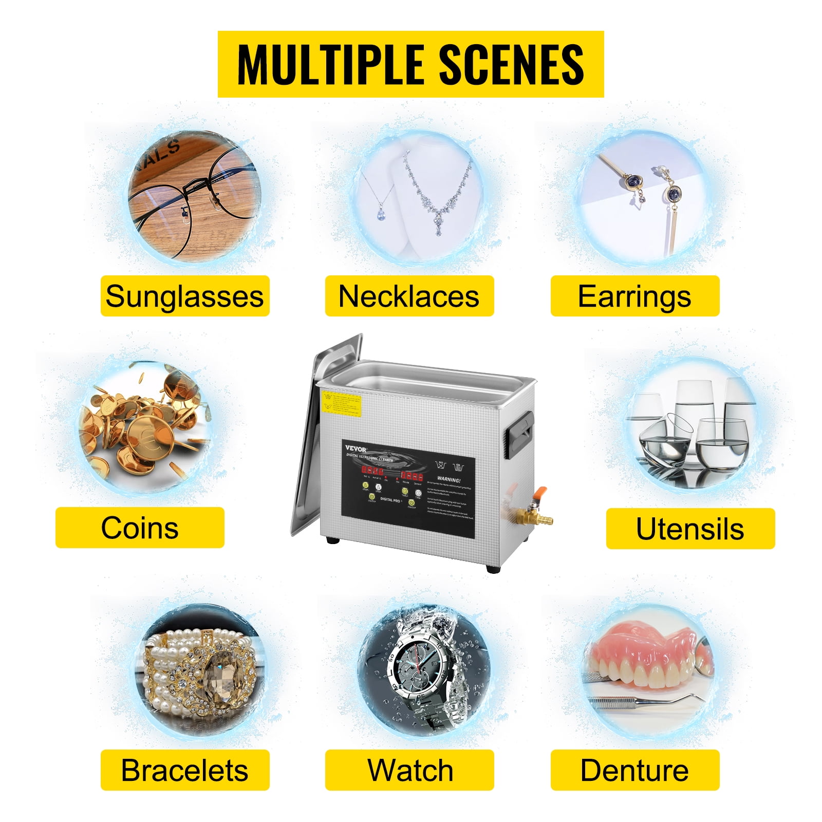 Brand Introduction VEVOR is a leading brand that specializes in equipment and tools. Along with thousands of motivated employees,VEVOR is dedicated to providing our customers with tough equipment & tools at incredibly low prices. Today, VEVOR has occupied markets of more than 200 countries with 10 million plus global members. Why Choose VEVOR? 1.Tough Quality Assurance 2.Incredibly Low Prices 3.Fast & Secure Delivery 4.30-Day Free Returns 5.24/7 Professional Customer Service Product Description 6L Digital Ultrasonic Cleaning Machine 360-degree & Adjustable & Durable Get a professional ultrasonic cleaning at home!!! 40KHZ ultrasonic wave, deeply wash dirt, grime, oil on your valuable’s surface, long hole, crevice and shelter. Give you a brand new & shiny item after fully washed, without damaging them! Deep and Gentle Clean 400W heating power, 2 imported transducers to emit 40KHz ultrasonic wave. Create millions of microscopic cleaning bubbles that powerful remove dirt & grime on surface and gap. Adjustable Time/Temp Clear LED display and press buttons to adjust working time and heating temperature. Time Range: 0-30min. Temperature Range: 0-80℃. Increase the efficiency of cleaning the stubborn stains. Premium Quality Upgrade 304 stainless steel tank, anti-rust and better corrosion & heat-resistance. Integral construction, no water leakage ensured. Longer service time with outer stainless steel case. Complete Accessories Compact size with large 6L tank, adequate to clean items thoroughly at one time. Equip with a water outlet valve to control speed and a 1M water pipe for convenient use. Humanized Details Send with a large cleaning basket and a 2″ jewelry cleaning basket. Able to reduce frictions while washing. Also have a Stainless lid to prevent water splash out. Multiple Scenes Portable ultrasonic cleaning machine, easy to move and storage. Perfect for washing items in different fields: Jewelry, Lab, Circuit Board, Dental Devices, Dishware, Industry etc. Specifications Ultrasonic Frequency: 40KHZ Tank Capacity: 6L Heating Temperature: 0-80℃ Working Time: 0-30 Minutes Heating Power: 400W Cleaning Power: 180W Warranty: 2 Years Package Content 1 x 6L Digital Ultrasonic Leaner 1 x Cleaning Basket 1 x Jewelry Cleaning Basket 1 x User Manual