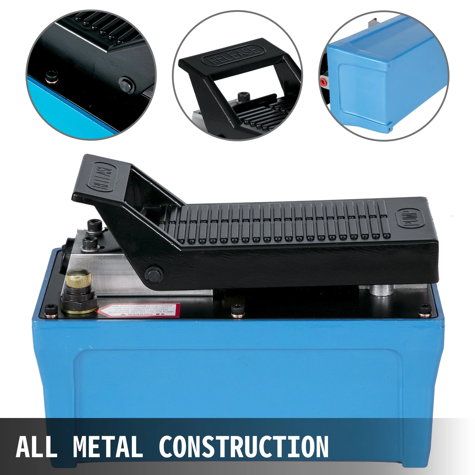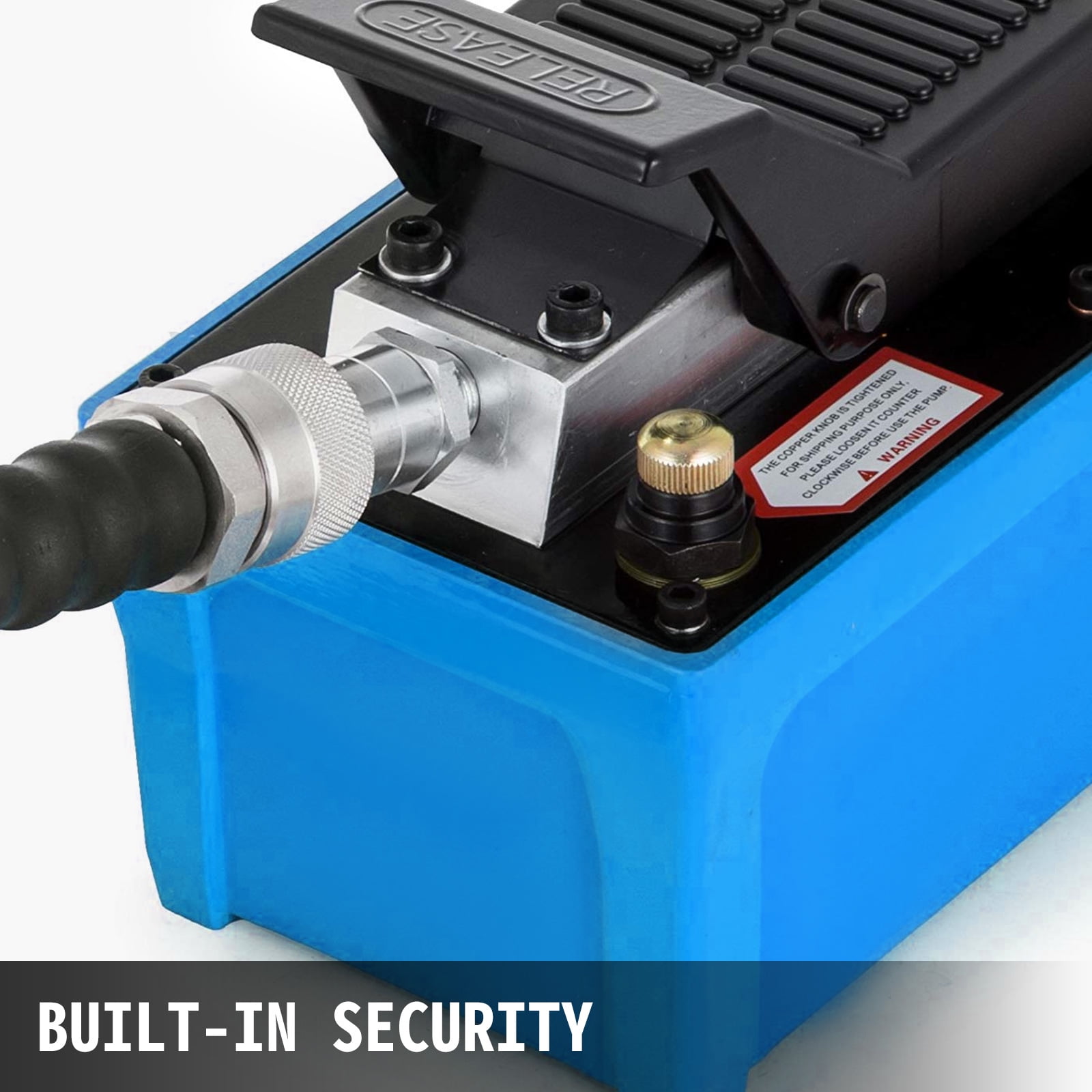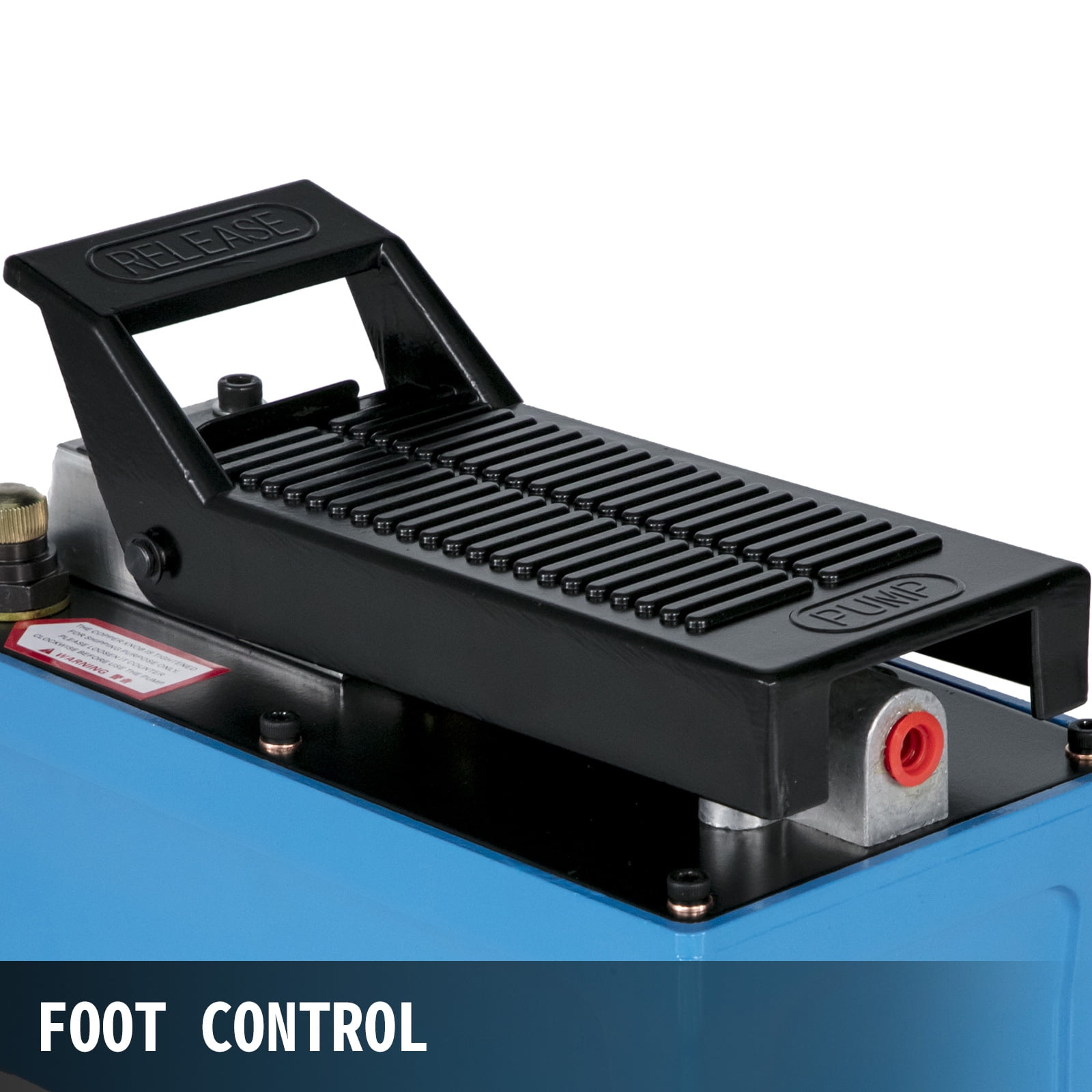 Brand Introduction VEVOR is a leading brand that specializes in equipment and tools. Along with thousands of motivated employees, VEVOR is dedicated to providing our customers with tough equipment & tools at incredibly low prices. Today, VEVOR has occupied markets of more than 200 countries with 10 million plus global members. Why Choose VEVOR? 1.Tough Quality Assurance 2.Incredibly Low Prices 3.Fast & Secure Delivery 4.30-Day Free Returns 5.24/7 Professional Customer Service Product Description10,000 PSI Air Hydraulic Foot Pump This hydraulic foot pump is made of rugged construction parts for long service life. Baked Powder TUFF COAT finish maximizes assembly corrosion resistance and 5ft with 3/8 NPT quick hydraulic coupler with dust cap. This pump is designed to provide hands-free operation for effortlessly pumping and releasing load as needed. It is suitable for heavy machinery rigging and moving, auto repair, oil rigging, machine maintenance, etc. All Metal Construction This hydraulic foot pump adopts durable metal material, which is anti-vibration and anti-deformation. All-metal construction is built to handle tough industrial applications and last with fully reliable components. Foot Control The hydraulic pump uses the high-strength foot pedal with 3 pedal functions: apply pressure, maintain pressure, and release pressure for easy control and operation that is time-saving and labor-saving. Standard 3/8 NPT All threads on all components in the set are standard 3/8 NPT with dust cap, which will not leak oil and have abrasion resistance. Longer service life is provided. Built-In Security 3/8 NPT oil output safely builds to 10,000 pounds and has a built-in safety overload pump saver. Long Lasting Seal This hydraulic pump comes with a high-quality oil pipe to resist high pressure and not easy to be broken with the double protection of embedded steel wires and thickened outer layer. Widely Applicable This air hydraulic foot pump is suitable for heavy machinery rigging and moving, auto repair, oil rigging, machine maintenance, etc. Specifications Type: Air Powered Hydraulic Pump Action: Single acting Control: Foot pedal pump – Release pressure to return fluid Includes Hydraulic Hose: 5 ft with 3/8 NPT – Quick hydraulic coupler with dust cap Flow Rate: 0.85 liters (0.22 gallons) per minute Air Connection: 1/4″ Female NPT Hydraulic Oil Type: AW-46 Oil Capacity: 103 in³ (1.7 liters / 1700 cc), 0.45 gallons Max Input Air Pressure: 120 PSI Max Output Hydraulic Pressure: 10,000 PSI Connector Type: 3/8″ NPT ISO 14540 quick hydraulic coupler with dust cap Weight: 17.72 lbs/8.04 kg Dimensions (L x W x H): 12.2 x 8.26 x 7.4″/31 x 21 x 19 cm Package Content 1 x Blue foot pump 1 x High pressure oil pipe 2 x Quick connector 1 x Air gun connector with air pipe 1 x Manual