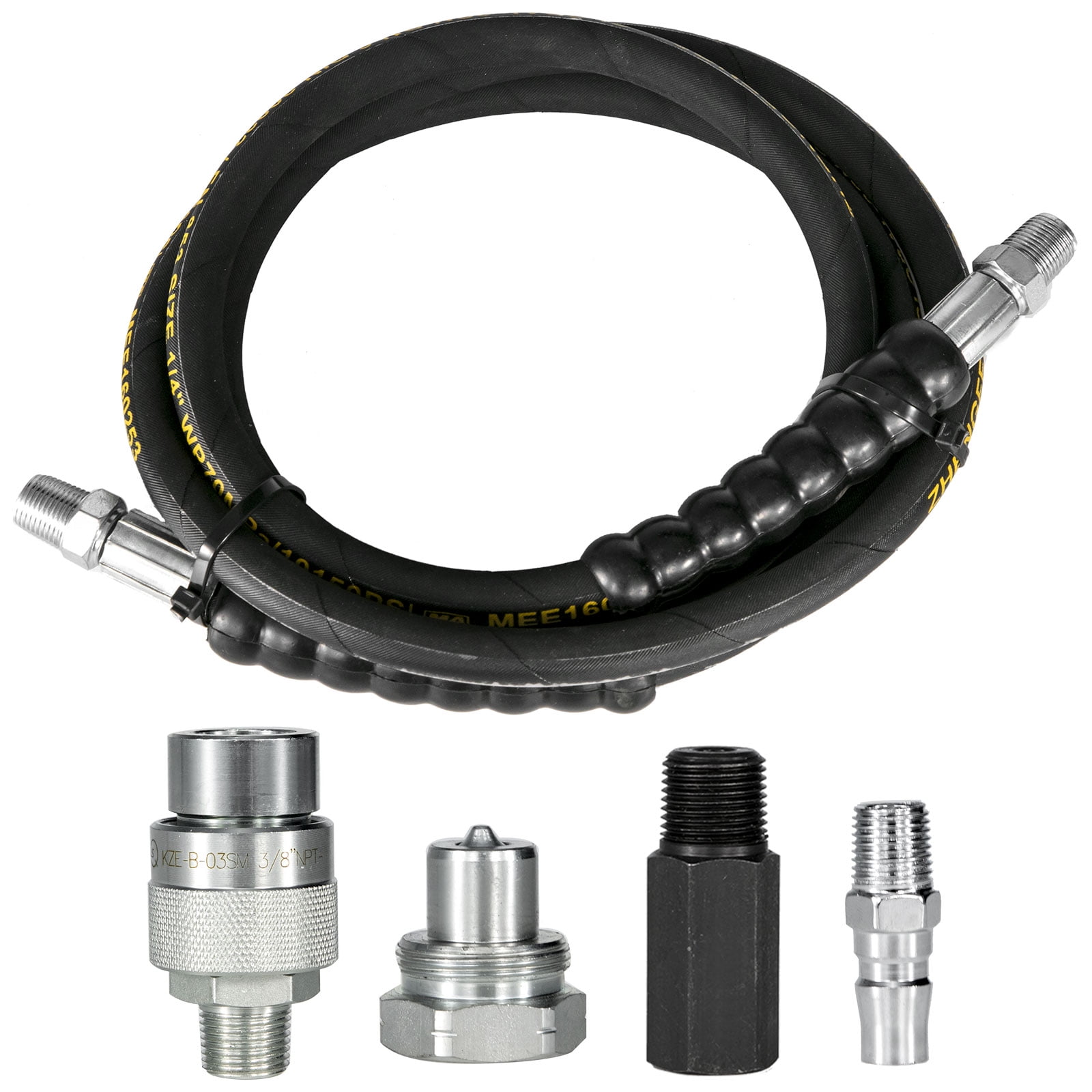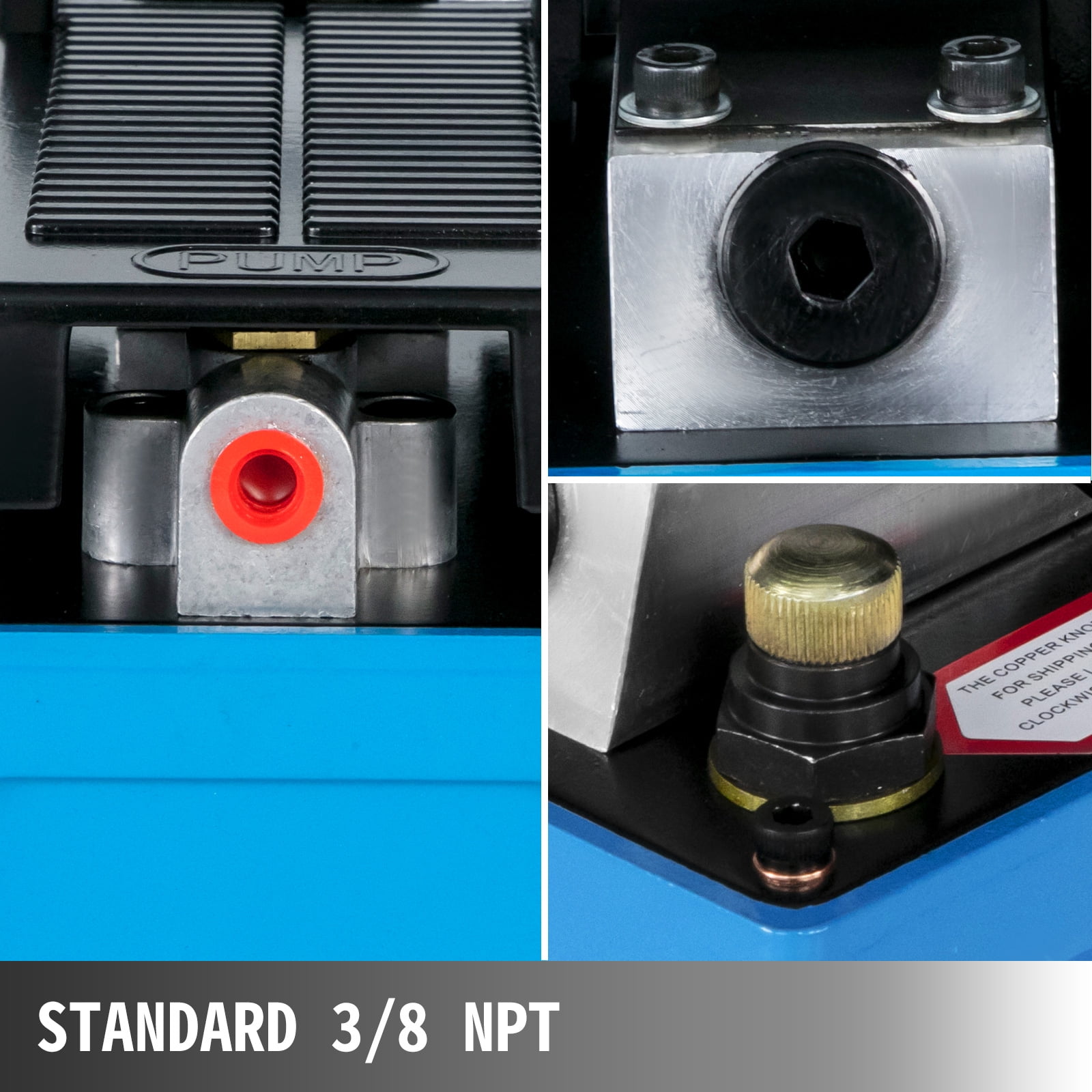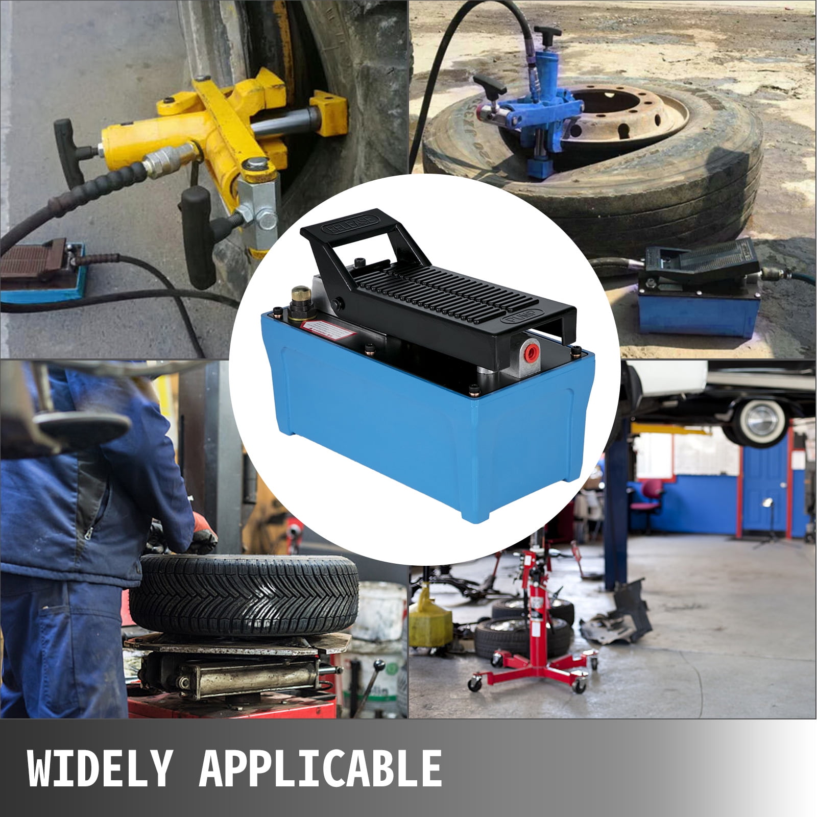 Brand Introduction VEVOR is a leading brand that specializes in equipment and tools. Along with thousands of motivated employees, VEVOR is dedicated to providing our customers with tough equipment & tools at incredibly low prices. Today, VEVOR has occupied markets of more than 200 countries with 10 million plus global members. Why Choose VEVOR? 1.Tough Quality Assurance 2.Incredibly Low Prices 3.Fast & Secure Delivery 4.30-Day Free Returns 5.24/7 Professional Customer Service Product Description10,000 PSI Air Hydraulic Foot Pump This hydraulic foot pump is made of rugged construction parts for long service life. Baked Powder TUFF COAT finish maximizes assembly corrosion resistance and 5ft with 3/8 NPT quick hydraulic coupler with dust cap. This pump is designed to provide hands-free operation for effortlessly pumping and releasing load as needed. It is suitable for heavy machinery rigging and moving, auto repair, oil rigging, machine maintenance, etc. All Metal Construction This hydraulic foot pump adopts durable metal material, which is anti-vibration and anti-deformation. All-metal construction is built to handle tough industrial applications and last with fully reliable components. Foot Control The hydraulic pump uses the high-strength foot pedal with 3 pedal functions: apply pressure, maintain pressure, and release pressure for easy control and operation that is time-saving and labor-saving. Standard 3/8 NPT All threads on all components in the set are standard 3/8 NPT with dust cap, which will not leak oil and have abrasion resistance. Longer service life is provided. Built-In Security 3/8 NPT oil output safely builds to 10,000 pounds and has a built-in safety overload pump saver. Long Lasting Seal This hydraulic pump comes with a high-quality oil pipe to resist high pressure and not easy to be broken with the double protection of embedded steel wires and thickened outer layer. Widely Applicable This air hydraulic foot pump is suitable for heavy machinery rigging and moving, auto repair, oil rigging, machine maintenance, etc. Specifications Type: Air Powered Hydraulic Pump Action: Single acting Control: Foot pedal pump – Release pressure to return fluid Includes Hydraulic Hose: 5 ft with 3/8 NPT – Quick hydraulic coupler with dust cap Flow Rate: 0.85 liters (0.22 gallons) per minute Air Connection: 1/4″ Female NPT Hydraulic Oil Type: AW-46 Oil Capacity: 103 in³ (1.7 liters / 1700 cc), 0.45 gallons Max Input Air Pressure: 120 PSI Max Output Hydraulic Pressure: 10,000 PSI Connector Type: 3/8″ NPT ISO 14540 quick hydraulic coupler with dust cap Weight: 17.72 lbs/8.04 kg Dimensions (L x W x H): 12.2 x 8.26 x 7.4″/31 x 21 x 19 cm Package Content 1 x Blue foot pump 1 x High pressure oil pipe 2 x Quick connector 1 x Air gun connector with air pipe 1 x Manual