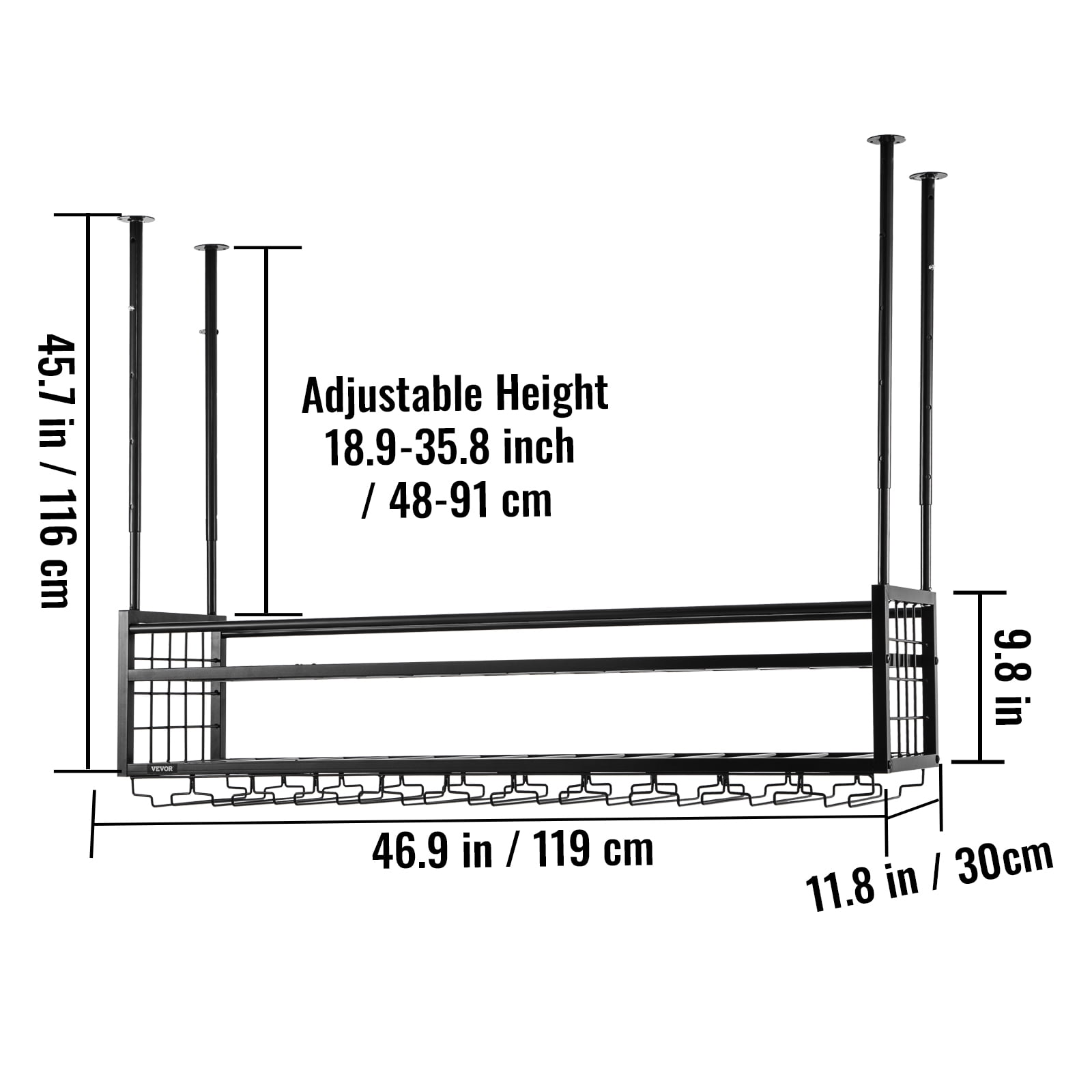 VEVOR Ceiling Wine Glass Rack, 46.9 x 11.8 inch Hanging Wine Glass Rack, 18.9-35.8 inch Height Adjustable Hanging Wine Rack Cabinet, Black Wall-Mounted Wine Glass Rack Perfect for Bar Cafe Kitchen