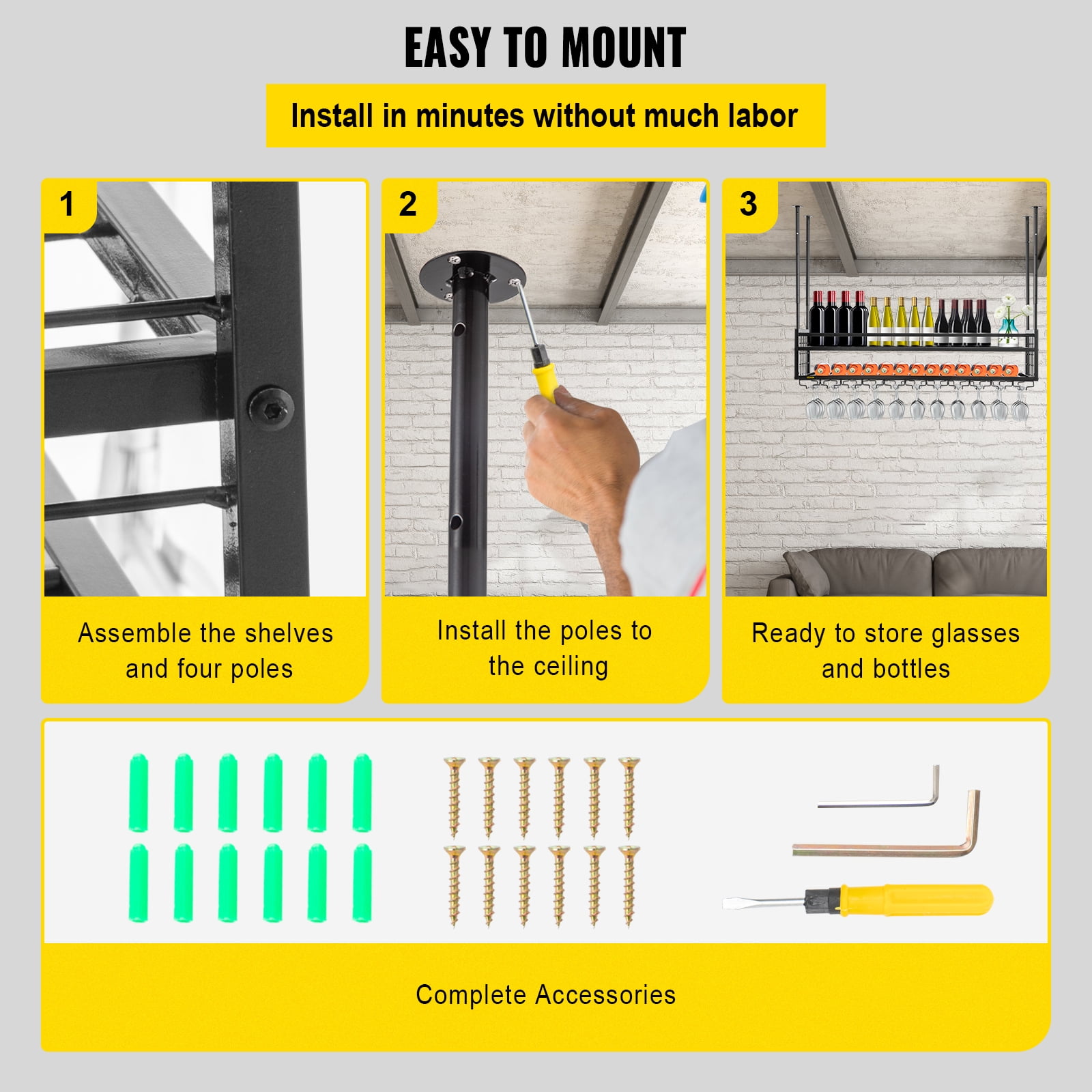 Product Description Celling-mounted Wine Bottle Rack 33 Lbs Load Capacity & Multifunctional Design & Adjustable Poles Extensive Load Capacity This multifunctional wine bottle rack can be used to hang up to 33 glasses on the bottom of the rack and store wines on the upper shelf. The heavy-duty rack can hold a maximum of 33 pounds of items. Besides, the 2 hooks as gifts are suitable for hanging tools like cleaning cloths or bottle openers. Pole-adjusting Design The four poles of our hanging rack are adjustable in height. It’s free to adjust its height from 18.9 to 35.8 inches. With this feature, this rack can fit various sizes of spaces. Universal Goblet Holder The bottom of this rack is well-designed for hanging different kinds of goblets with more than 1.6 inches base diameter, such as wine cup, Bordeaux cup, champagne glass, cocktail glass, etc. Considerate Details Our ceiling wine glass rack adopts an alloy plating process for durable and sturdy use. The security guardrail is equipped for keeping the wine bottles steadily placed on the rack. And the ceiling-mounted design with upside-down goblets is convenient for putting and taking bottles and glasses in the front and rear directions. Easy to Assemble With the simplified installing process and complete accessories, you can assemble this rack effortlessly. Install the poles and shelves with screws, install the whole rack to the ceiling through pre-drilled holes, and then it’s ready to use. Wide Application Our wine glass rack is perfect for both home and commercial use. You can apply it to your own house, bar, hotel, restaurant, and commercial cellar for an excellent wine-drinking time with your family and friends. Specifications Model: XR-gy002 Adjustable Height: 18.9-35.8 inch / 48-91 cm Load Capacity: 33 lbs / 15 kg Glass Hanger Width: 1.6 inch / 4 cm Shelf Dimensions: 46.9 x 11.8 x 9.8 inch / 119 x 30 x 25 cm Product Dimensions: 46.9 x 11.8 x 45.7 inch / 119 x 30 x 116 cm Product Weight: 20.9 lbs / 9.5 kg Package Content 1 x Wine Glass Rack 1 x A Set of Screws 1 x Screwdriver 1 x Hexagon Wrench 2 x Hooks