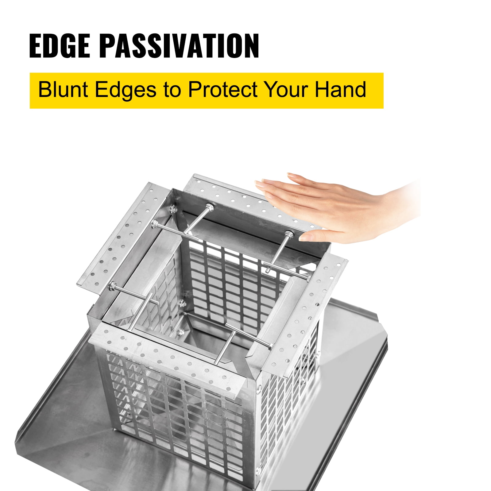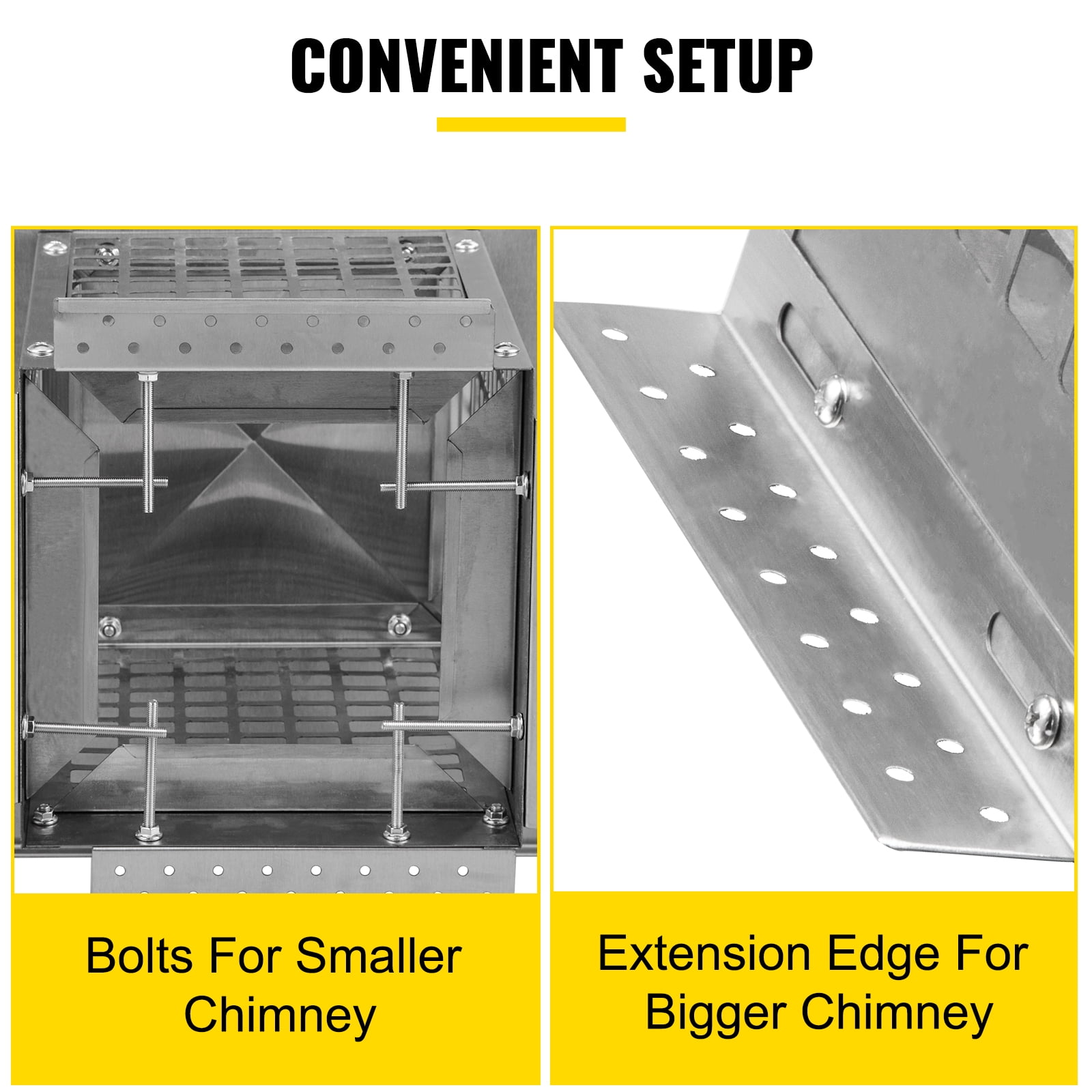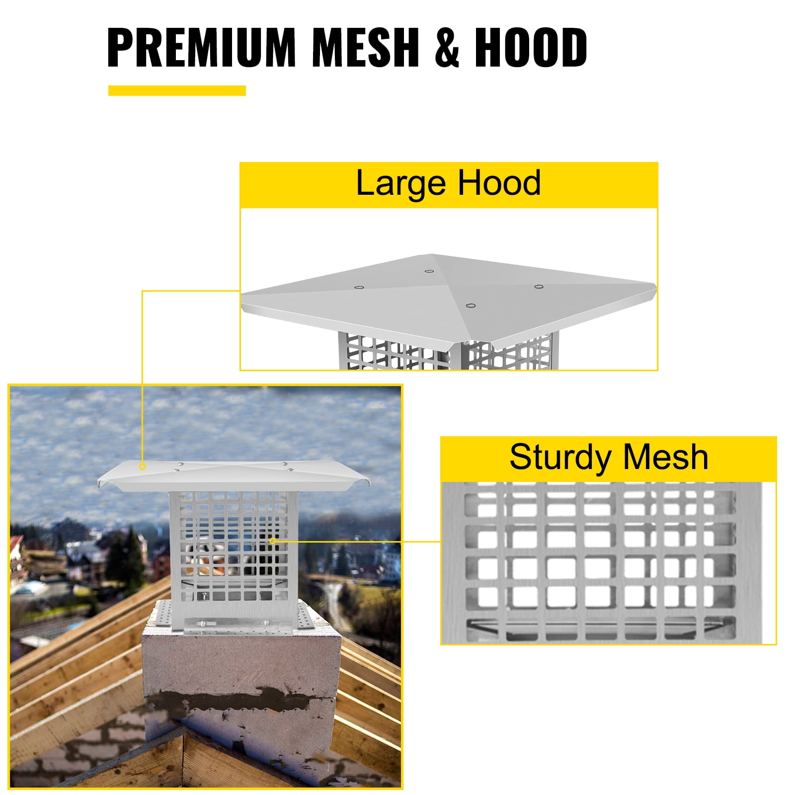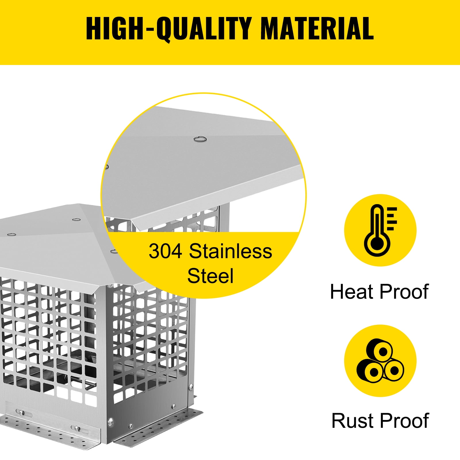 Brand Introduction VEVOR is a leading brand that specializes in equipment and tools. Along with thousands of motivated employees,VEVOR is dedicated to providing our customers with tough equipment & tools at incredibly low prices. Today, VEVOR has occupied markets of more than 200 countries with 10 million plus global members. Why Choose VEVOR? 1.Tough Quality Assurance 2.Incredibly Low Prices 3.Fast & Secure Delivery 4.30-Day Free Returns 5.24/7 Professional Customer Service Product Description 8 x 8 in Chimney Cap This chimney cover cap is made of 304 stainless steel to ensure stability and durability. Two kinds of installation methods can fit more chimneys of different dimensions. It is easy and quick to assemble with bolts and nuts. The large hood and solid meshes promote the protection of your flue to keep out rain, snow, debris, leaves, and animals. Convenient Setup There are two installation methods to fit different dimensions of chimneys. Suitable for 6.5 x 6.5 in to 10.4 x 10.4 in. High Quality Material Our chimney cover cap adopts high-quality 304 stainless steel, rust- and weatherproof. Durable material ensures long-term protection for your chimney. Premium Mesh & Hood The large hood on the top of our flue cap provides effective protection to keep out rain and snow. Sturdy meshes with suitable sizes ensure ventilation. Edge Passivation To improve the protectiveness, we passivated our chimney cap’s edges, so there is no need to worry about hurt during installation. Easy Assembly This chimney cover comes with whole accessories such as bolts and nuts, easy to assemble. And the pre-drilled holes also convenient for your assembly. Multiple Protection The flue cap is ideal for keeping out rain, snow, leaves, debris, birds, animals, and other things that may affect the flue, providing multiple protection for your chimney. Specifications Fit Chimney Size: 6.5 x 6.5 in/16.5 x 16.5 cm to 10.4 x 10.4 in/26.5 x 26.5 cm Product Size: 15.7 x 15.7 x 9.8 in/40 x 40 x 25 cm Bottom Size: 8 x 8 in/20 x 20 cm Material: 304 Stainless Steel Color: Silver Weight: 4.4 lbs/2 kg PackageContent 1 x Chimney