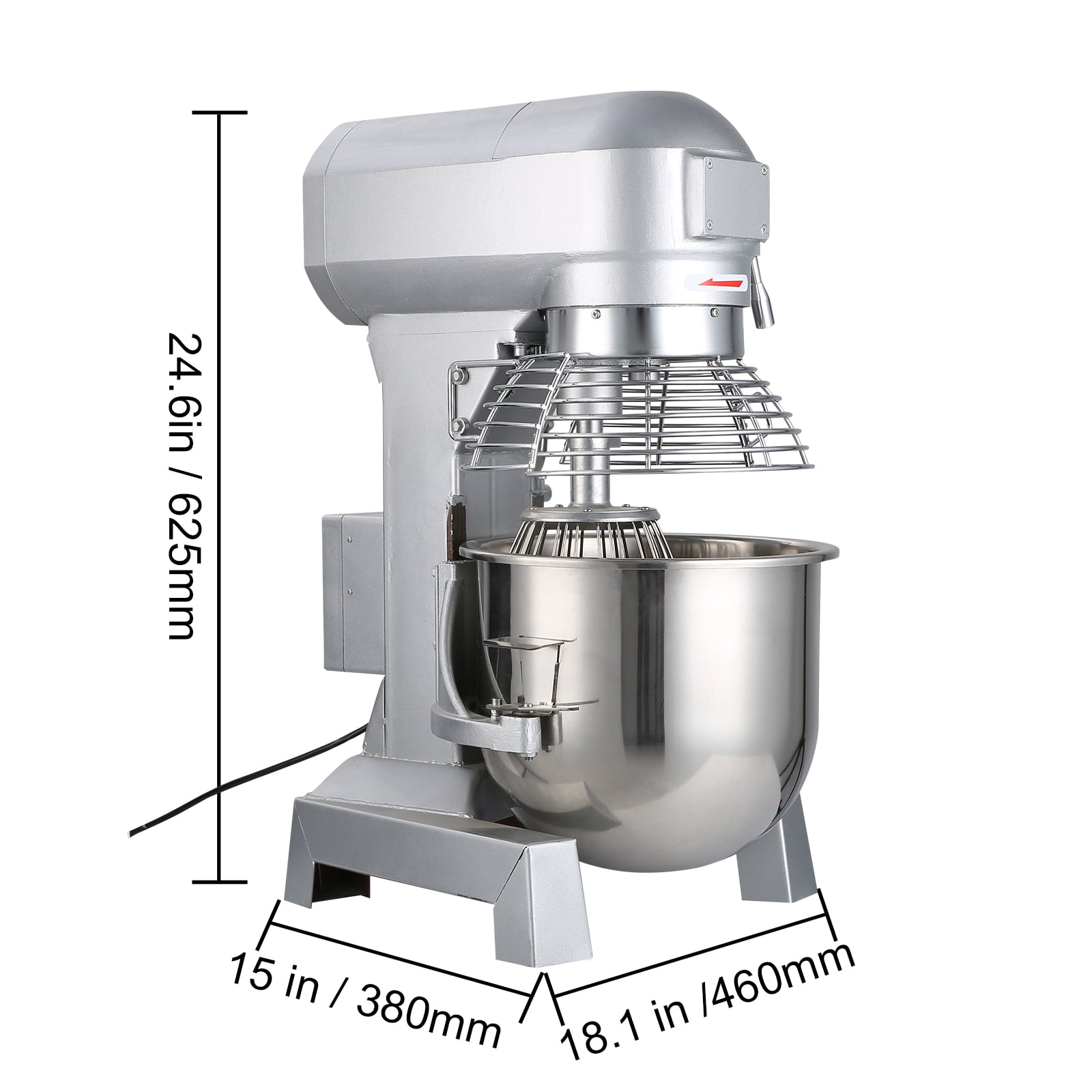 Brand Introduction VEVOR is a leading brand that specializes in equipment and tools. Along with thousands of motivated employees,VEVOR is dedicated to providing our customers with tough equipment & tools at incredibly low prices. Today, VEVOR has occupied markets of more than 200 countries with 10 million plus global members. Why Choose VEVOR? 1.Tough Quality Assurance 2.Incredibly Low Prices 3.Fast & Secure Delivery 4.30-Day Free Returns 5.24/7 Professional Customer Service Product Description 10L Commercial Dough Mixer This food dough mixer blender is widely used to mix flours, dough, stuffing, beat eggs, etc. With its powerful 450W motor and sturdy stainless steel bowl, this mixer is a robust, durable, and reliable machine. Three speeds are available. You can choose a different speed to meet different mixing needs and obtain satisfying results. All its food-touching parts are up to sanitary standards. It is an ideal tool for home, bakeries, restaurants, and canteens. The machine can only be used when the barrel is raised to the highest point, and the protective cover is tightened. The red emergency stop button needs to be released. At the beginning of the blending, you should use the minimum speed. Advanced Material This industrial mixer is made of all stainless steel, and it is better than the normal products in the market. The commercial mixer comes with a 10L (2.6 US Gal / 2.2 UK Gal) food-grade 304 stainless steel bowl. 3 Mixing Attachments Each mixer industrial is equipped with three replaceable attachments, including a spiral dough hook, a flat beater, and a wire whip. Perfectly designed for you to do all types of food mixing. 3 Adjustable Speeds The 450-watt high-performance motor ensures stable operation, providing three adjustable mixing speeds (110 RPM/178 RPM/390 RPM) to help you efficiently mix your food. Stainless Steel Safety Guard A stainless steel bowl safety guard attached to the mixer will prevent the ingredients from splashing or prevent large items from falling into the bowl while showing you the inside condition. Controllable Bowl Height This dough mixer adopts a turning wheel to lower or raise the bowl to achieve a satisfactory height, can perfectly adapt to various mixing requirements. The rubber feet of the machine can increase stability. Multifunctional Mixer Perfect for all your food mixing needs, including creaming, mixing, beating, whipping, and kneading. Incredibly suitable for making pizza dough, bread dough, cake batter, etc. Specifications Power: 450W Bowl Volume: 2.6 US Gal (10L) Mixing Speed: 110 r/min, 178 r/min, 390 r/min Max. Kneading Capacity: 2.2 lbs (1 kg) Unit Dimensions: 17.7″x14.4″x23.9″ (450x366x606 mm) Package Content 1 x Commercial Mixer