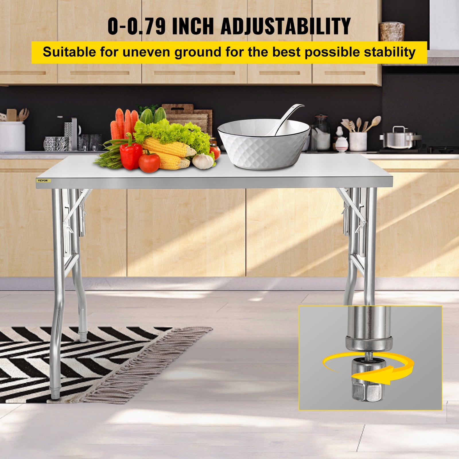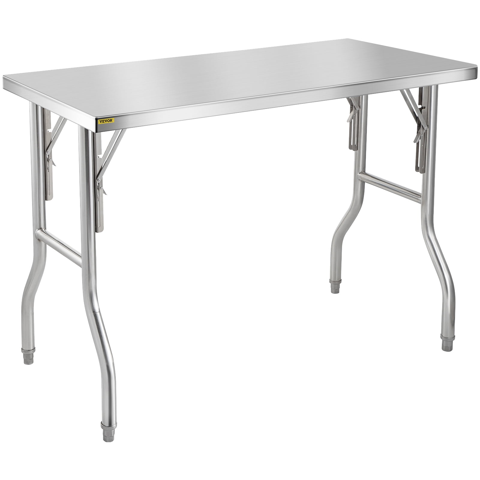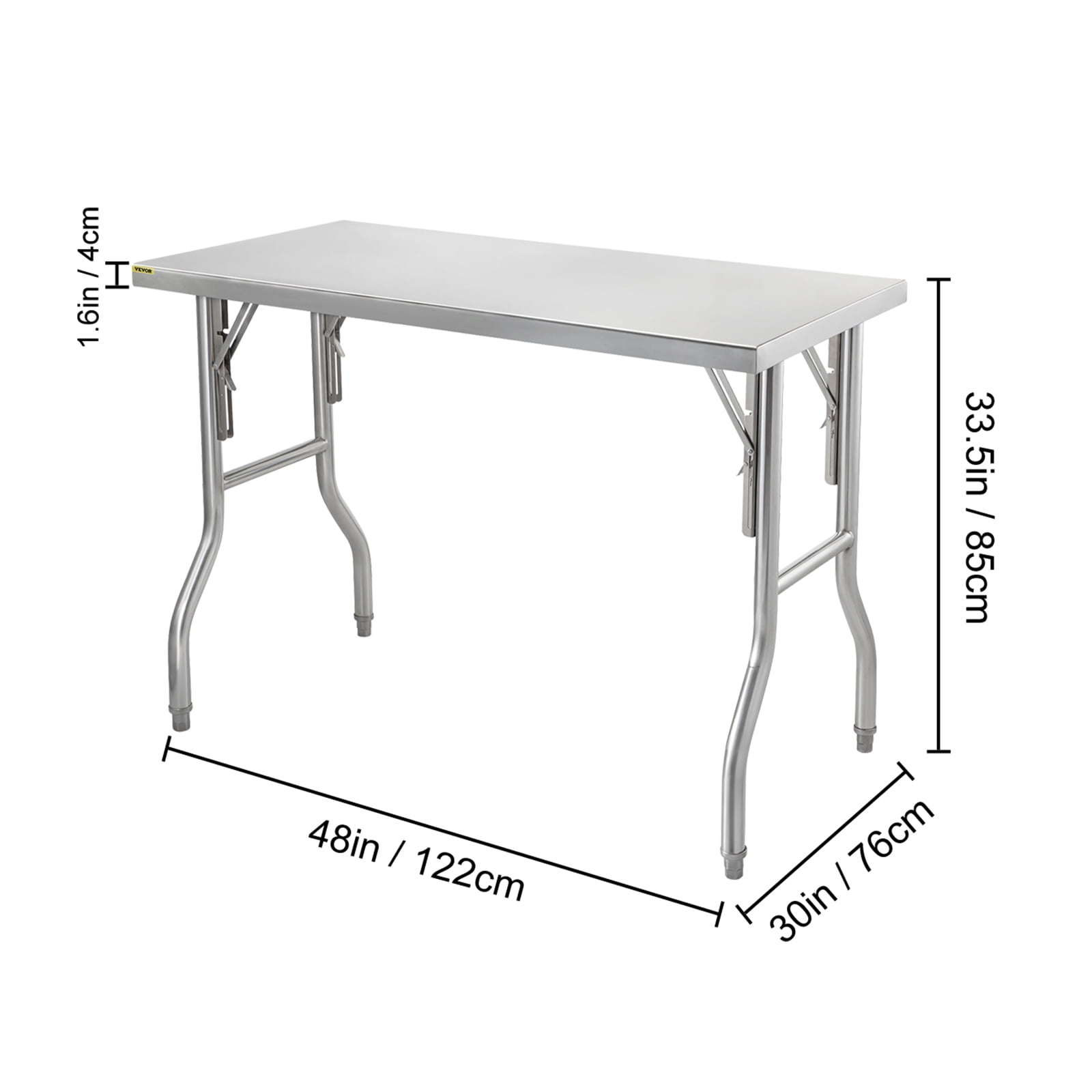 Brand Introduction VEVOR is a leading brand that specializes in equipment and tools. Along with thousands of motivated employees,VEVOR is dedicated to providing our customers with tough equipment & tools at incredibly low prices. Today, VEVOR has occupied markets of more than 200 countries with 10 million plus global members. Why Choose VEVOR? 1.Tough Quality Assurance 2.Incredibly Low Prices 3.Fast & Secure Delivery 4.30-Day Free Returns 5.24/7 Professional Customer Service Product Description Stainless Steel Folding Table We offer you a heavy-duty folding commercial prep table. It is made of 21 gauge stainless steel for top-grade rigidity, rust-less and durable for long-time use. Thickened folding hinge and table legs provide extreme stability that will hold up to 661 lbs. Large weight capacity and foldable design will basically meet your needs in daily life—a perfect portable workspace solution for a variety of diverse applications. Stainless Steel Material Adopted durable stainless steel for aesthetic appearance, anti-corrosion, and rust resistance; The table legs and folding hinges of our table all thickened to ensure stable standing. 48 x 30 Inch Storage Space This kitchen table is of superior strength that can provide a loading capacity of 661 lbs without shaking; With a 48 x 30 inch large space, you can have enough storage room for your kitchenware. Foldable For Easy Storage Four legs of this stainless steel butcher table can be quickly folded into your rear trunk, easily transported to remote sites, also convenient to store when not use. Smooth Curved Edges Rounded front and back edges help avoid cutting anyone, protect your hands from scratches and nicks, designed for more comfortable usage. Four Adjustable Feet You can easily rotate our folding camping table’s feet to change the height to adapt to the uneven ground. They won’t scratch your floor due to the unique design. Wide Usage A great addition to your home or office when extra dining space is needed; Widely used in use in the family cookout, garage, commercial kitchen, restaurant, coffee shop, school, laboratory, warehouse, workshop, etc. Specifications Material: Stainless Steel Color: Silver Load Capacity: 300 kg/ 661 lbs Tabletop Dimension: 1220 x 762 mm/48 x 30 inch Table Legs Diameter: 38 mm/ 1.5 inch Folding Dimension: 1220 x 762 x 150 mm/48 x 30 x 5.9 inch Item Dimension: 1220 x 762 x 850 mm/48 x 30 x 33.5 inch Item Weight: 15 kg/ 33 lbs Package Content 1 x Stainless Steel Folding Table