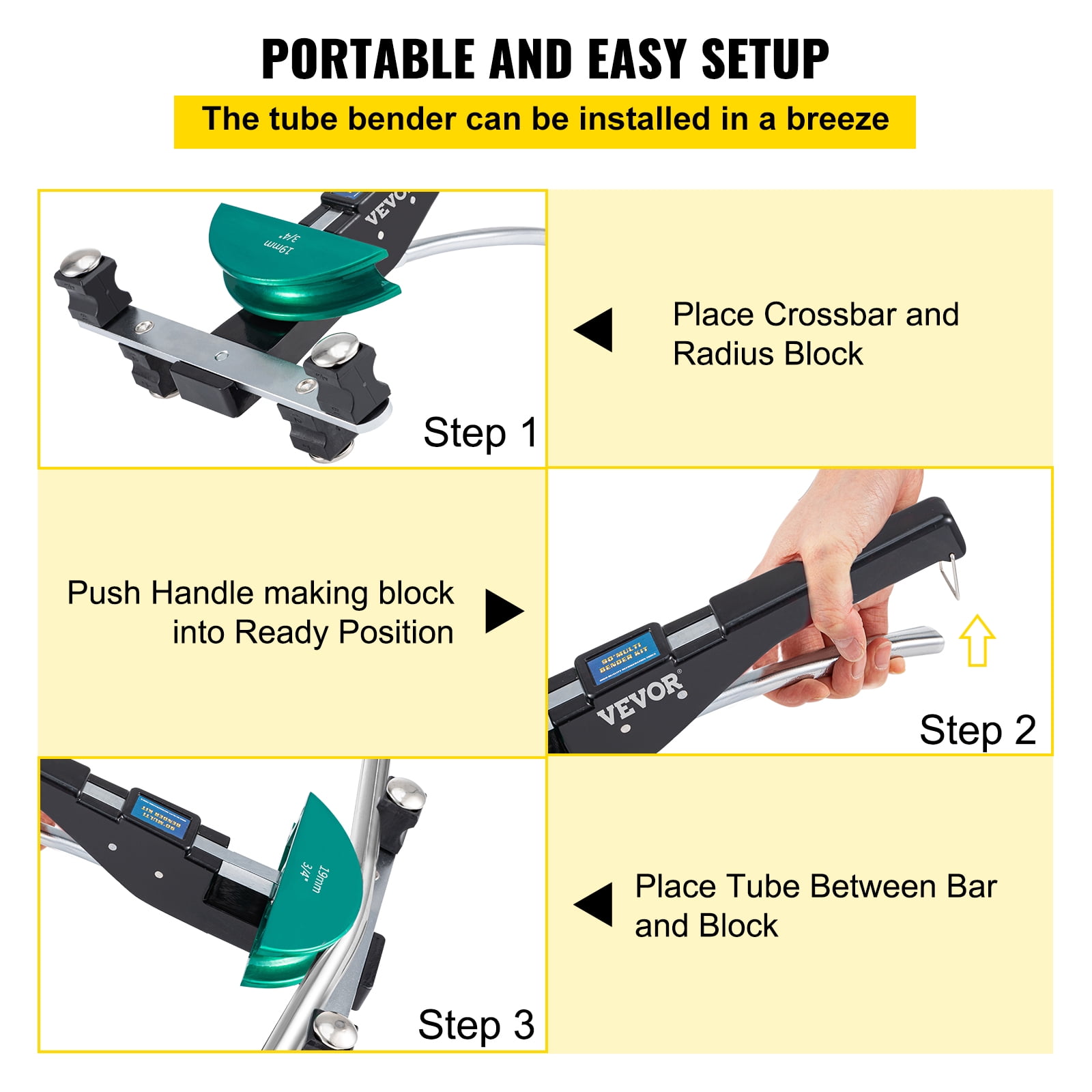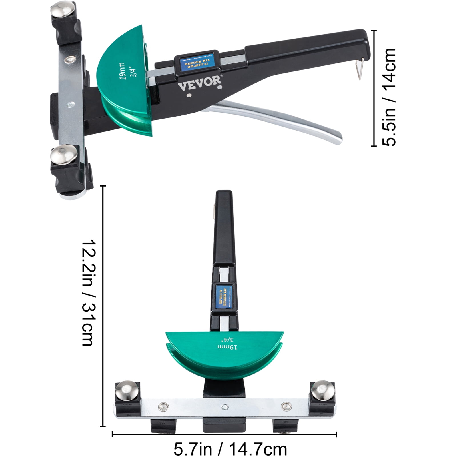 Brand Introduction VEVOR is a leading brand that specializes in equipment and tools. Along with thousands of motivated employees,VEVOR is dedicated to providing our customers with tough equipment & tools at incredibly low prices. Today, VEVOR has occupied markets of more than 200 countries with 10 million plus global members. Why Choose VEVOR? 1.Tough Quality Assurance 2.Incredibly Low Prices 3.Fast & Secure Delivery 4.30-Day Free Returns 5.24/7 Professional Customer Service Product Description 1/4″-7/8″ Tube Bender Kit 7 Colorful Dies & 1/4″-7/8″ & Reverse Bending 90 Degrees Bending Angle The pipe bender can easily bend copper, aluminum, and thin-walled steel tube to 90 degrees. And our product features both forward and reverse bending. A different direction depends on your need. 7 Tube Bender Heads The sizes of 7 tube bending dies are 1/4″, 5/16″, 3/8″, 1/2″, 5/8″, 3/4″, 7/8″. And various dies will meet your precious bending. Different colors of dies represent different sizes, making you find what you need at a glance. High-Quality Pipe Bender The ratcheting tube bender is made of superior aluminum alloy, featuring rust-proof. In addition, it is sturdy and durable. Ergonomic Design The compact bender kit with an ergonomic handle is easy to use and energy-saving. It is suitable for one-handed operation and long work hours without tiredness. Installation Without Effort The installation of reverse tubing bender: first place crossbar and radius block, then push handle making block into the ready position, finally, place tube between bar and block. Various Usage Pipe bender is widely used for sanitary and heating installations, floor heating, refrigeration and air-conditioning, hydraulic systems. It is better for copper, aluminum, and thin-walled steel tubing, etc. Specifications Model: CT-999RF Material: Aluminum Alloy Dies Size: 1/4″, 5/16″, 3/8″, 1/2″, 5/8″, 3/4″, 7/8″ (8/6/10/12/16/19/22 mm) Max. Bending Angle: 90° Max. Bending Force: 10 KN Package Content 1 x Tube Bender 2 x Fixed Supports 7 x Tube Bender Heads 1 x Carrying Box 1 x Cutter 1 x Deburrer