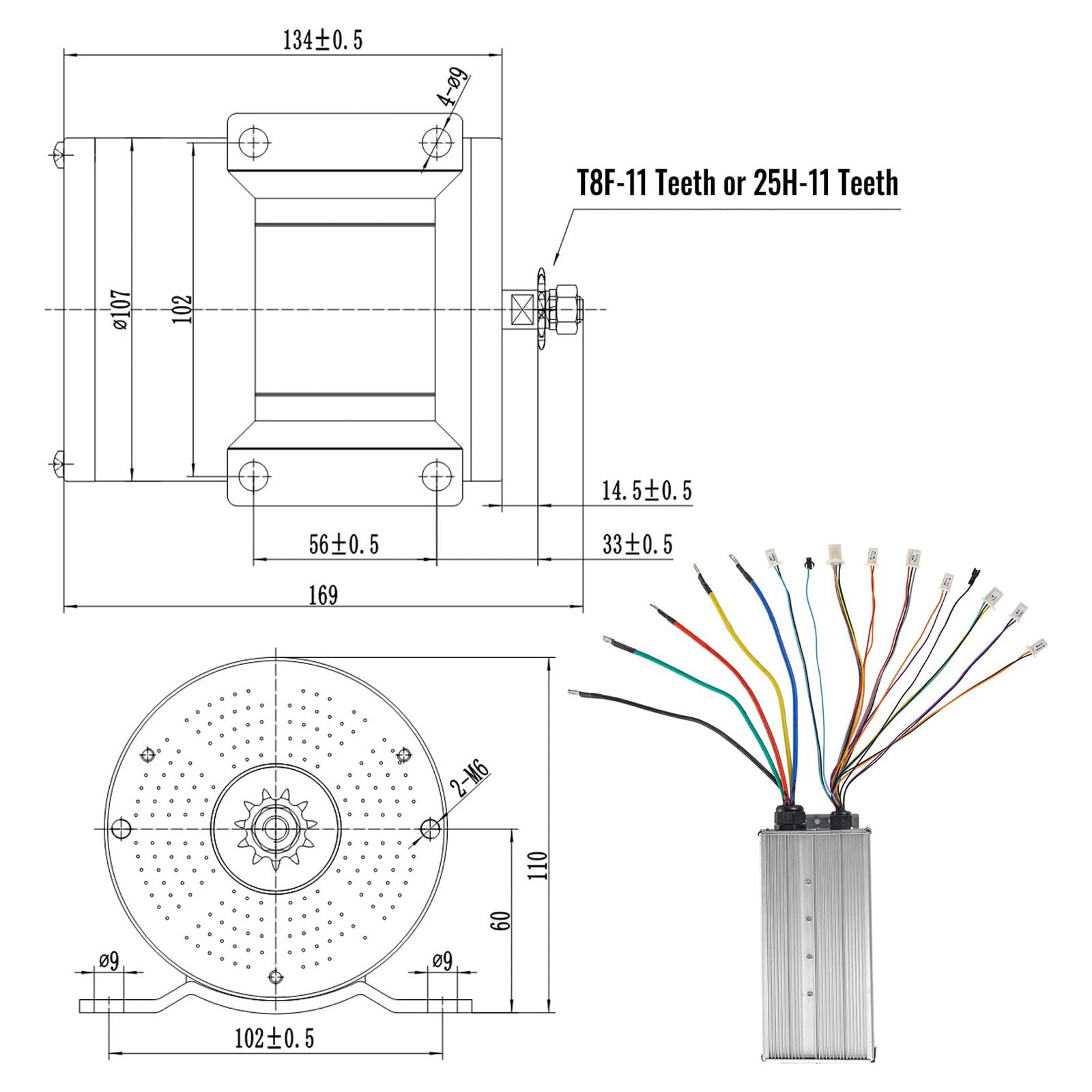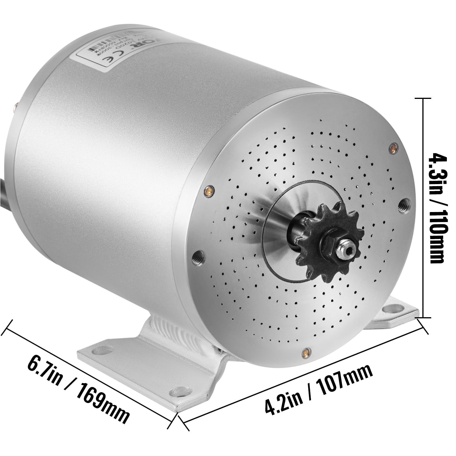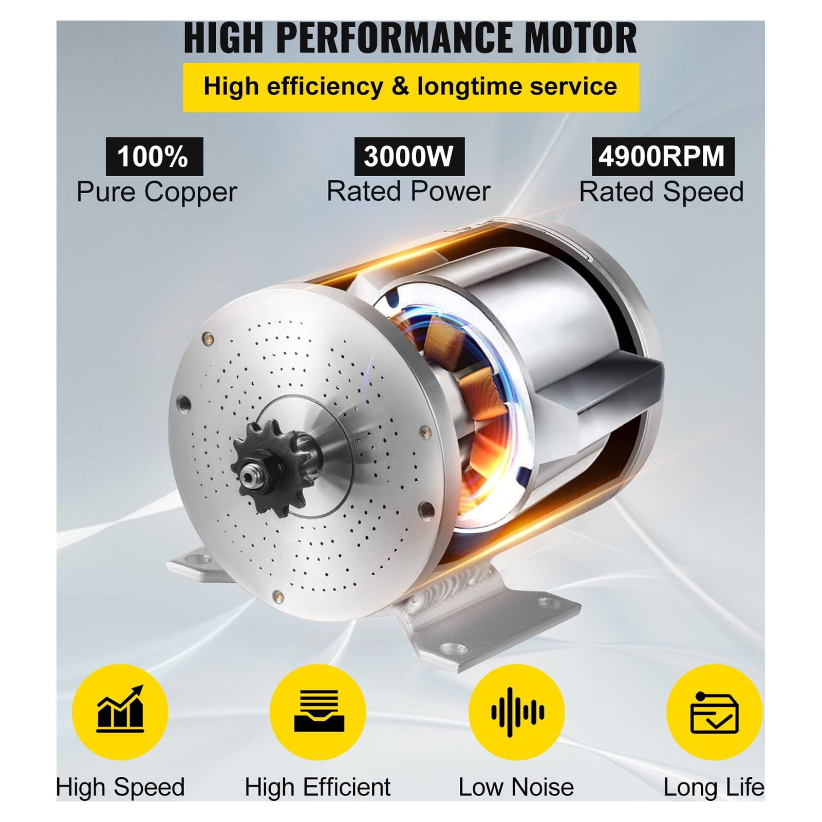 Brand Introduction VEVOR is a leading brand that specializes in equipment and tools. Along with thousands of motivated employees,VEVOR is dedicated to providing our customers with tough equipment & tools at incredibly low prices. Today, VEVOR has occupied markets of more than 200 countries with 10 million plus global members. Product Description 72V 3000W 4900RPM Brushless DC Motor Kit This brushless electric motor is built with a 100% copper core for low noise operation and high working efficiency. It features an aluminum alloy shell and complete accessories kit to help you fix the motor and making a safe operation. It is ideal for go karts, Electric Scooters, E-bike, ATV, motorized bicycle, etc. Pure Copper Coils The motor for the pool pump features a 100% pure copper core for high conductivity, high-temperature resistance, low noise, and saves energy for a long time. 4900 RPM High Speed This brushless electric motor kit runs at 3000W, the rated speed is 4900RPM, and the maximum speed is 6500 RPM. Thus, it is able to provide fast speed and powerful motion for your machines. Durable Aluminum Alloy Shell The electric motor brushless is made of aluminum alloy material, which is able to resist oxidation, compression, vibration, and deformation. In addition, it is lightweight enough to carry and process with ease. Dual-Direction Design You can switch the rotation in either the clockwise or counterclockwise direction by reversing the go kart electric motor’s power wires, which is easy to adjust. Convenient Speed Control Speed controller allows you to control the speed effortlessly. The complete set of a brushless motor, speed controller, throttle grip, and other necessary components facilitate you to operate the machine. Wide Application It is ideal for Electric Scooters, Motorcycle, Ebike Bicycles, Motorcycle, E Tricycle, Mid Drive Motor Kit, Complete Sets, DIY Engine Systems, Cycling Parts, Mini Electric Motorcycles, DIY Engine Kit, etc. Specifications Model: MY1020D Input Voltage: 72V DC Output Power: 3000W Rated Current: ≤ 43A Rated Speed: 4900 RPM Maximum Speed: 6500 RPM Sprocket: T8F-11 Teeth Horsepower: 4.07 HP Rated Torque: 849.67 oz.in / 6 N.m Maximum Current: 65A No-load Current: ≤ 4.0A Peak Efficiency:≥ 85% Working Temperature: < 120 °C / 248 ℉ Motor Net Weight: 10.36 lbs / 4.7 kg Motor Mount Bracket Size: 2.2 x 4'' / 56 × 102 mm Motor Dimensions(L x W x H): 6.7 x 4.2 x 4.3'' / 169 × 107 × 110 mm Controller Model: BY24WF01-B Controller Current: 65A Controller Phase Degree: 120° Controller Conversion Efficiency: ≥ 85% Controller Under Voltage Protection Voltage: 62V PackageContent 1 x 73V 3000W Motor 1 x Controller 1 x Multifunctional Throttle Grip 1 x Ignition Key 1 x T8F-54t Tooth 1 x T8F11 Chain 1 x Set of Mounting Screws