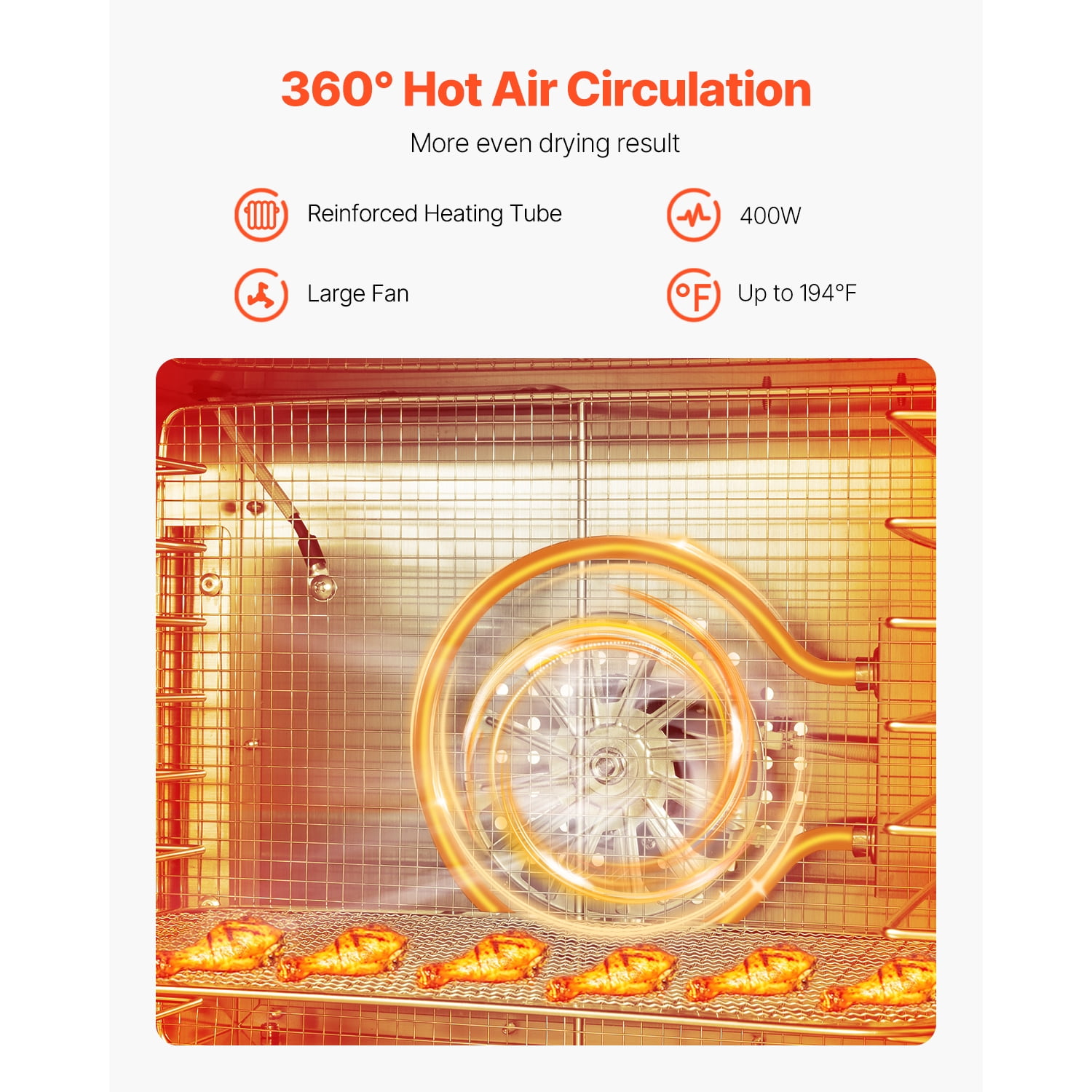 STAINLESS STEEL MATERIAL- This food dehydrator’s body and food trays are all made of excellent stainless steel. The dehydrator features sturdy, anti-rust, scratch-proof, and easy to clean. The product has FDA, ROHS, and CE certifications to ensure its remarkable quality. SIX TRAYS LARGE CAPACITY- There are six food trays and one drip tray in this food dehydrator machine. With an 11.22 x 8.66” large capacity of 8 trays, you can dehydrate different foods together, such as fruits, vegetables, flower tea, and meat. The nutrition stays, and the flavor increased. DIGITAL SCREEN CONTROLLER- The jerky dehydrator has a LED touch board with a timer function to set time from 30mins to 24 hours. You can adjust the temperature from 30-90 ℃/86-194 ℉. The 400W power built-in dehydrator fan system makes our food dehydrator more efficient. It has a good heat dissipation ability and can accelerate the whole dehydration process. CONSIDERABLE DETAILS- On the top of the dehydrators for food, there is a firm handle for you to carry and move the machine effortlessly and conveniently. Simultaneously, four rubber and plastic feet are added to the bottom to avoid scratch to the table and machine. You can find a high-temperature resistance plastic handle and a one-piece buckle on the front of the dehydrators for food and jerky. It connects the machine body and the door and keeps you from being scalded.