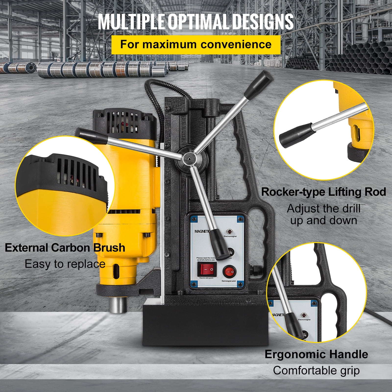 Brand Introduction VEVOR is a leading brand that specializes in equipment and tools. Along with thousands of motivated employees, VEVOR is dedicated to providing our customers with tough equipment & tools at incredibly low prices. Today, VEVOR has occupied markets of more than 200 countries with 10 million plus global members. Why Choose VEVOR? 1.Tough Quality Assurance 2.Incredibly Low Prices 3.Fast & Secure Delivery 4.30-Day Free Returns 5.24/7 Professional Customer Service Product DescriptionJ1Z-23 Magnetic Drill Press This class leading drill has been designed and engineered specifically for speed and total precision. With strong magnetic adhesion 13500N, optimized rotation speed (550RPM), it is an essential tool when performing heavy-duty industrial and steel fabrication work. Electromagnet Base Strong electromagnet base for side suction and back suction. Stable at work, to ensure both your efficiency and safety. Double Dovetail Guide Rail Aluminum alloy guide rail, which can not only add the rigidity to the machine, but also be able to adjust the height of the motor according to the demand. Rocker Lever Rocker-type lifting rod with anti-slip rubber sleeve on its surface saves time and effort and it is also easy to operate. Comfortable Grip The grip is designed to be ergonomic. This comfortable handle offer easy handling and easy carrying. Efficient Cooling System It has cyclone style air intake cooling system, grid air inlet that ensure efficient cooling for you. Wide Application Suitable for steel structure, shipbuilding, bridge engineering, wind power generation, drilling rig, electric power construction, railway manufacturing and other fields. Specifications Model: J1Z-23 Rated Voltage: 110V,50Hz Rated Output: 1200W Rated Speed: 550 r/min Maximum Recommended Drill Size: 1-23mm Tool Holder: MT2 More Taper Maximum Travel: 210mm Magnetic Adhesion: 13500N Magnetic Base Size: 200 x 105 x 65mm Package Content 1x J1Z-23 Magnetic Drill 1x Traditional Chuck 1x User’s Manual