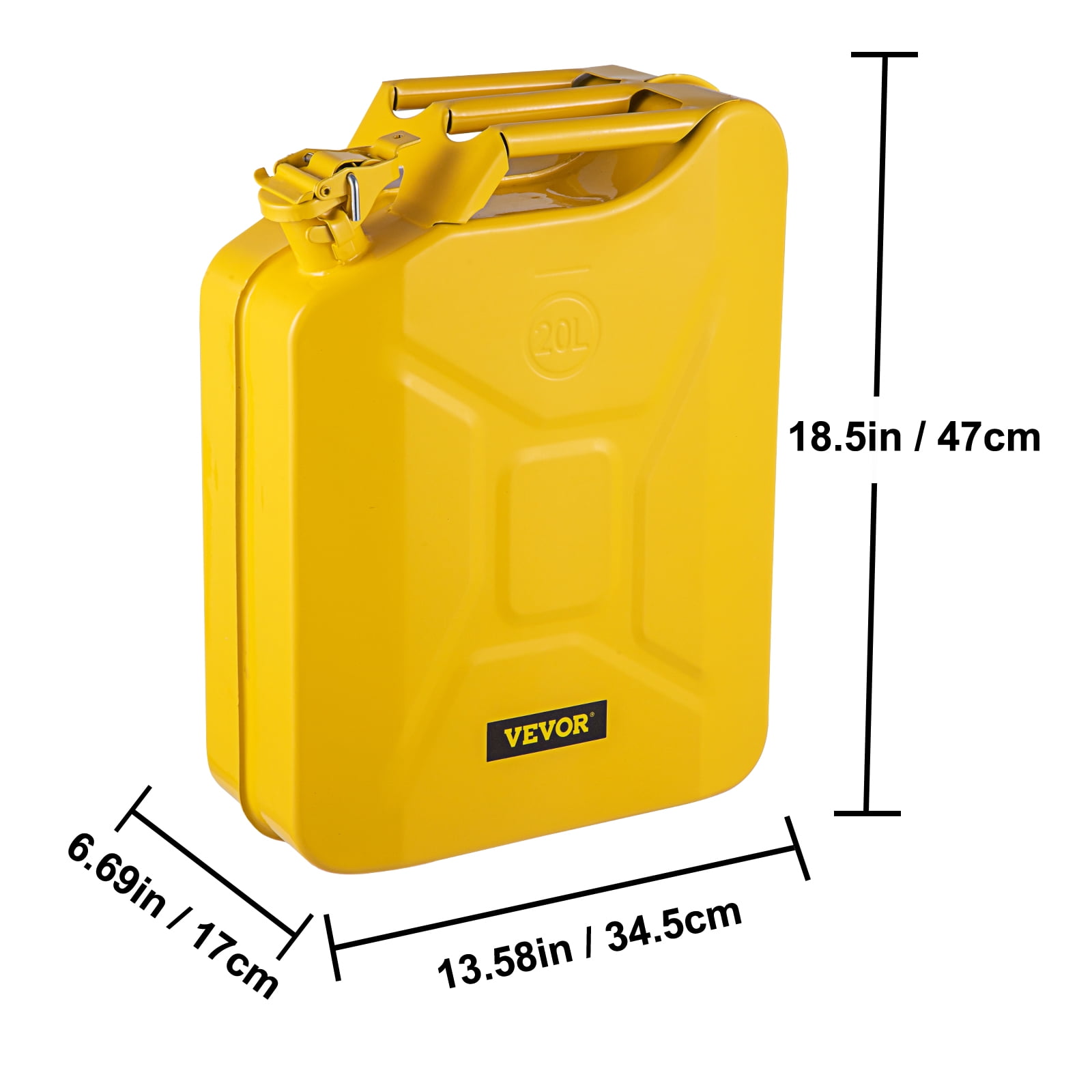 Brand Introduction VEVOR is a leading brand that specializes in equipment and tools. Along with thousands of motivated employees,VEVOR is dedicated to providing our customers with tough equipment & tools at incredibly low prices. Today, VEVOR has occupied markets of more than 200 countries with 10 million plus global members. Why Choose VEVOR? 1.Tough Quality Assurance 2.Incredibly Low Prices 3.Fast & Secure Delivery 4.30-Day Free Returns 5.24/7 Professional Customer Service Product Description Jerry Fuel Can 20L & Yellow & With Flexible Spout 5.3 Gal Jerry Can With a 5.3 gal / 20L large capacity, our jerry can is capable of storing sufficient reserve fuel for you to reach your final destination. Put the oil tank in your vehicle, and stop worrying about your fuel gauge while on long road trips. Superb-quality Steel Can Plastic fuel tanks are fragile and can be easily pierced or broken accidentally, thus leaving the oil out in the open. So we abandoned cheap plastic and adopted heavy-duty rustproof steel for the main structure to ensure much safer & longer use. Airtight Sealing Lock The oil mouth of our jerry can is sealed tightly by a unique cap that prevents air from escaping; further secured by a locking pin that prevents unwanted opening. When you are in need, just manually remove the pin, and open the cap easily. Improved Flexible Spout We provide an additional spout that allows gasoline to be poured smoothly inside the tank and prevents spilling. Use our jerry can to refuel your vehicle quickly and continue your unforgettable trip. Easy Carrying & Storage The size of the fuel can is 13.6″ x 6.7″ x 18.5″ (L x W x H), and this flat cuboid shape won’t take much space. The three handles make it effortless to carry and allow two people to lift for refueling. Wide Application Given its top-quality material and large capacity, this steel fuel tank can be used to store gasoline, diesel oil, water, and many other kinds of liquid. It is a perfect reserve fuel can for you to put in your vehicle and fill up anytime, anywhere. Specifications Model: 1X20LYELLOW Style: Military Material: 0.8 mm Cold-rolled Steel Capacity: 5.3 US Gallons / 20 L Color: Yellow Quantity: 1 Weight: 9.83 lbs / 4.46 kg Spout Length: 11.8 in / 300 mm Spout Diameter: 0.79 in / 20 mm Package Content 1 x 20L Yellow Jerry Can 1 x Flexible Spout