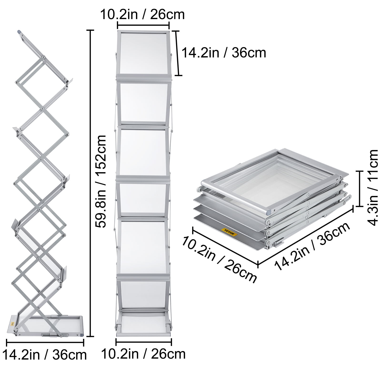Brand Introduction VEVOR is a leading brand that specializes in equipment and tools. Along with thousands of motivated employees,VEVOR is dedicated to providing our customers with tough equipment & tools at incredibly low prices. Today, VEVOR has occupied markets of more than 200 countries with 10 million plus global members. Why Choose VEVOR? 1.Tough Quality Assurance 2.Incredibly Low Prices 3.Fast & Secure Delivery 4.30-Day Free Returns 5.24/7 Professional Customer Service Product Description 6 Pockets Literature Rack A4 Paper Size & Foldable Design & Simple Operation 6 Pockets Literature Rack Pocket length: 10.2″/26 cm; Pocket width: 14.2″/36 cm. This catalog literature display can hold and display multiple A4 paper size brochures and magazines because of its 4.4 lbs/2 kg load-bearing. Set up in Minutes The literature catalog holder could be folded or unfolded in seconds with the pop-up design. No tools are required. Push it up and slide the locking tab in the right place, then it will display magazines stably. Humanized Design The 6 pockets double-sided magazine brochure rack could perfectly display magazines, brochures, or other advertising materials, about A4 paper size 8.46 x 12.2 inches. Premium Material The catalog holder stand is constructed of a solid aluminum alloy frame and PC board. 0.98″/ 2.5cm baffle board also protects the magazines from falling. Each pocket’s load-bearing is up to 4.4 lbs/2 kg, enough to hold many brochures. Portable Design The magazine rack brochure matches the oxford bag. You can fold the 13.2 lbs/6 kg rack into the oxford carrying bag for convenient storage and travel. Wide Application The practical literature racks are trendy and widely be used in exhibitions, trade shows, reception areas, libraries, tourist information centers, offices, etc. Specifications Model: TE-13Z Frame Material: Aluminum Alloy Pocket Material: PC Boards Color: Silver Pocket Size: 10.2″ x 14.2″/26 x 36 cm Product Size: 10.2″ x 14.2 “x 59.8″/26 x 36 x 152 cm Foldable Size: 10.2″ x 14.2” x 4.3″/26 x 36 x 11 cm Weight: 13.2 lbs/6 kg Load Bearing: 4.4 lbs/2 kg Package Content 1 x Literature Rack 1 x Oxford Bag 1 x Manual
