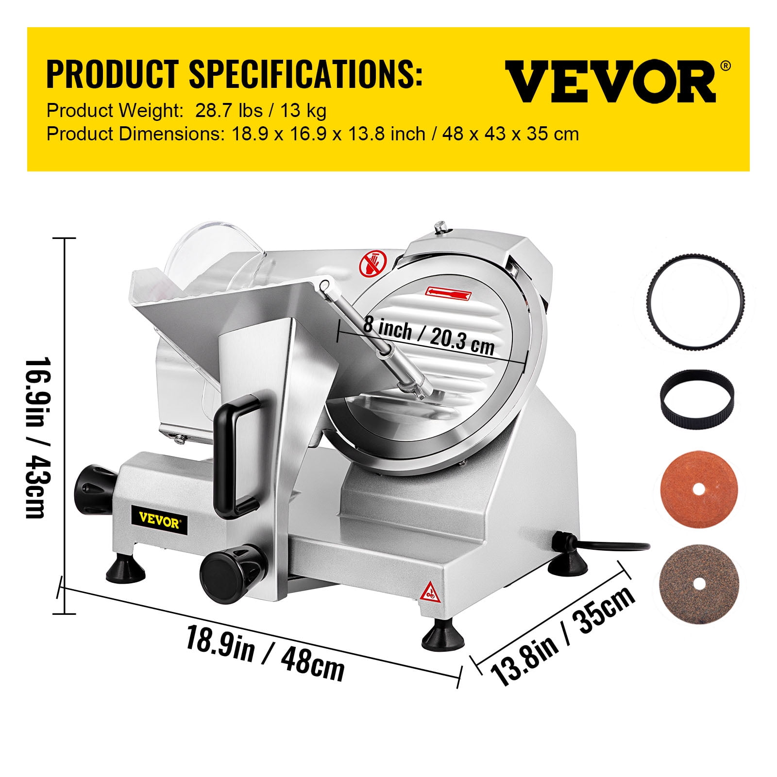 Product Description 8-inch Blade Electric Meat Slicer Our meat slicer is equipped with a high-efficiency 200W motor and 350-400 rpm slicing speed, allowing you to slice your favorite ingredients instantly. Whether it’s meats, cheeses, bread, or vegetables, it saves you valuable food preparation time. High Slice Yield Our meat slicer machine adopts a strong motor with 200-watt input power, bringing the blade with 350-400RPM rotating speed. It saves you a lot of time and energy. Thickness Adjustable Knob It is designed with an adjustable thickness knob, providing you with complete control over your product’s thickness, from 0 to 12 mm/0-0.47 inch. Premium Material The body is made of cast aluminum, and the 8-inch diameter blade is built with 45 # carbon steel for corrosion and rust-proof. The sharp edge of the blade allows quick meat slicing. The groove cutting surface effectively keeps the meat from remaining on the blade. Detachable Design The blade and the security baffle are easily detachable by unscrewing the knobs or screws. With this design, you can clean these components separately and effortlessly. Considerate Details The hidden grindstones are convenient for you to sharpen the blade. The security shield can avoid unforeseen accidents. The food pusher is equipped for firmly keeping the slicing food on the plate. The waterproof on/off switch is easy-operating. The skidproof rubber feet are designed for stable use. Versatile Use Perfect for slicing various foods such as meat, deli, cheese, roast beef, turkey breast, vegetables, fruits, etc. Suitable for both home and commercial use. Specifications Item Model Number: JK-220A Power: 200W Slicing Speed: 350-400 rpm Noise: < 60dB Main Material: Aluminum Alloy ADC12 Blade Material: 45 # Carbon Steel Thickness Adjustment: 0-12mm/0-0.47 inch Product Weight: 14.3kg/31.5 lbs Product Dimensions: 410 x 350 x 340 mm/16.1 x 13.8 x 13.4 in Package Content 1 x Meat Slicer Machine 1 x User Manual