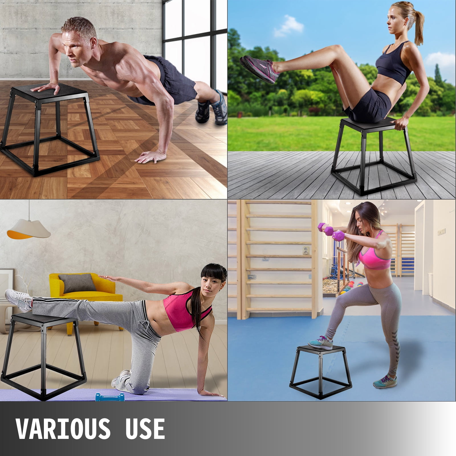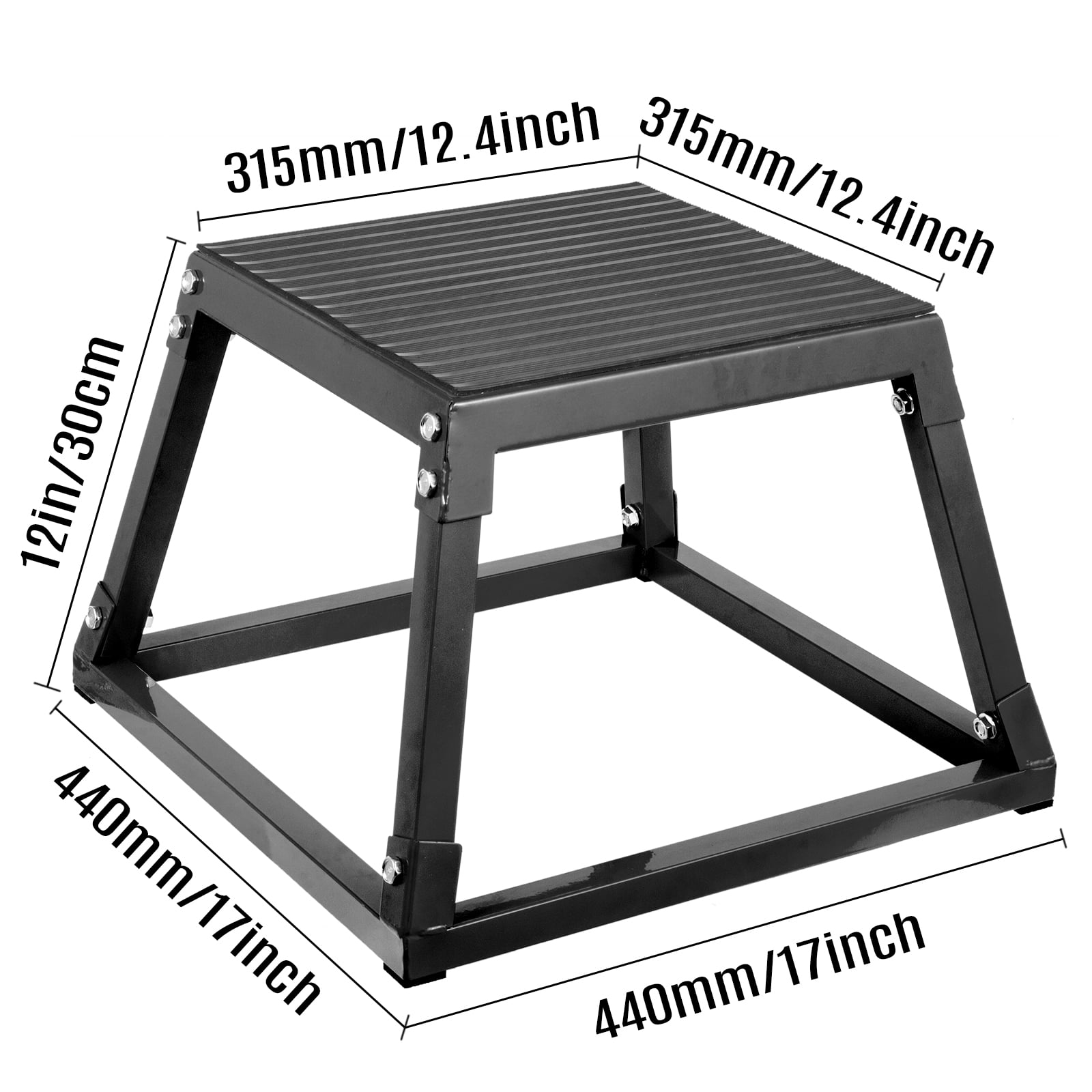 Brand Introduction VEVOR is a leading brand that specializes in equipment and tools. Along with thousands of motivated employees, VEVOR is dedicated to providing our customers with tough equipment & tools at incredibly low prices. Today, VEVOR has occupied markets of more than 200 countries with 10 million plus global members. Why Choose VEVOR? 1.Tough Quality Assurance 2.Incredibly Low Prices 3.Fast & Secure Delivery 4.30-Day Free Returns 5.24/7 Professional Customer Service Product Description12” Plyometric Jump Box Here we offer you this outstanding jump trainer, and it is widely used in gyms or at home for plyometric and explosive training. Our plyo boxes are the simplest and effective boxes that you deserve to have. Come and get one right now. Durable and Stable Due to the high-quality steel, powder coating, and metal top plate, our box jump is durable and rust-proof with maximum strength and durability. Non-slip Surface Non-skid rubber landing surface of this exercise box is designed to help maintain a grip on box landings and prevent injury. Unique Shape The trapezoidal structure design ensures the stability of the jump box and saves space, and can stack items under the jump box. Anti-slid Feet Four feet of the jump boxes for training are covered by anti-slip pads for more stability and protect your floor from scratching. Simple Installation The jump box can be easily assembled with accessories. It can be stacked or disassembled when not in use. It is more convenient to store and carry after disassembly. Various Use Perfect for men and women to use indoors and outdoors. The crossfit box can help build overall leg strength and power and work the core strength. Specification Color: Black Material: Steel, iron Height: 30 cm/12” Size of Top: 315×315 mm/12.4”x12.4” Size of Base: 440×440 mm/17”x17” Weight: 4.3 kg/9.5 lbs Package Content 1 x Plyometric Platform Box