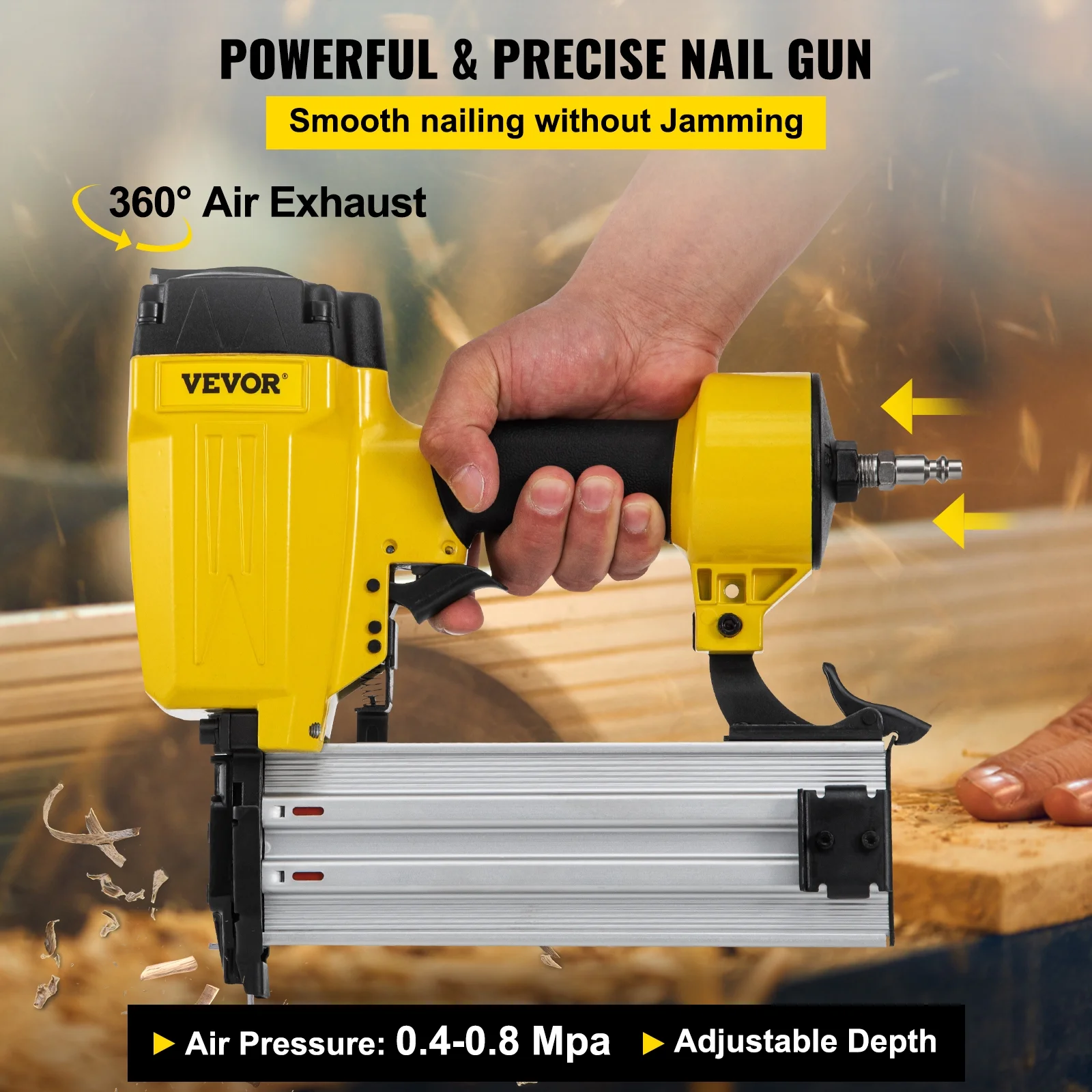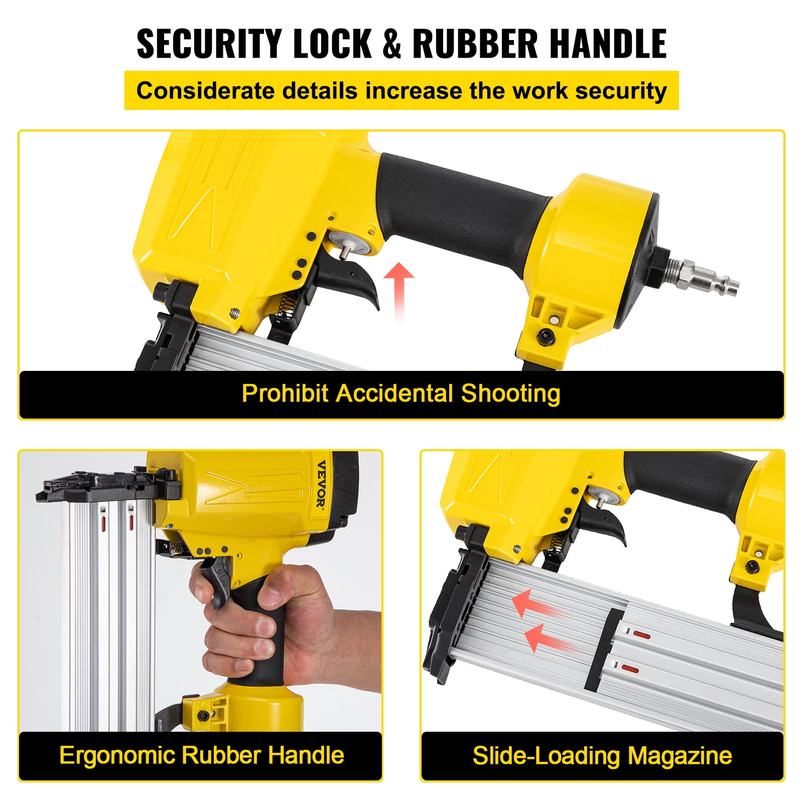 Brand Introduction VEVOR is a leading brand that specializes in equipment and tools. Along with thousands of motivated employees,VEVOR is dedicated to providing our customers with tough equipment & tools at incredibly low prices. Today, VEVOR has occupied markets of more than 200 countries with 10 million plus global members. Why Choose VEVOR? 1.Tough Quality Assurance 2.Incredibly Low Prices 3.Fast & Secure Delivery 4.30-Day Free Returns 5.24/7 Professional Customer Service Product Description 2-1/2″ Pneumatic Concrete Nailer 14 Gauge & 1 to 2-1/2inch & 50-100 pcs Capacity Powerful Concrete Nailer The pneumatic concrete nailer can achieve smooth nailing without jamming, ensuring efficient work. The operating pressure is 0.4-0.8 Mpa. Suitable Nail Range The heavy-duty concrete nailer uses 14 gauge 1-inch to 2-1/2-inch (25.4-63.5 mm) length concrete T nails. Nails are not included with this product. Ample Nail Magazine The concrete nail gun has a 50-100 nails magazine so that you can knock out plenty of work in a single load. You can quickly open the magazine with our slide design, jam-free. High Quality Don’t be fooled by the weight, the nail gun may be compact and light, but it can give a powerful shoot. The sturdy nose is designed for long-lasting performance. Design Upgrades The handle provides a rubber grip for more comfort and control. The secure lock can prevent an accidental shooting. Extensive Use Our 14-gauge nail gun is ideal for doing some soft masonry standard concrete nailing jobs like brick wall foundations, nailing baseboard, drywall, cable raceway, hardwood, and steel banding. Specifications Model: ST64-GD202 Nail Type: T-nail Nail Length Range: 1 to 2-1/2inch(25.4-63.5 mm) Housing Material: Aluminum Alloy Magazine Type: Sliding Type Power Source: Air-powered Operating Pressure: 0.4-0.8 Mpa Magazine Capacity: 50-100 Nails Item Weight: 6.6 lbs/3 kg Package Content 1 x Concrete T Nailer 1 x Wrench