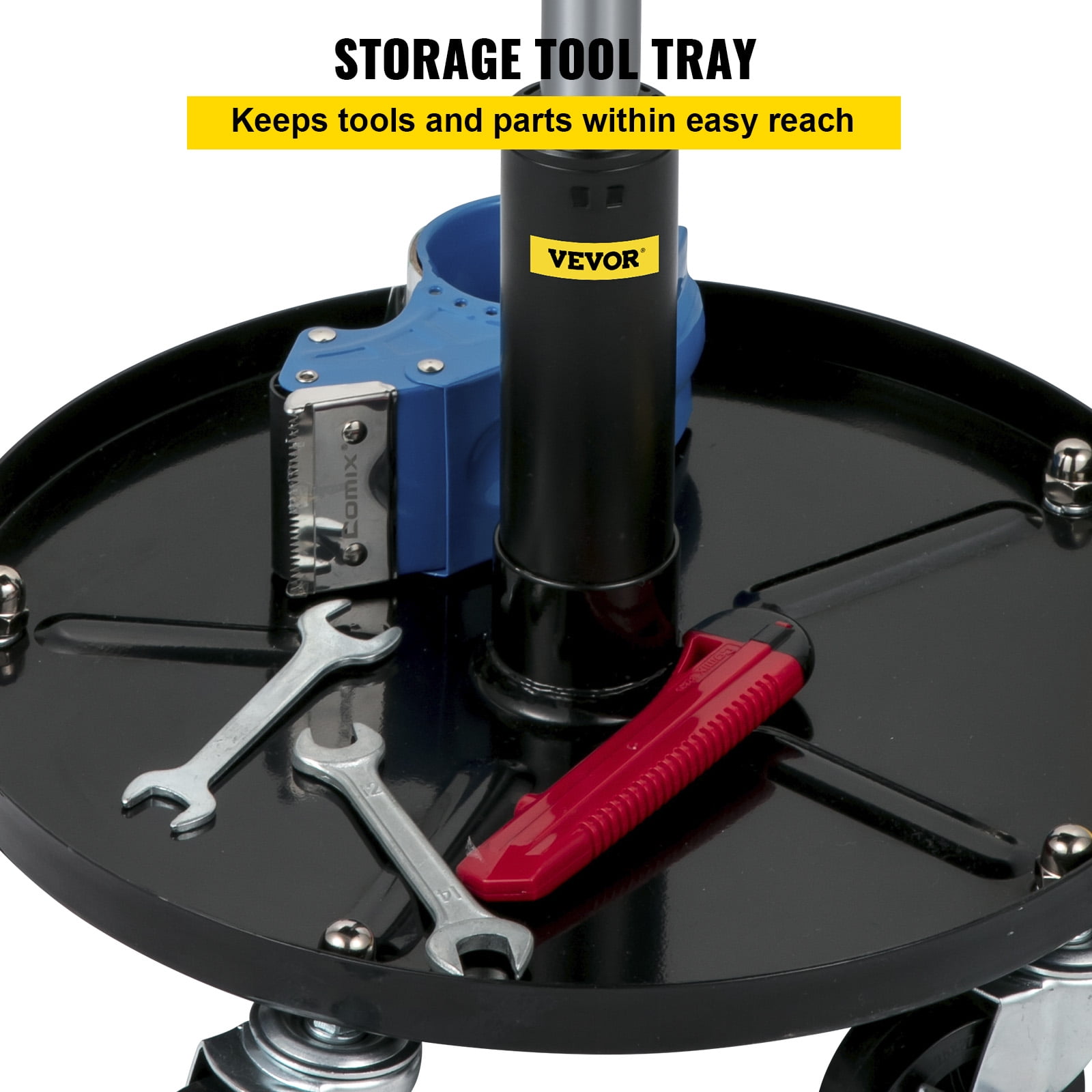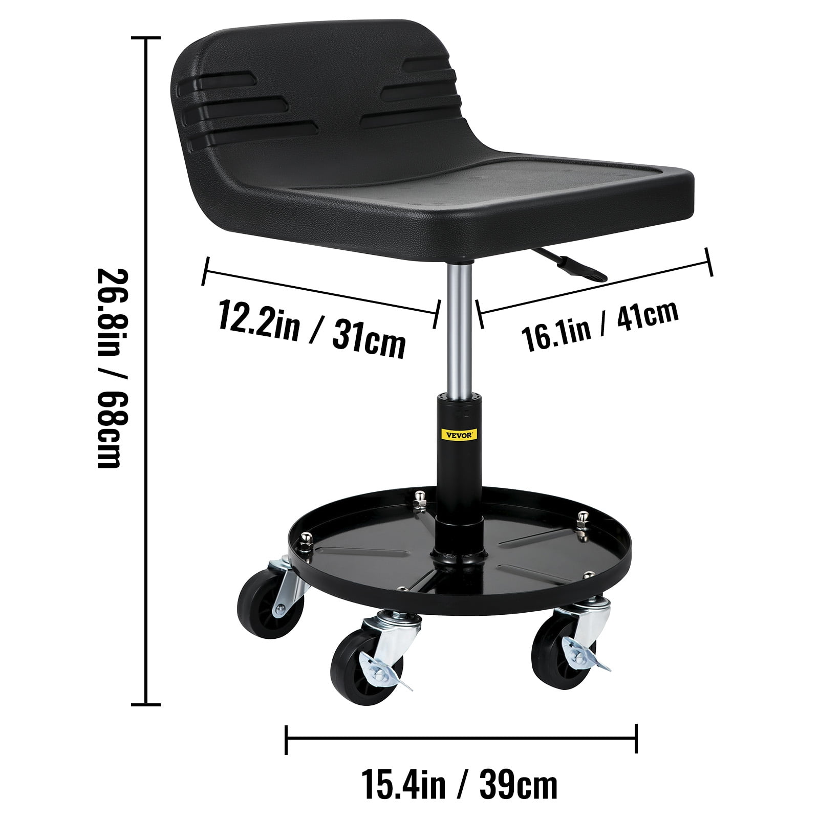 Brand Introduction VEVOR is a leading brand that specializes in equipment and tools. Along with thousands of motivated employees,VEVOR is dedicated to providing our customers with tough equipment & tools at incredibly low prices. Today, VEVOR has occupied markets of more than 200 countries with 10 million plus global members. Why Choose VEVOR? 1.Tough Quality Assurance 2.Incredibly Low Prices 3.Fast & Secure Delivery 4.30-Day Free Returns 5.24/7 Professional Customer Service Product Description Rolling Garage Stool Durable Seat & Storage Tray & 3″ Casters Well-built Seat This rolling stool is perfect for jobs that take hours to complete. The frame is steel and should withstand 300 lbs of weight in reality, getting more work done and work in comfort. Adjustable Height With a pneumatic cylinder design, the garage stool can easily adjust the height from 15.7″ to 20.5″ off the ground. The max. 20.5″ height allows you to use this stool with a desk. Tool Storage Tray The large storage tray easily store tools such as a screwdriver, microfiber towels, sponges, etc. Put a storage compartment inside the footrest and keep the tools within reach. Casters and Brakes The large 3″ diameter wheels roll soft and smooth over the floor. Two casters have a brake, so you lock the seat when reworking on a sloped driveway. Comfortable for Longer Hours This garage seat is a good choice regarding comfort, especially the backrest that allows you to lean in. It is stable, and its large base prevents it from tipping over. Wide Application Having a comfy seat will make a huge difference from squatting, especially if you need to work long hours. This rolling garage stool is the handy assistant you’ve been missing in your shop. Specifications Model: VVCCGLJH4L Capacity: 300 lbs/135 kg Lift Range: 4.7 inch/12 cm Min. Height: 15.7 in/40 cm Max. Height: 20.5 in/52 cm Caster Diameter: 3 in/7.6 cm Number of Casters: 4 pcs Weight: 16.5 lbs/7.5 kg Cushion Size (W x D): 16.1 in x 12.2 in/41 cm x 31 cm Size (L x W x H): 16 in x 16 in x 26.8 in/41 cm x 41 cm x 68 cm Tray Size: 15.4 in/39 cm Package Content 1 x Rolling Work Stool