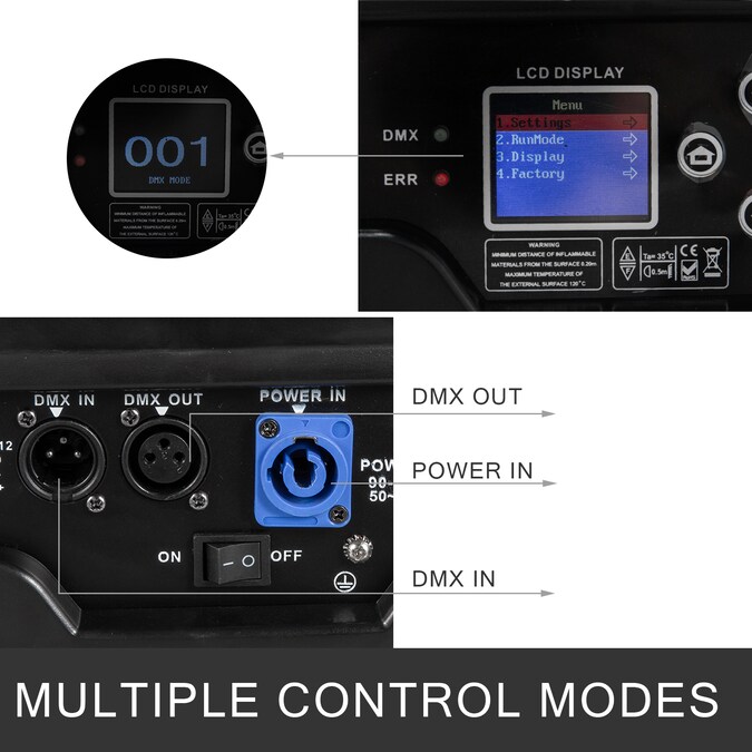 - Specification: Lamp: 36×10 W RGBW-in-1 LED (red,green,blue,white); Power Input: AC 100-240 V, 50-60 HZ; Material: Plastic; Pan: 540 degree (8-16 bit); Tilt: 265 degree (8-16 bit); Control Modes: DMX, sound control, automatic, master and slave; Body Size: 1.4×0.9×1.8 inch (36x22x45mm); Net Weight: 20 lbs (9 kg); Gross Weight: 24 lbs (11 kg)