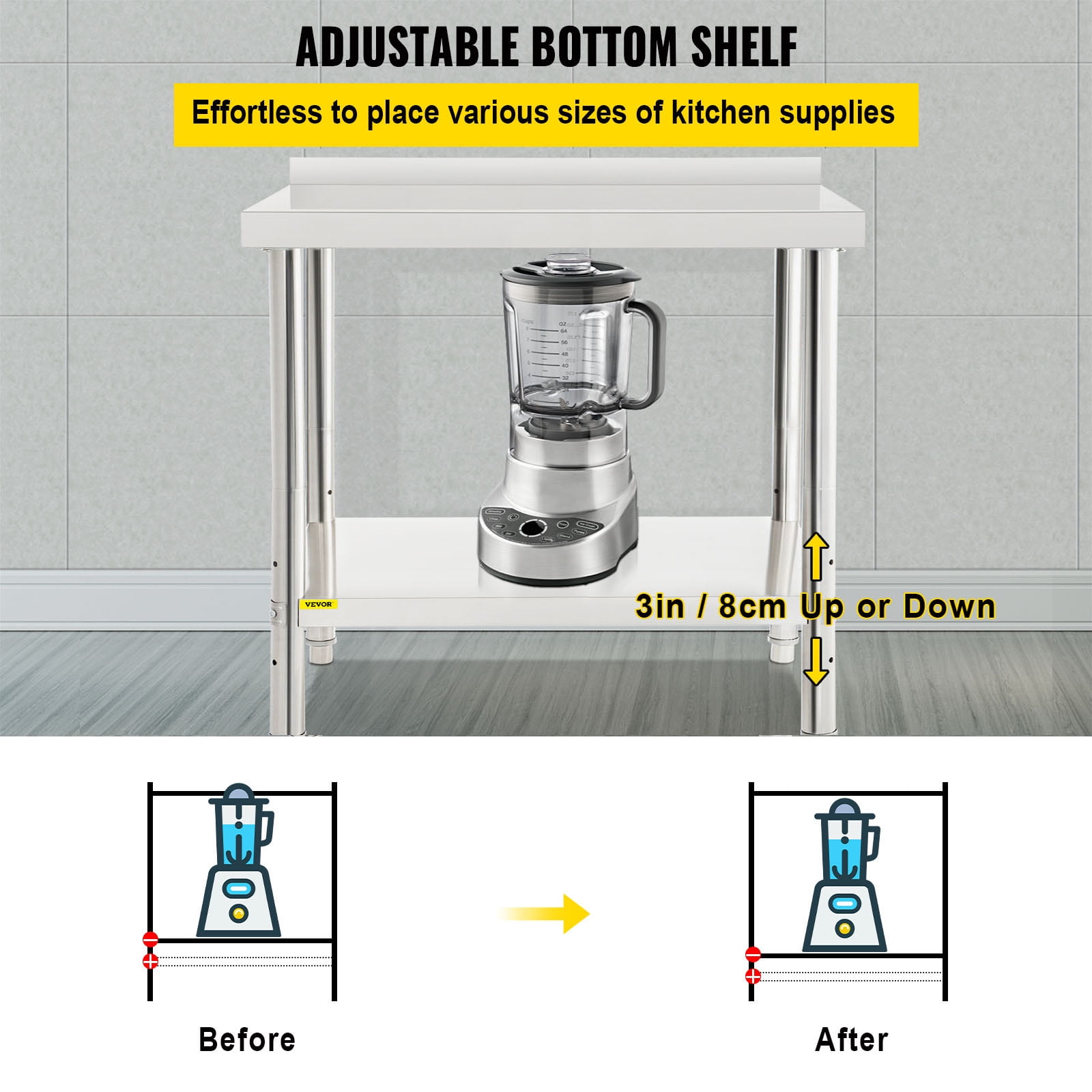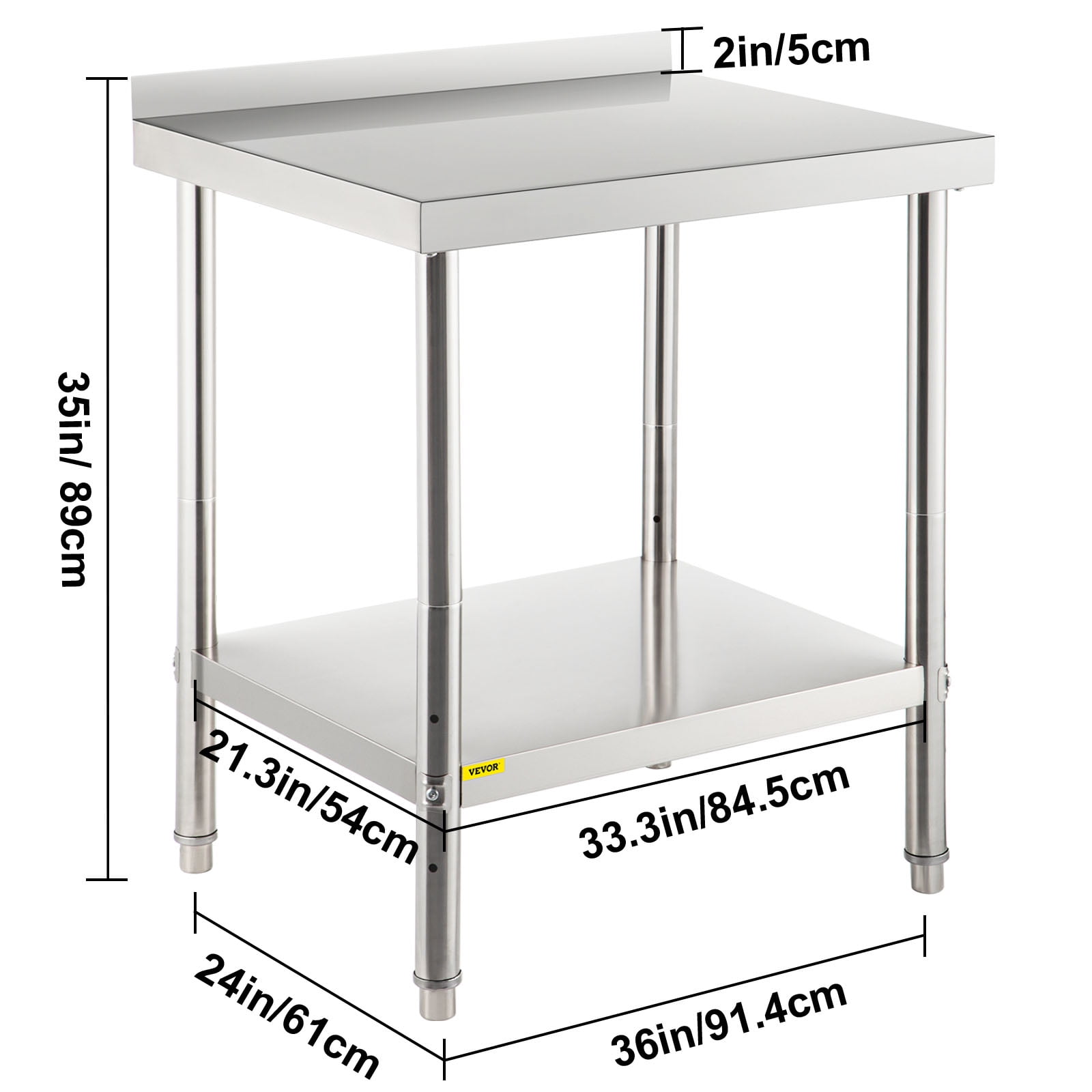 Brand Introduction VEVOR is a leading brand that specializes in equipment and tools. Along with thousands of motivated employees,VEVOR is dedicated to providing our customers with tough equipment & tools at incredibly low prices. Today, VEVOR has occupied markets of more than 200 countries with 10 million plus global members. Why Choose VEVOR? 1.Tough Quality Assurance 2.Incredibly Low Prices 3.Fast & Secure Delivery 4.30-Day Free Returns 5.24/7 Professional Customer Service Product Description Stainless Steel Kitchen Prep Table 440lbs Load Capacity & 3-Level Adjustable Shelf & with Backsplash 440lbs Load Capacity This kitchen prep table is of superior strength, providing a loading capacity of 330 lbs on the top shelf and 110 lbs on the undershelf without shaking. It offers you a place to store frequently used items, such as ovens, towels, and mixing bowls. Adjustable Shelf Height With the 3 adjustable height levels, you can move the undershelf up or down by reassembling it. This feature perfectly accommodates differently sized items. High-Quality Stainless Steel This work prep table features premium stainless steel of enhanced strength and durability, avoiding rust, corrosion, and deformation. The wire-drawing surface allows for effortless cleaning and keeps its gloss. User-Friendly Design The 2-inch height backsplash keeps your valuable equipment and supplies away from slipping off the table. The smooth edges bring comfort and security at work. The unique triangle support design ensures the stability of the whole table. In addition, the 0.4-0.8 inches height-adjustable feet won’t shake on uneven floors. Easy to Assemble It only takes a few steps to assemble the worktable. You can finish the installation without breaking a sweat. Wide Application A must-have for your home or commercial kitchen, laundry room, garage, or wherever it is needed; It can be used to store your objects, chop vegetables, knead the dough, etc. Specifications Model: VV-SSWT-BWJL-2436 Material: Stainless Steel Top Shelf Load Capacity: 330 lbs / 150 kg Under Shelf Load Capacity: 110 lbs / 50 kg Item Dimension: 36 x 24 x 35 inch / 91.4 x 61 x 89 cm Undershelf Size: 33.3 x 21.3 inch / 84.5 x 54 cm Distance Between Two Shelves: 19.3-22.4-25.6 inch / 49-57-65 cm Adjustable Foot Height: 0.4-0.8 inch / 1-2 cm Backsplash Height: 2 inch / 5 cm Table Legs Diameter: 1.9 inch / 48 mm Item Weight: 30.9 lbs / 14 kg Package Content 1 x Stainless Steel Prep Table 1 x Pack of Accessories