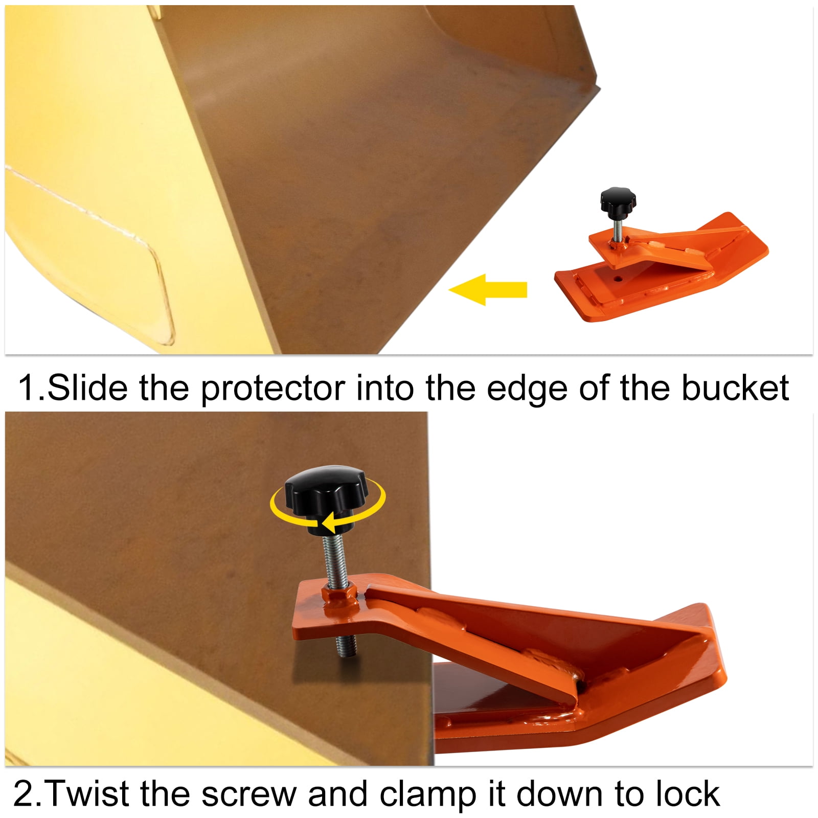 【EASY INSTALLATION】- Measures 11.8″ Long x 4.5″ Wide. Suitable for any tractor with a bucket edge thickness of less than 2 inches. Easily slide into the bucket edge and secure with the screw rod without drilling required. 【REMARKABLE PROTECTION】- To better fix the edge protector on the bucket, we designed a 12 mm diameter screw rod with an upgraded handle. Compared with ordinary screw bolts, we can worry less about accidental fall off during use. 【HEAVY-DUTY STEEL MATERIAL】- Color: Orange. These bucket protectors are well-built for heavy-duty use. Made of premium steel to reduce wear, tear, and corrosion for maximum durability and longevity. 【WELL-MADE DETAILS】- Our loader bucket protector works awesome, making your tractor a whole new useful tool without damaging your turf, grass, soil, gravel driveway, and parking area. 【EXTENDED USE】- Widely used in the agricultural and industrial areas, such as your farm, driveway, garden. These bucket edge protectors can effectively remove leaves, snow, debris, branches, etc.