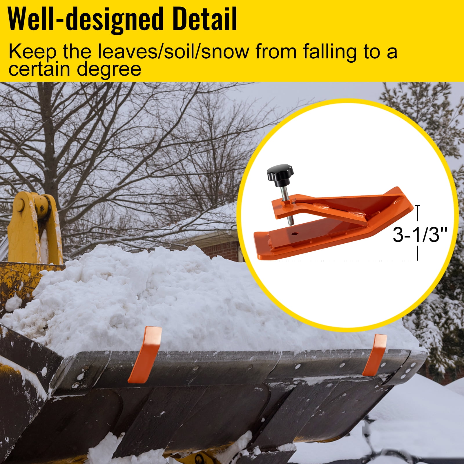 Brand Introduction VEVOR is a leading brand that specializes in equipment and tools. Along with thousands of motivated employees,VEVOR is dedicated to providing our customers with tough equipment & tools at incredibly low prices. Today, VEVOR has occupied markets of more than 200 countries with 10 million plus global members. Why Choose VEVOR? 1.Tough Quality Assurance 2.Incredibly Low Prices 3.Fast & Secure Delivery 4.30-Day Free Returns 5.24/7 Professional Customer Service Product Description Orange Tractor Bucket Protectors Our Bucket Protectors are excellent tools for tractor buckets, saving your grass, soil, and turf. Made of heavy-duty steel, these protectors are sturdy and not easy to breaks. With the quick attach mounting system, you can finish the assembly quickly when you need a clean separation between the ground and debris. An essential tool for your daily activities! Easy Setup The convenient clamp-on design makes the installation or removal easier without drilling required. Slide on and tighten the hardware. Upgraded Screw Bolt Featuring a 12 mm screw bolt, the tractor bucket edge protector can be firmly secured to your bucket. Fit for most of the tractor bucket. Good Protection Our protector for tractor buckets is capable of leaf removal without harming turf, grass, soil, and gravel. It can make a huge difference. Heavy-duty Steel The bucket protector is crafted with heavy-duty steel in 3/8” thickness, with a durable powder-coated finish for ultimate longevity. Ingenious Design This attachment has a curve, approximately 3-1/3” in height. You don’t destroy the lawn when you push snow with the loader bucket anymore. Widely Used Perfect for outdoor use, whether on your farm or workplace. It can move most of the leaves, branches, hay, etc. Excellent attachment for your tractors, loaders! Specifications Dimension: 11.8” x 4.5” x 3-1/3”/300 x 115 x 85 mm Thickness: 3/8”/10 mm Material: Steel Weight: Approx. 21.2 lbs/9.6 kg Color: Orange PackageContent 2 x Tractor Bucket Protectors