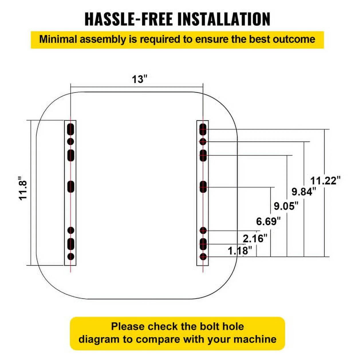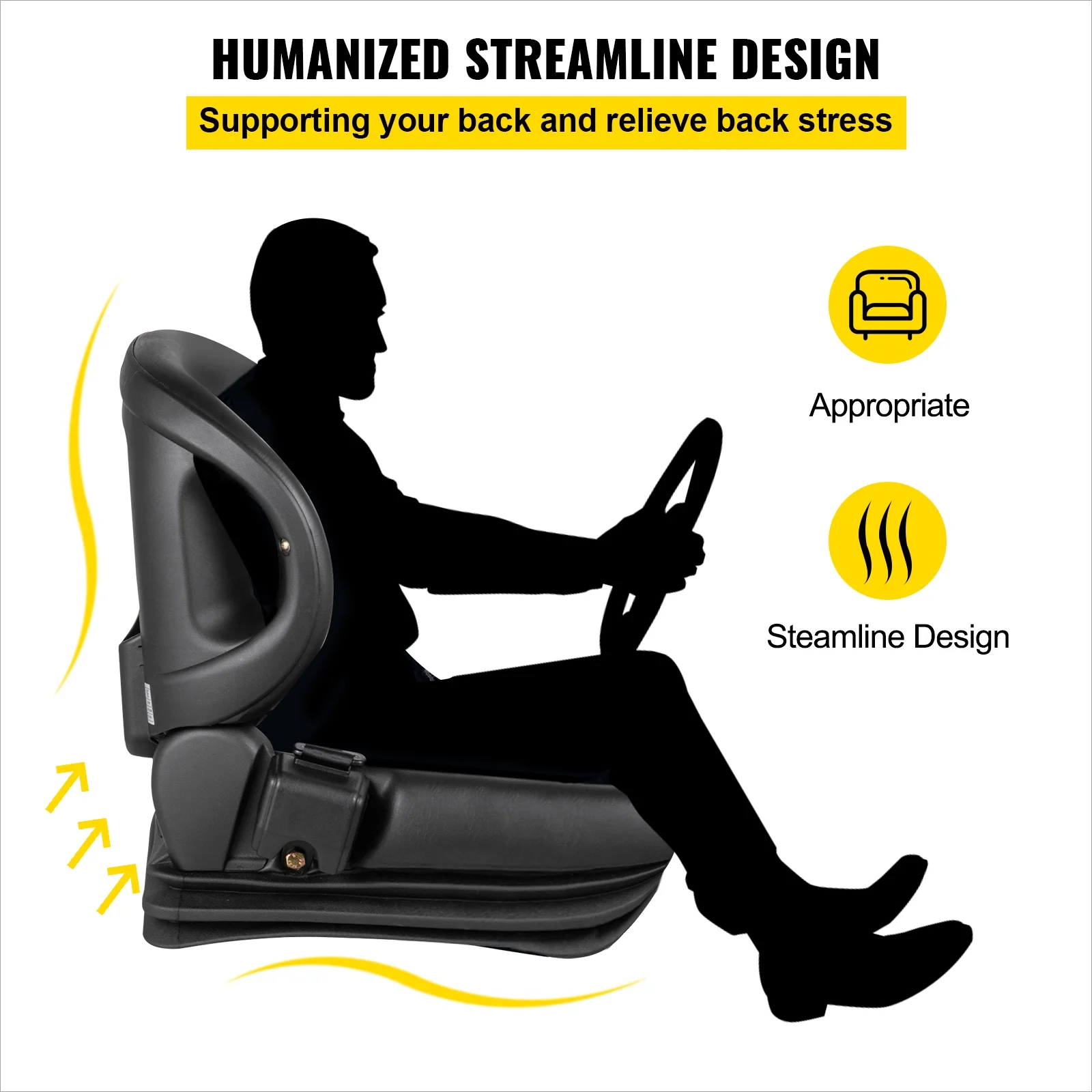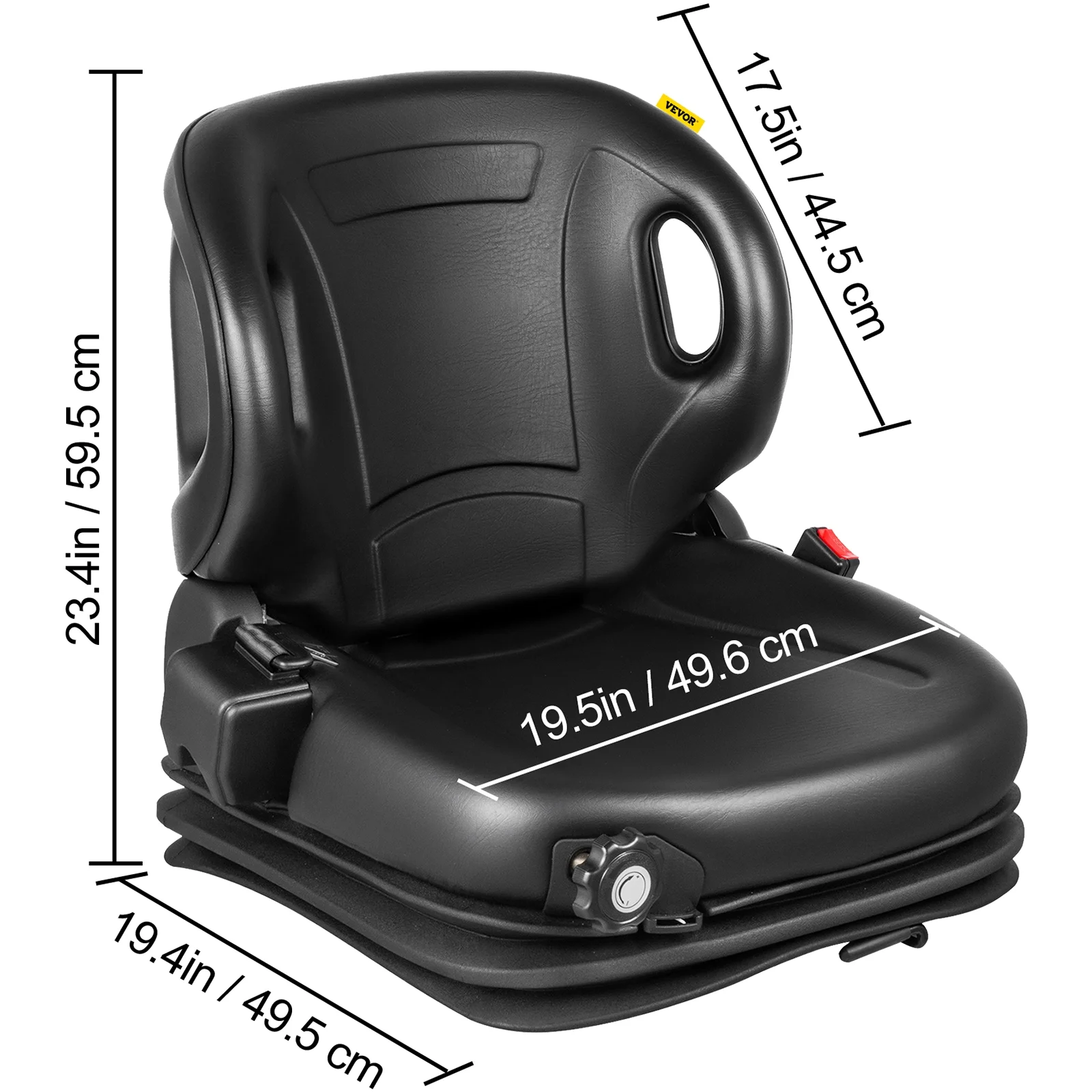 Brand Introduction VEVOR is a leading brand that specializes in equipment and tools. Along with thousands of motivated employees,VEVOR is dedicated to providing our customers with tough equipment & tools at incredibly low prices. Today, VEVOR has occupied markets of more than 200 countries with 10 million plus global members. Why Choose VEVOR? 1.Tough Quality Assurance 2.Incredibly Low Prices 3.Fast & Secure Delivery 4.30-Day Free Returns 5.24/7 Professional Customer Service Product Description Replacement Toyota ForkliftsSeat The tractor seat that fits multiple applications to add maximum comfort by helping reduce vibrations, which will keep you moving forward in every type of rough terrain. It is suitable for medium to large horsepower tractors, telescopic handlers, combine and forage harvesters and small-wheeled loaders. Premium Materials The universal mower seat is made up of a rigid steel frame and a leather cushion within which is a vinyl foam of a higher density of 75g/cm³. That makes it a sturdy seat, and resistant to heat and humidity as well. You’d like to enjoy a good sitting experience on the elastic seat. Adjustable & Convenient The tractor seat replacement features a backrest with a 70° adjustment. It is also designed with a back seat organizer allowing for some odds and ends. And there are adjustable slide rails with 6in of travel under the seat. Safety Protection The tractor seat has a retractable belt that won’t trip you up and save precious place on your vehicle. Rotating the switch of the suspension air cushion to reduce the vibration effectively. The seat foam doesn’t contain any titanium dioxide, making it safe and comfortable. Ergonomic Design The shape of the lawn tractor seat is designed to fit for the human body, providing mechanical lumbar support to help prevent lower back pain. Meanwhile, it is endowed with a unique look. Easy to Install & Replace The replacement seat is easy to install and remove. Slide rails installation is a kick-off for a mechanically inclined person. All necessary parts and accessories are included in the package. Exact Replacement The universal equipment seat can be installed on forklifts of a variety of Toyota seats, ranging from vehicles like Toyota mowers, excavators, wheel loaders, dozers, backhoes, tractors, etc. Specifications Model: VV-TS-QXFZY Color: Black Material: PVC & Polyurethane & Steel Angle Adjustment: Forward 20° & Backward 25° Sliding Base Adjustment: 6.92 inches Seat Size(L/ W/ H): 19.4″ x 22.4″ x 23.4″ / 49 x 57 x 59 cm Package Content 1 X Toyota Tractor Seat 1 X Accessory Set 1 x User Manual