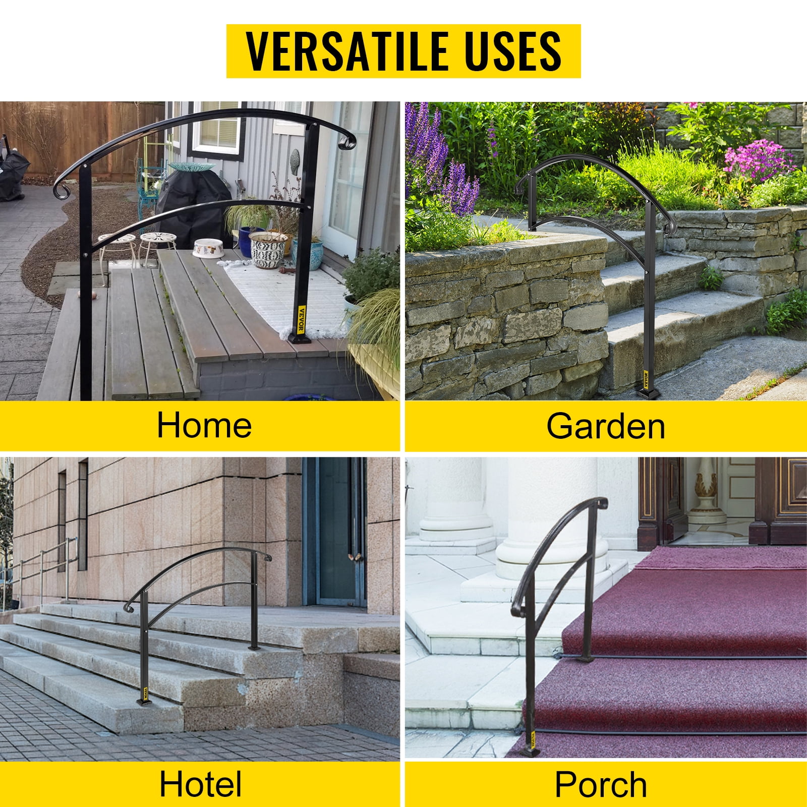 Brand Introduction VEVOR is a leading brand that specializes in equipment and tools. Along with thousands of motivated employees,VEVOR is dedicated to providing our customers with tough equipment & tools at incredibly low prices. Today, VEVOR has occupied markets of more than 200 countries with 10 million plus global members. Why Choose VEVOR? 1.Tough Quality Assurance 2.Incredibly Low Prices 3.Fast & Secure Delivery 4.30-Day Free Returns 5.24/7 Professional Customer Service Product Description Transitional Handrail Fits 3 Steps This matte black handrail is transitional handrail that fits for 3 steps. It is an elegant handrail that’s a comfortable fit for any budget. Constructed with real iron metal and adopted powder coating technology, it is suitable for gardens, residential buildings, commercial office buildings, hotels, etc. 3-Step Handrail This is transitional handrail for 1 or 3 steps. Real Iron Metal This handrail is constructed with real wrought iron, not aluminum. It is more strong and reliable and will not fail or bend like aluminum. Also, stainless steel post mounts will not rust or flex. Powder Coating Technology Adopted powder coating technology, the handrail picket is designed to be matte black. It is rustproof for durability and easy to clean. Reliable & Stylish Design All the connections are strongly welded and perfectly connected. The iron picket and curved design is beautiful and stylish. Easy To Assemble The handrail includes all necessary assembly and installation hardware. Universal Application Suitable for gardens, residential buildings, commercial office buildings, hotels, etc. Specifications Model: Transitional Handrail Color: Matte black Material: Real Iron Metal Package Content 1 x Handrail Powder Coating Black 1 x Installation Kit