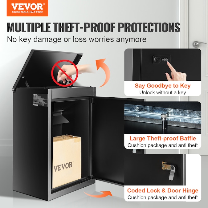 - Multiple Anti-Theft Protections: Don’t worry about losing keys and being unable to retrieve your parcels; VEVOR 17.3 x 13.8 x 22.8inch mailboxes for outside come with a secure password lock and internal hinge to ensure your packages are well-protected; The deposit opening is also equipped with a large anti-theft baffle, reinforced screws, and hydraulic support poles to prevent theft and shock absorption;