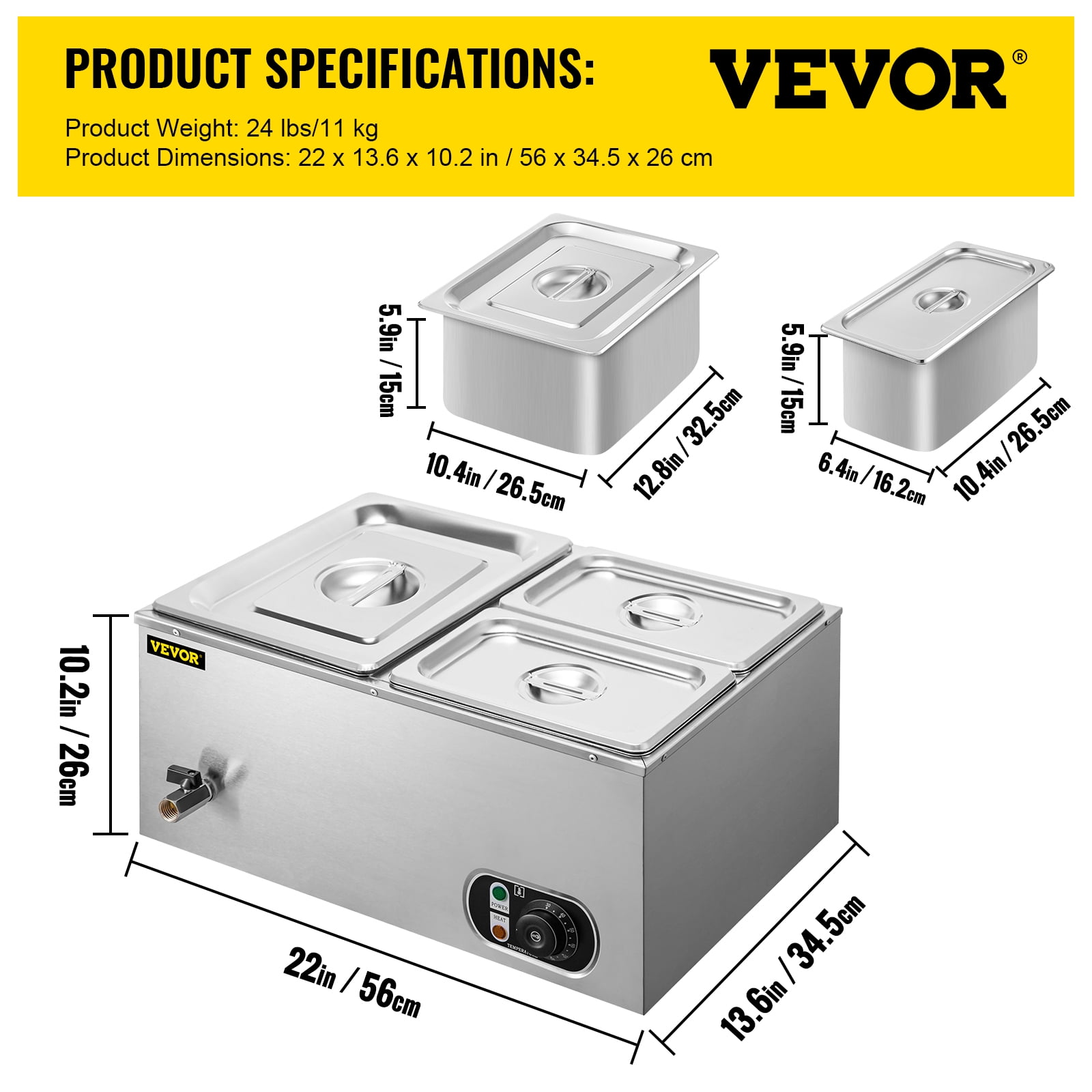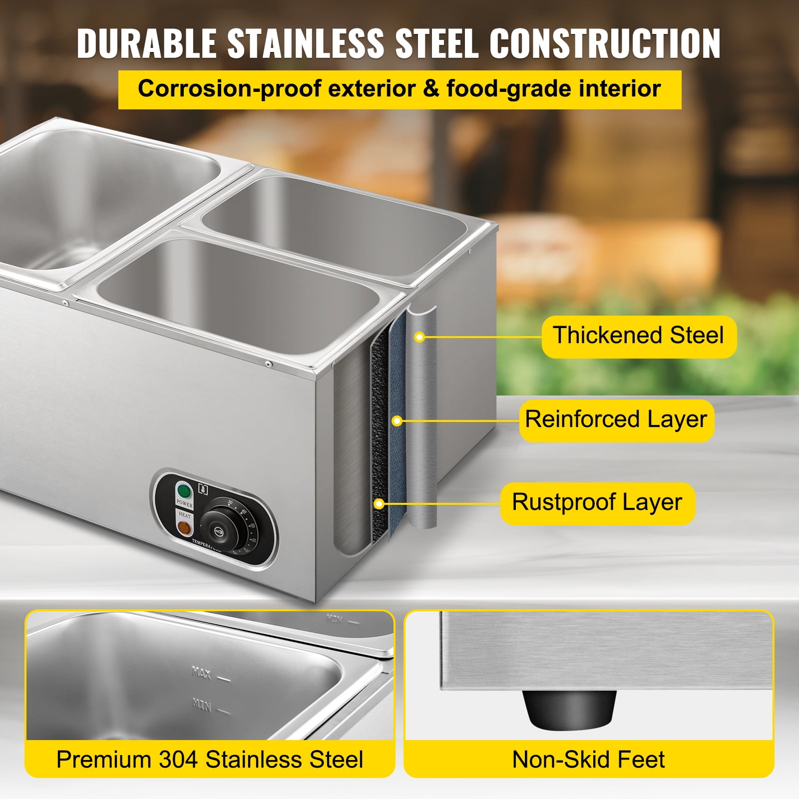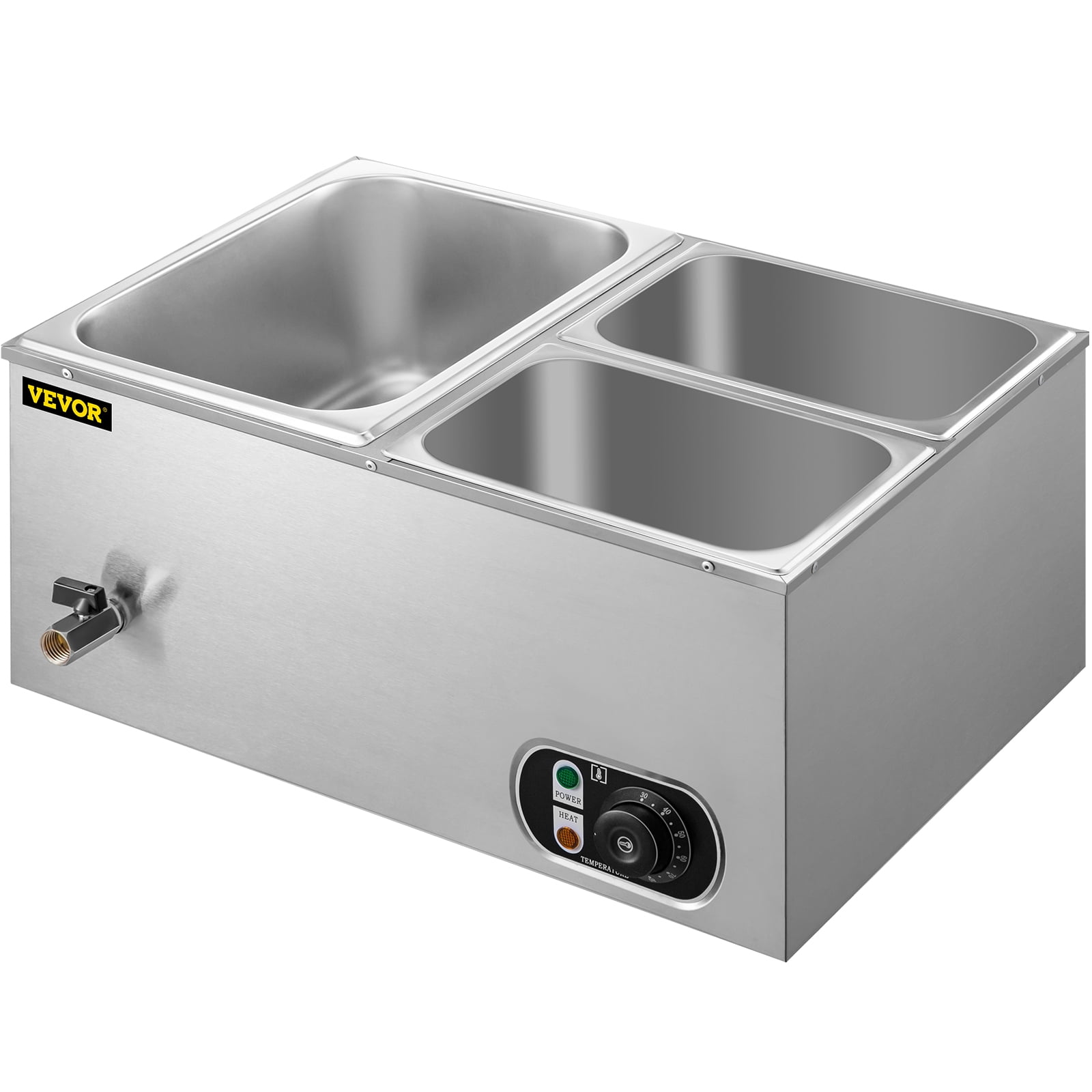 【LARGE CAPACITY FOR PROSPEROUS BUSINESS】 – Our commercial bain marie is equipped with three large-capacity food pans, allowing you to serve three different products simultaneously. It accommodates a 1/2 pan(12.8 x 10.4 x 5.9 inch) and two 1/4 pans(12.8 x 6.4 x 5.9 inch). The 6-inch depth makes each food pan 50% more capacity than others. Each pan is removable for easy cleaning. 【FOOD-GRADE STAINLESS STEEL STRUCTURE】 – Constructed with full heavy-duty food-grade stainless steel material, this commercial food warmer features robust sturdiness, durability, and longevity, with easy cleaning and simple maintenance. It has an exquisite appearance to be an attractive addition to your kitchen. 【FAST HEATING & IDEAL TEMPERATURE CONTROL】 – This buffet warmer adopts a stainless steel heating tube in a unique shape, providing even heat distribution, great for efficient heat transfer. Besides, it is designed with a rotary button for precise control of temperature. The hot trays food warmer features an adjustable temperature from 30-85℃/86-185℉. Two indicators clearly show working status. 【WELL-DESIGNED DETAILS FOR CONVENIENCE】 – The hot buffet warmer comes with a drainage faucet for convenient water releasing. Two ladles (soup ladle & perforated ladle) for the pot make serving your delicious products a breeze, while the notched lids keep the soup piping hot and give the ladles a convenient resting place. Furthermore, there are water lines marked inside the pan for warm tips. 【MULTIFUNCTIONAL SOUP WARMER】 – This electric steam table for the buffet can be used to keep dishes warm, heat the milk and steamed buns, melt chocolate, etc. It is widely used in breakfast shops, snack bars, restaurants, plazas, school cafeterias, etc.