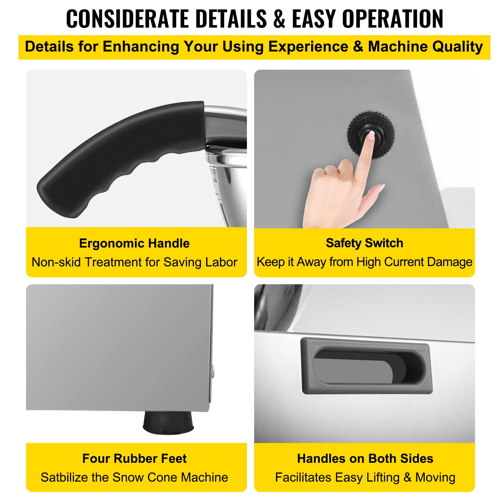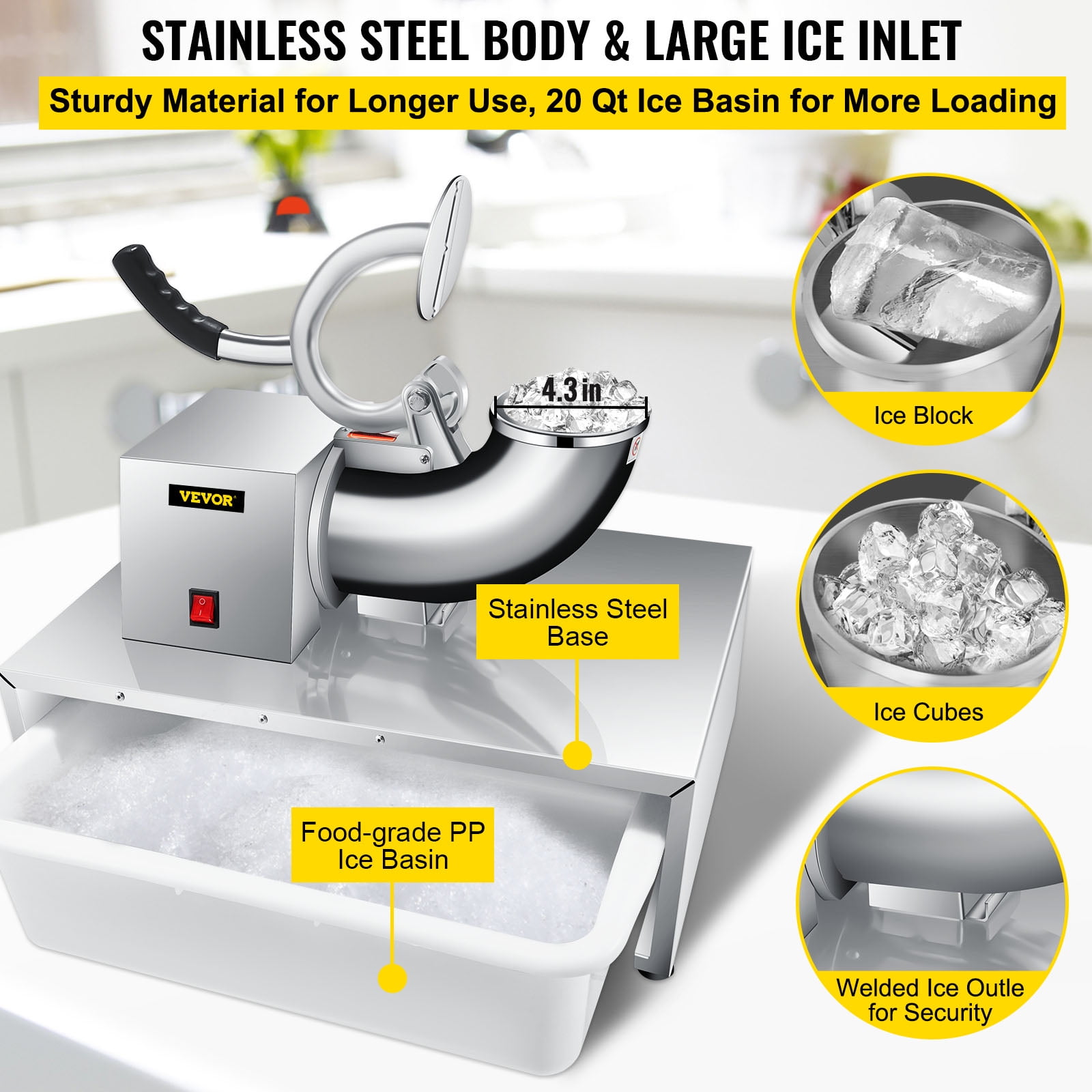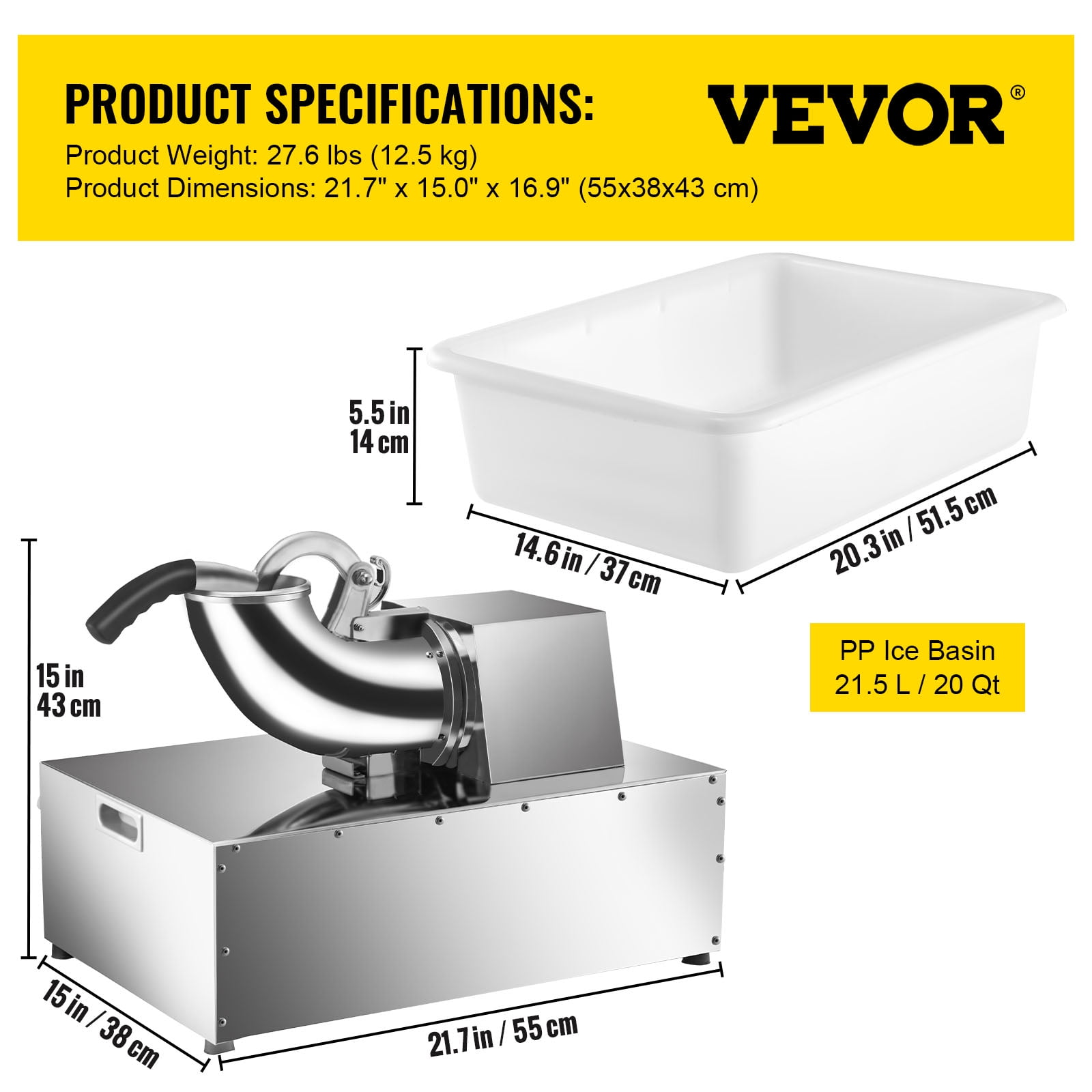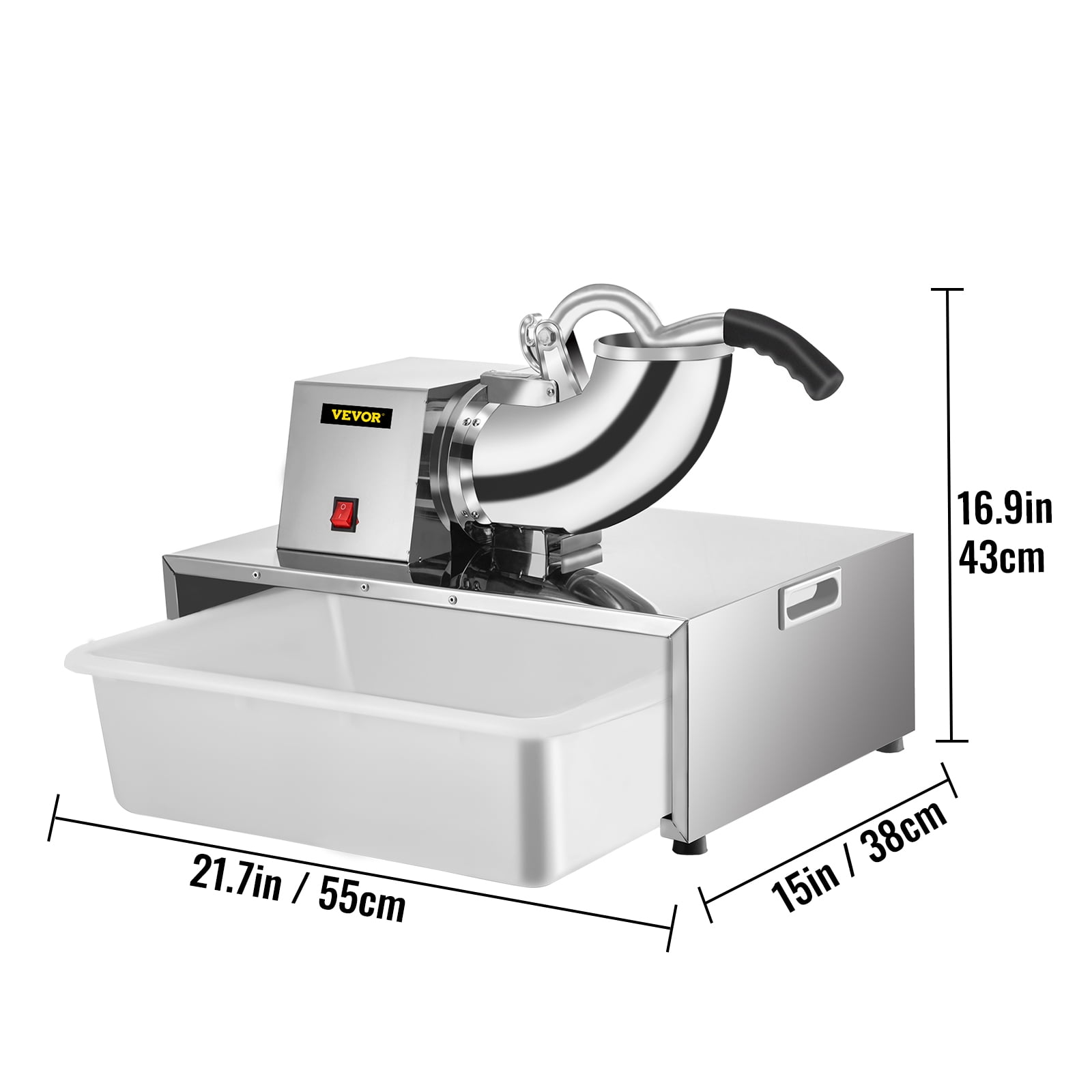 Brand Introduction VEVORbrand is a leading brand that specializes in equipment and tools. Along with thousands of motivated employees,VEVORbrand is dedicated to providing our customers with tough equipment & tools at incredibly low prices. Today, VEVORbrand has occupied markets of more than 200 countries with 10 million plus global members. Why Choose VEVORbrand? 1.Tough Quality Assurance 2.Incredibly Low Prices 3.Fast & Secure Delivery 4.30-Day Free Returns 5.24/7 Professional Customer Service Product Description Commercial Snow Cone Machine with Ice Basin Our electric snow cone machine features an eyes-pleasing stainless appearance and powerful performance. With the built-in 250W copper motor, it can crush 500 lbs (226.8 kg) of ice each hour, providing you with soft, fluffy, and powdery snow ice, meeting your demands in a relatively short time. Considerate design details and accessories are also integrated, such as the extra-large ice basin, splash-proof ice outlet, ergonomic handle, double side handles, non-skid rubber feet, security switch, etc. It is perfect for restaurants, canteens, bars, cafés, snack stands, etc. Efficient Dual Blades Our snow cone machine adopts dual stainless steel blades, sharp and durable, providing double shaving efficiency. The amount of crushed ice per hour can reach 500 lbs (226.8 kg), much more efficient than a single blade. Extensive Ice Barrel This snow cone maker features an extensive ice inlet barrel and wide ice inlet hole, the diameter of which measures 4.3″ (11 cm). You can put in tiny ice cubes or large ice blocks. The more ice you load at each time, the more crushed ice you will get accordingly. 250W Copper Motor Fueled by a potent 250W copper motor, whose rotating speed being 1420 r/min, our shaved ice machine can bring you a high hourly shaved ice yield with low noise. Extra Large Ice Basin An extra-large ice basin is also offered, 18.3″x13.0″x5.5″ (46.5x33x14 cm) in inner dimensions and 21.5 Qt (20 L) in capacity, which is large enough for holding the falling crushed ice. User-Friendly Details The handle with its end wrapped in a non-skid sleeve is ergonomically designed for labor-saving operation. The double side handles can enhance the convenient movement. Four rubber feet serve to stabilize our machine better. Extensive Applications Our shaved ice machine for commercial and home use is ideal for making milkshakes, smoothies, icy drinks, and bottom ice for seafood decoration & preservation. Specifications Model: WF-A108H Material: Stainless Steel+Polypropylene Ice Shaving Capacity: 500 lbs (226.8 kg) per Hour Voltage: 110V / 60 Hz Rated Power: 250W Rotating Speed: 1420 RPM Ice Inlet Diameter: 4.3 in (11 cm) Ice Basin Dimensions: 20.3×14.6×5.5 in (51.5x37x14 cm) Ice Basin Capacity: 21.5 Qt (20 L) Length of Power Cord: 3.9 ft (1.2 m) Product Dimensions: 16.1×10.2×12.6 in (41x26x32 cm) Product Weight: 27.6 lbs (12.5 kg) Package Content 1 x Commercial Snow Cone Machine 1 x Ice Basin 1 x User Manual