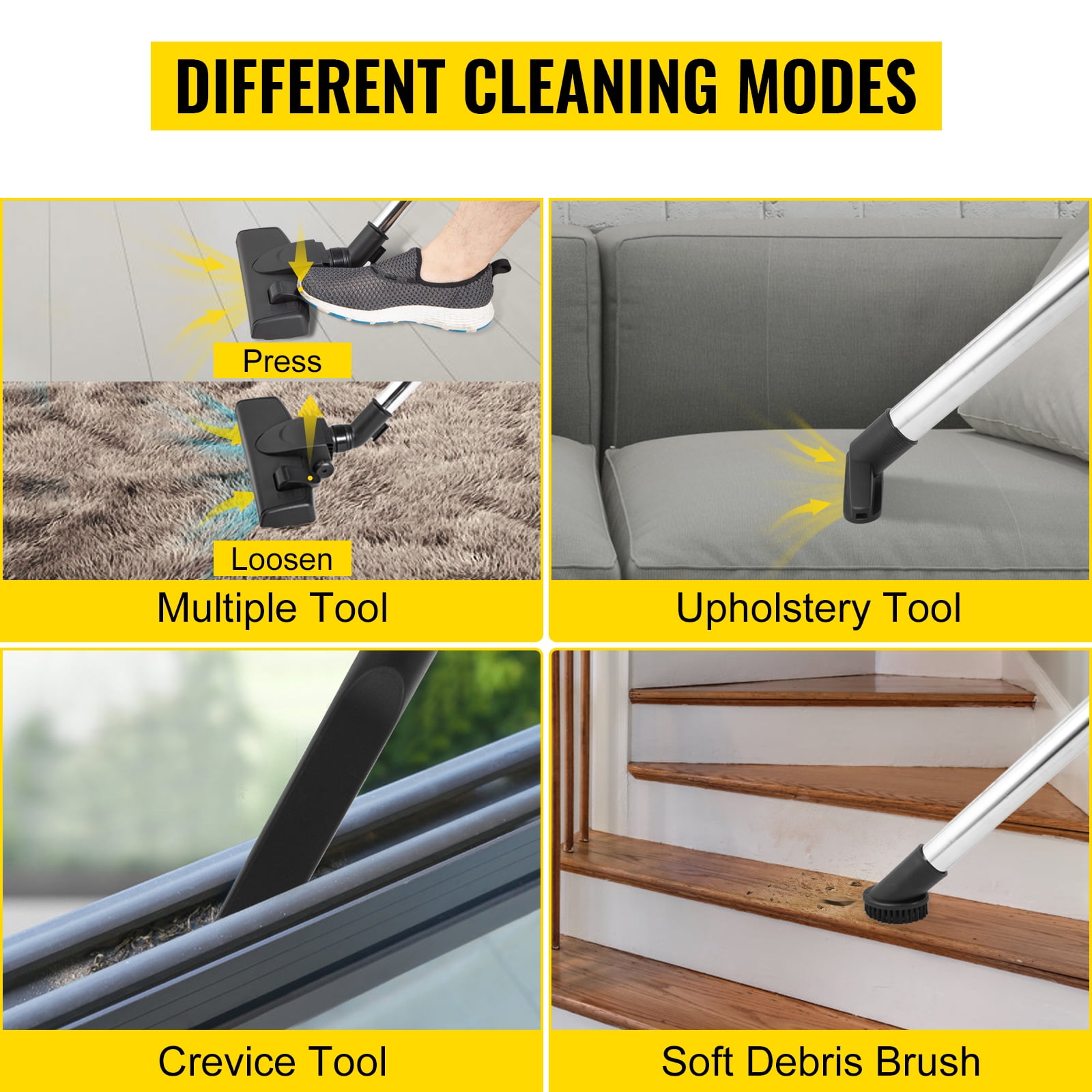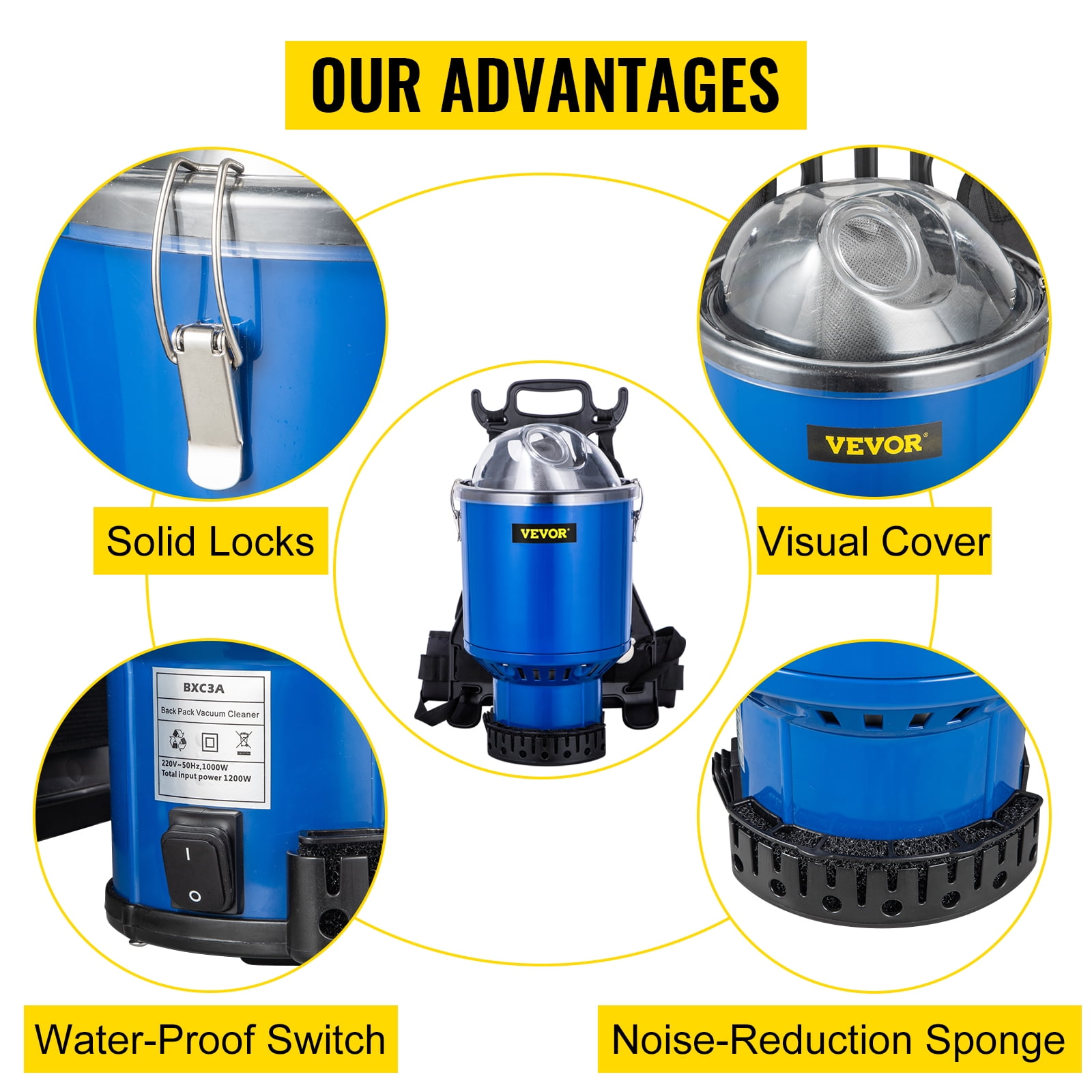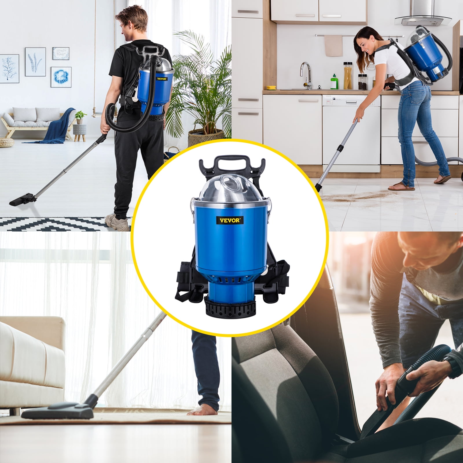 Brand Introduction VEVORbrand is a leading brand that specializes in equipment and tools. Along with thousands of motivated employees,VEVORbrand is dedicated to providing our customers with tough equipment & tools at incredibly low prices. Today, VEVORbrand has occupied markets of more than 200 countries with 10 million plus global members. Why Choose VEVORbrand? 1.Tough Quality Assurance 2.Incredibly Low Prices 3.Fast & Secure Delivery 4.30-Day Free Returns 5.24/7 Professional Customer Service Product Description 5-In-1 Backpack Vacuum Are you distressed with cleaning? Are you looking for a powerful vacuum? Our high-quality backpack vacuum cleaner not only features a lightweight design but also has multiple functions, meeting all your needs. Do not hesitate, or you will miss this perfect product. With its help, you will quickly get a clean and peaceful environment with no debris. Efficient & Labor-Saving Our industrial backpack vacuum only weighs 13.4 lbs. The adjustable backpack design makes you feel comfortable when you clean. The advanced motor not only achieves a quick clean, but also saves your energy. Complete HEPA Filtration The commercial vacuum adopts a premium HEPA device, giving the air a double stage filtration. Through this process, you are allowed to breathe better air. Easily maintain the filtration devices with water. 5 Modes for Choosing This professional vacuum cleaner can always be your assistant whether you are cleaning large areas or small, hard surfaces or soft, high space or low. Owning only one vacuum can meet all your needs. Extension Cord & Wand 59 ft cord makes you walk unlimited in any ample space with fewer outlets switch. This industrial vacuum cleaner would help clean the blind area with the adjustable wand, making your cleaning easier. Our Advantages Our industrial vacuum supports convenience and security with more comprehensive designs than any other product. Meanwhile, it creates a lower-noise space of only 50-60 HZ. Extensive Application This residential cleaning service kit is compatible with any place, such as home, school, hospital, office, hotel, cinema, etc. Using this functional assistant, you will create an all-around clean environment. Specifications Model: VV-BV-4LU Voltage: 110 V Power: 1000 W Air Flow Rate: 3.26 l/s Capacity: 3.6 qt/ 4 l Product Weight: 13.4 lbs/ 6.1 kg Item Size: 13 x 13 x 23 in/ 330 x 330 x 580 mm Extension Cord Length: 59 ft/ 18 m Telescoping Wand Length: 25 in/ 64 cm Hose Length: 4 ft/ 1.25 m Package Content 1 x Backpack Vacuum 1 x Multi-Surface Tool 1 x Upholstery Tool 1 x Crevice Tool 1 x Soft Debris Brush 1 x Telescoping Wand 1 x Extension Cord 1 x Hose