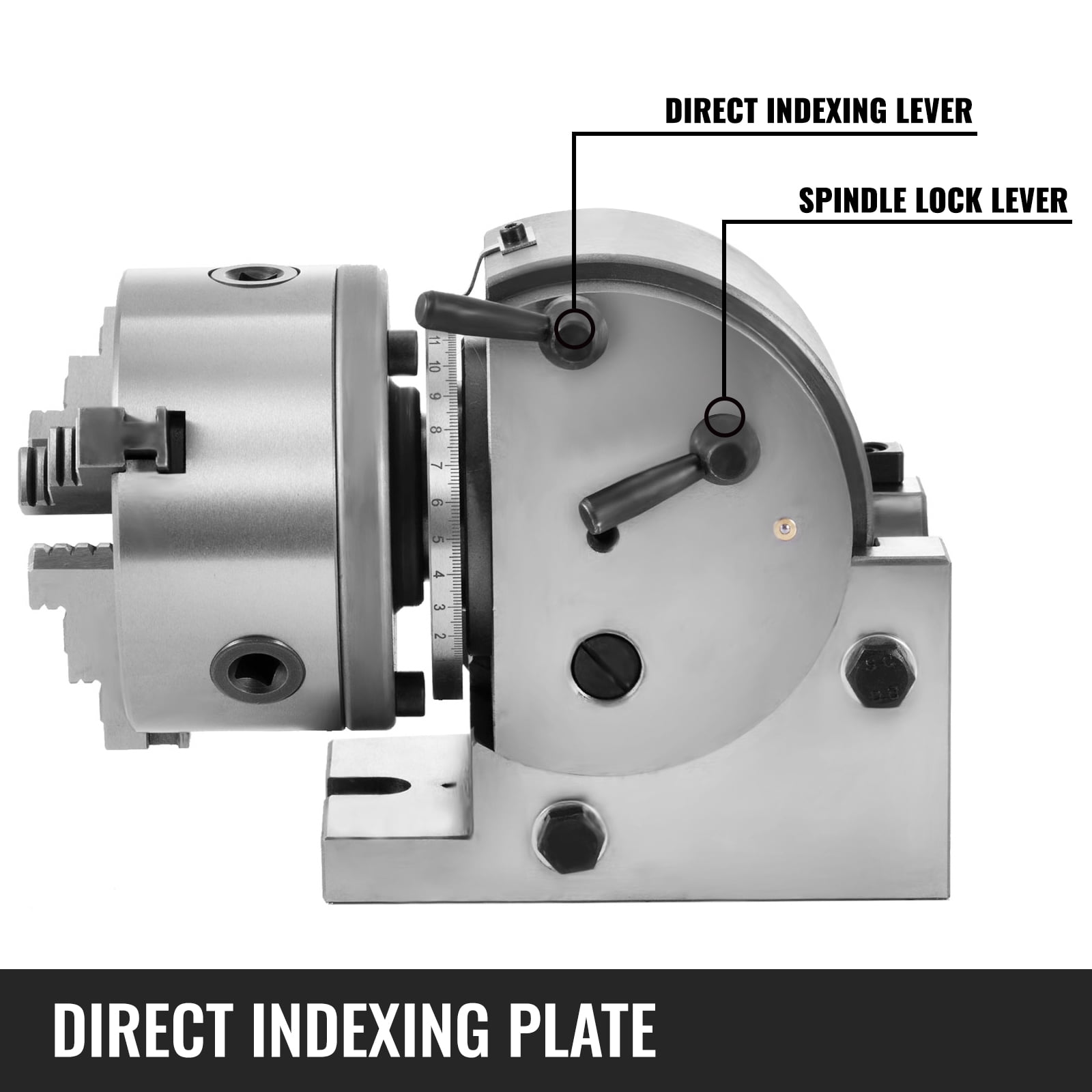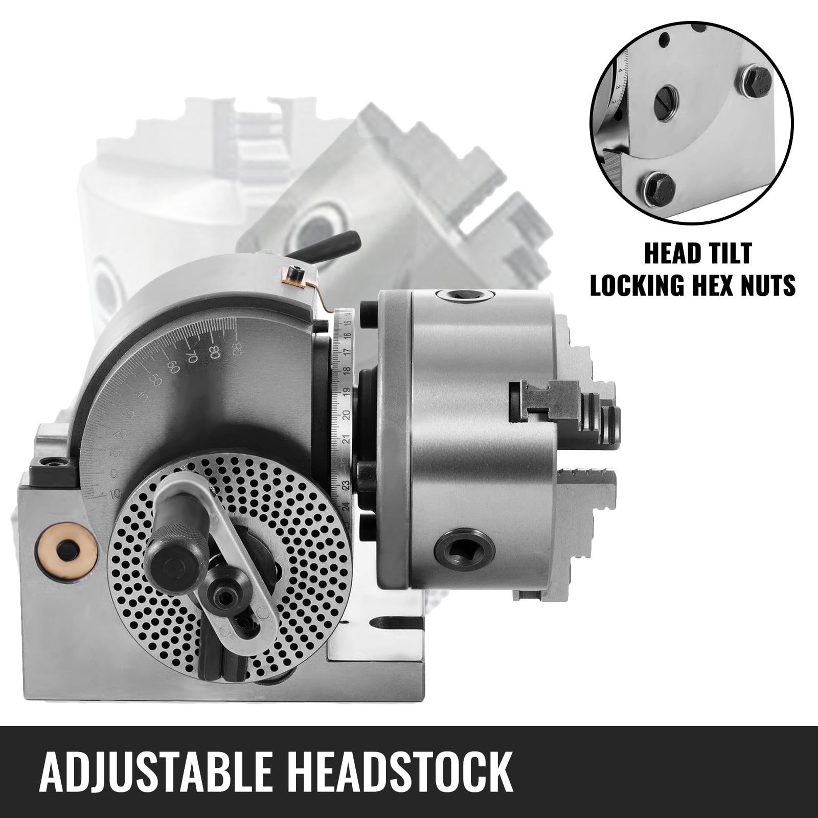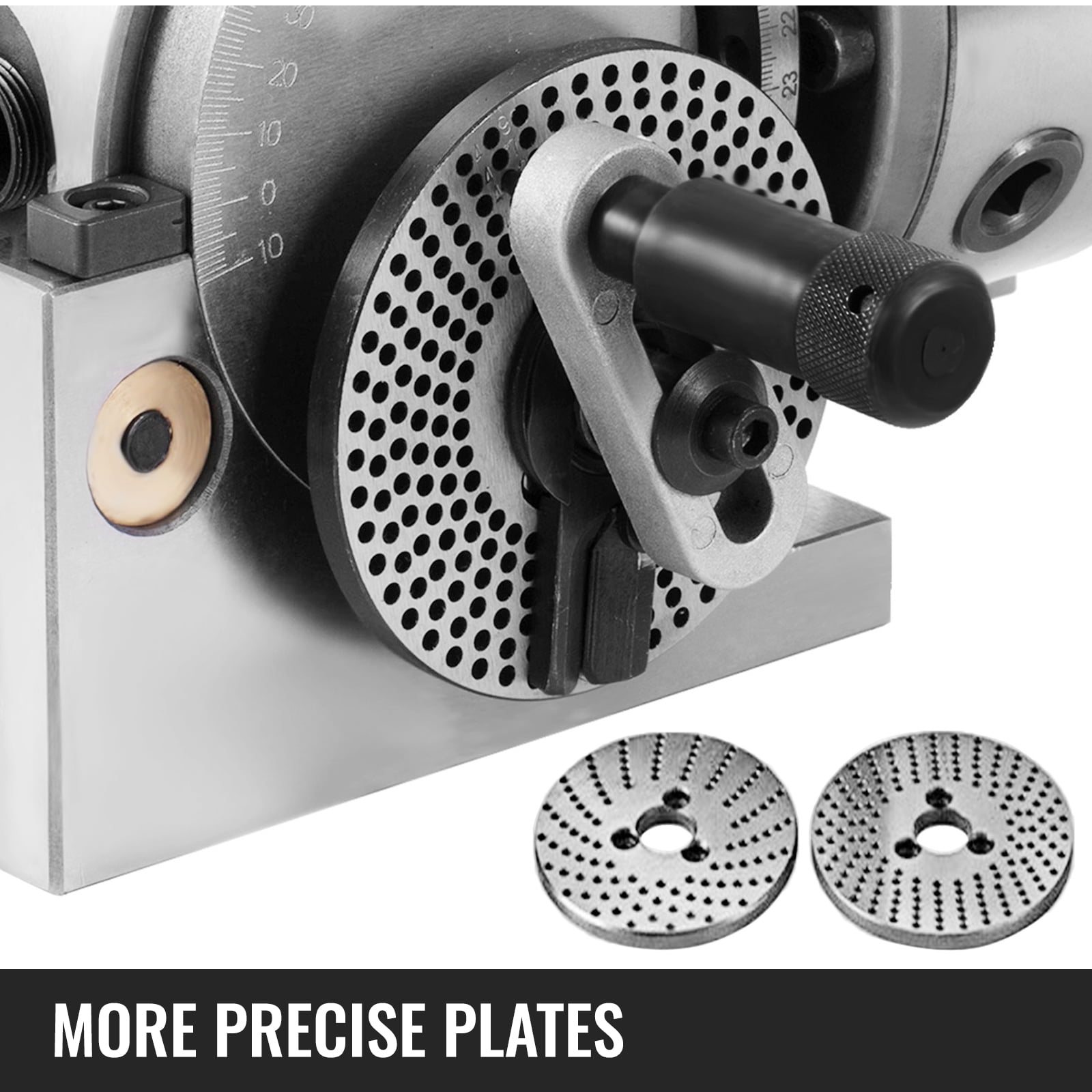 Brand Introduction VEVORbrand is a leading brand that specializes in equipment and tools. Along with thousands of motivated employees, VEVORbrand is dedicated to providing our customers with tough equipment & tools at incredibly low prices. Today, VEVORbrand has occupied markets of more than 200 countries with 10 million plus global members. Why Choose VEVORbrand? 1.Tough Quality Assurance 2.Incredibly Low Prices 3.Fast & Secure Delivery 4.30-Day Free Returns 5.24/7 Professional Customer Service Product Description BS-0 Precision Dividing Head The indexing head doesn’t only look great, but allow you to do more with your milling machine: measuring specific angles and dividing a circle into equidistant arcs. It comes with 3 interchangeable indexing plates and a tailstock to ensure more precise and stable work. It will be your perfect assistant to machine the flutes of a milling cutter, cut the teeth of a gear, mill curved slots, or drill a bolt hole circle around the circumference of a part. Rigid & Durable Body The indexing head features a long service life due to its rigid quality. It is designed with a mirror finish that resists wear and tear and looks low-profile. Adjustable Headstock The dividing head is enabled to tilt from 10° below horizontal to 90° vertical. And that will be convenient if you want to cut the part from a certain angle. Direct Indexing Plate By turning the 1st level that extrudes the pin, the pin goes into the plate and you can divide the full circle into 2, 3, 4, 6, 8, 12, or 24 divisions. The other level prevents the spindle from vibrating during machining. More Precise Plates The high precision performance of the indexing head is achieved with indirect indexing plates A, B, and C. All divisions 2-50 can be done, but some from 51 to 380 cannot be obtained. Check the manual before setting. Strong MT2 Tailstock The MT2 tailstock gives strong support to the workpiece being machined. It is particularly useful when the workpiece is relatively long and slender. Wide Application The rotary indexer is used on the tables of milling machines and other machine tools including drill presses, grinders, and boring machines. Specifications Swing: 6-1/2″ Center Height: 3-15/16″ Headstock Taper: MT2 Weight: 23 kg (50.7 lbs) Package Dimensions: 410*235*205 mm (16*9*8 in) Package Content 1 X Dividing Head 3 X Dividing Plates 1 X Tailstock 1 X 125 mm 3-Jaw Chuck