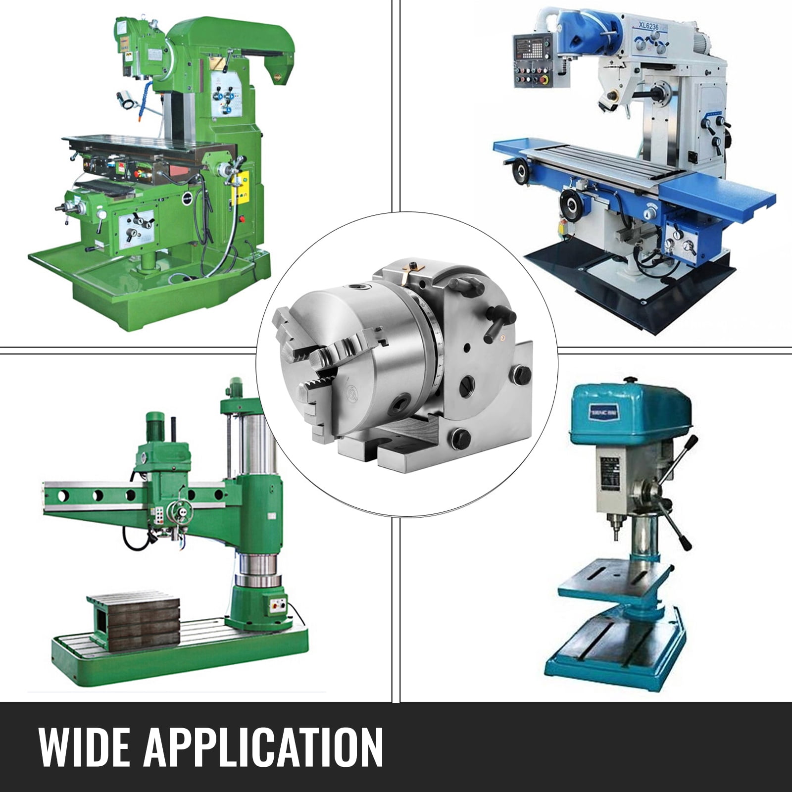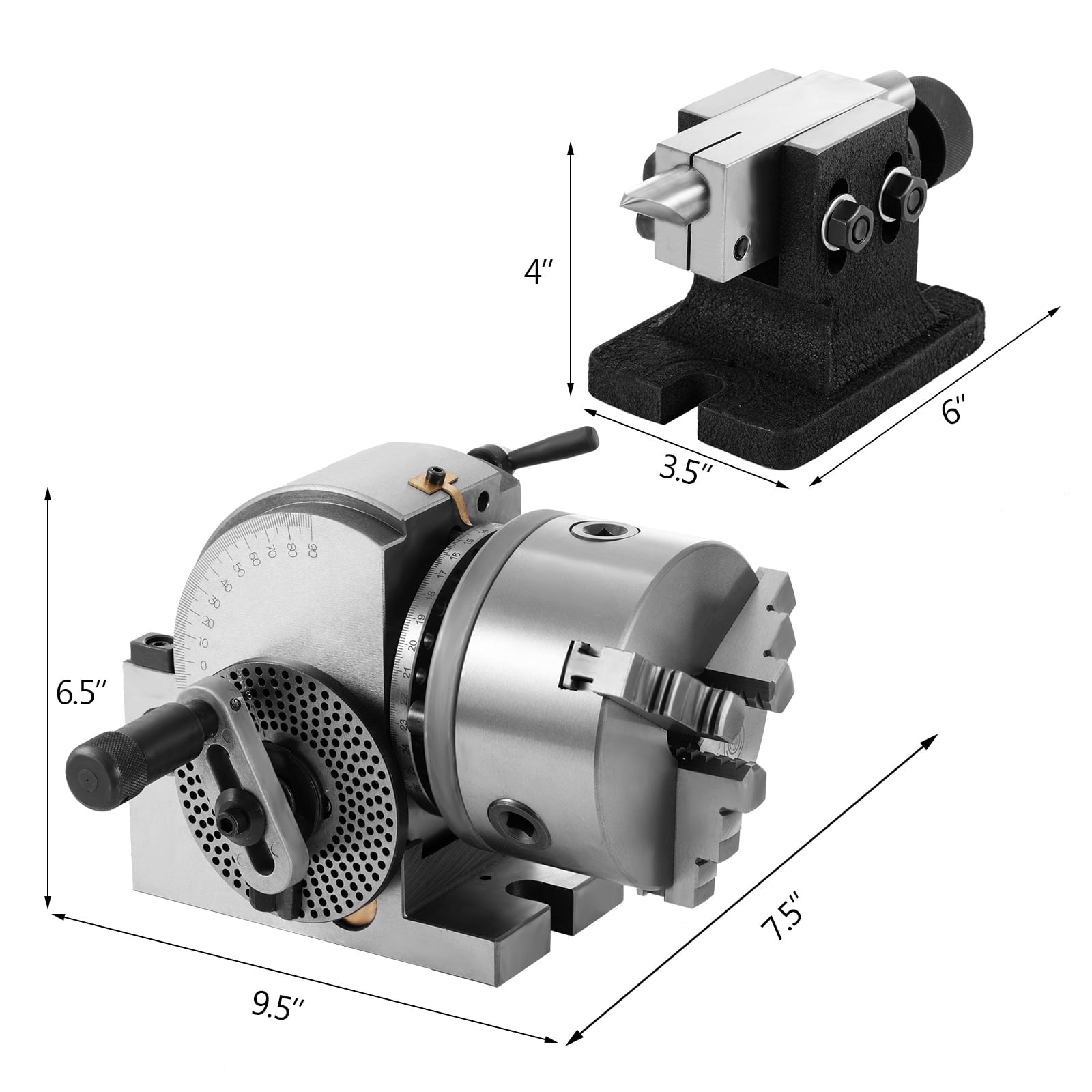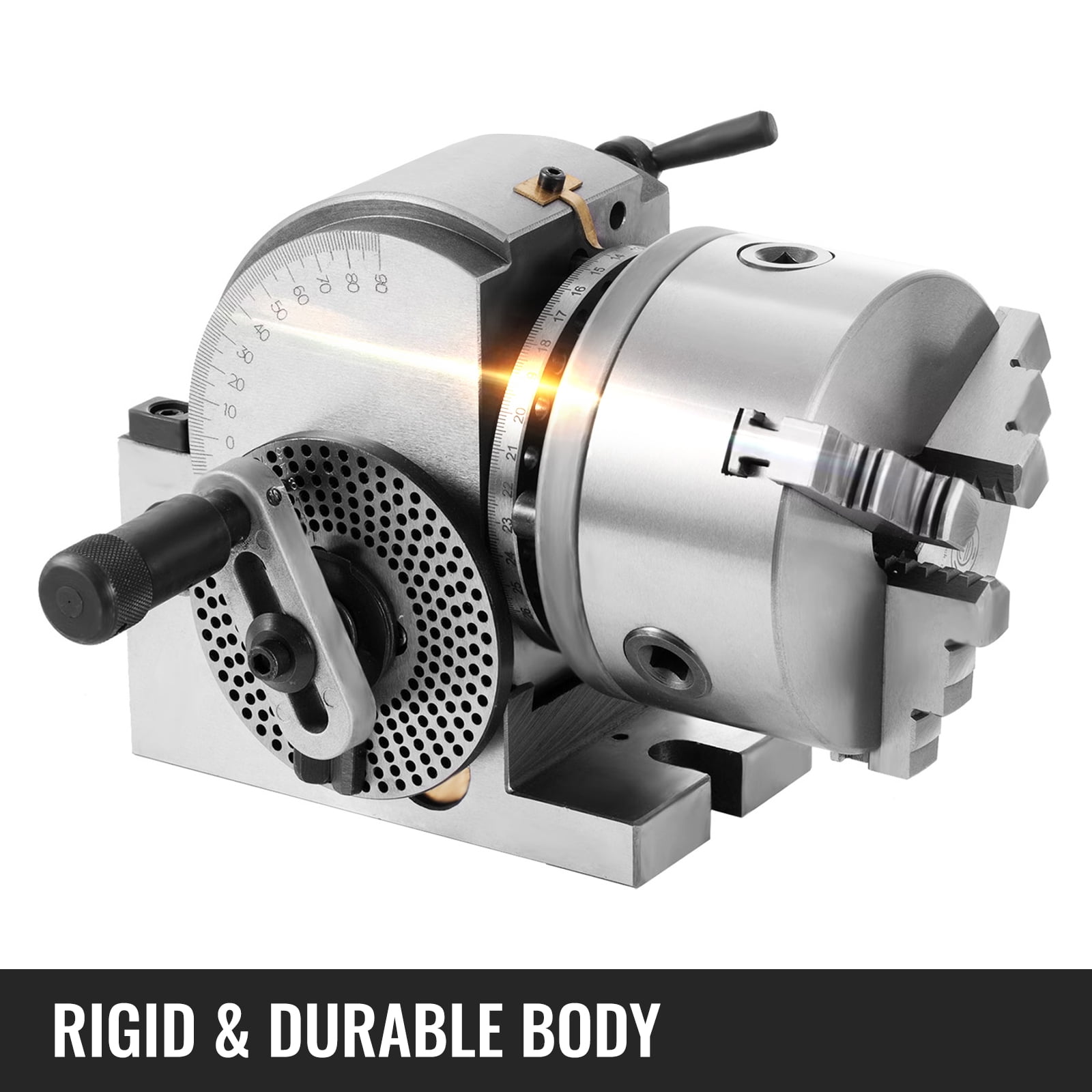 Brand Introduction VEVORbrand is a leading brand that specializes in equipment and tools. Along with thousands of motivated employees, VEVORbrand is dedicated to providing our customers with tough equipment & tools at incredibly low prices. Today, VEVORbrand has occupied markets of more than 200 countries with 10 million plus global members. Why Choose VEVORbrand? 1.Tough Quality Assurance 2.Incredibly Low Prices 3.Fast & Secure Delivery 4.30-Day Free Returns 5.24/7 Professional Customer Service Product Description BS-0 Precision Dividing Head The indexing head doesn’t only look great, but allow you to do more with your milling machine: measuring specific angles and dividing a circle into equidistant arcs. It comes with 3 interchangeable indexing plates and a tailstock to ensure more precise and stable work. It will be your perfect assistant to machine the flutes of a milling cutter, cut the teeth of a gear, mill curved slots, or drill a bolt hole circle around the circumference of a part. Rigid & Durable Body The indexing head features a long service life due to its rigid quality. It is designed with a mirror finish that resists wear and tear and looks low-profile. Adjustable Headstock The dividing head is enabled to tilt from 10° below horizontal to 90° vertical. And that will be convenient if you want to cut the part from a certain angle. Direct Indexing Plate By turning the 1st level that extrudes the pin, the pin goes into the plate and you can divide the full circle into 2, 3, 4, 6, 8, 12, or 24 divisions. The other level prevents the spindle from vibrating during machining. More Precise Plates The high precision performance of the indexing head is achieved with indirect indexing plates A, B, and C. All divisions 2-50 can be done, but some from 51 to 380 cannot be obtained. Check the manual before setting. Strong MT2 Tailstock The MT2 tailstock gives strong support to the workpiece being machined. It is particularly useful when the workpiece is relatively long and slender. Wide Application The rotary indexer is used on the tables of milling machines and other machine tools including drill presses, grinders, and boring machines. Specifications Swing: 6-1/2″ Center Height: 3-15/16″ Headstock Taper: MT2 Weight: 23 kg (50.7 lbs) Package Dimensions: 410*235*205 mm (16*9*8 in) Package Content 1 X Dividing Head 3 X Dividing Plates 1 X Tailstock 1 X 125 mm 3-Jaw Chuck
