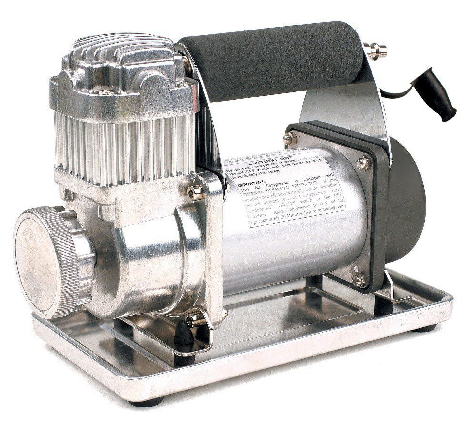 Portable compressor for tires up to 33 inches in diameter Able to generate a pressure of 150 PSI and an airflow of 2.3 CFM Comes with vibration resistant aluminum sand tray, 3 inflation tips, 5 in 1 inflator/deflator air hose, inline 100 PSI gauge, deluxe carry bag, 40 amp inline fuse holder, and dual battery clamps Connect to your vehicle battery, then connect to valve stem, and turn on for instant inflation Monitor tire pressure with 100 PSI inline gauge Permanent magnetic motor Specifications: Maximum 12V amp draw: 30 amps Maximum 24V amp draw: 15 amps Duty cycle: 33 percent at 100 PSI Ingress protection rating: IP54 Power cord length: 8 feet Air hose length: 25 feet CFM at 0 PSI: 2.3 CFM at 90 PSI: 0.92 Voltage: 12 volts Dimensions (L x W x H): 9 x 4.9 x 7.5 inches Weight: 8.7 pounds Manufacturer warranty: 1-year warranty