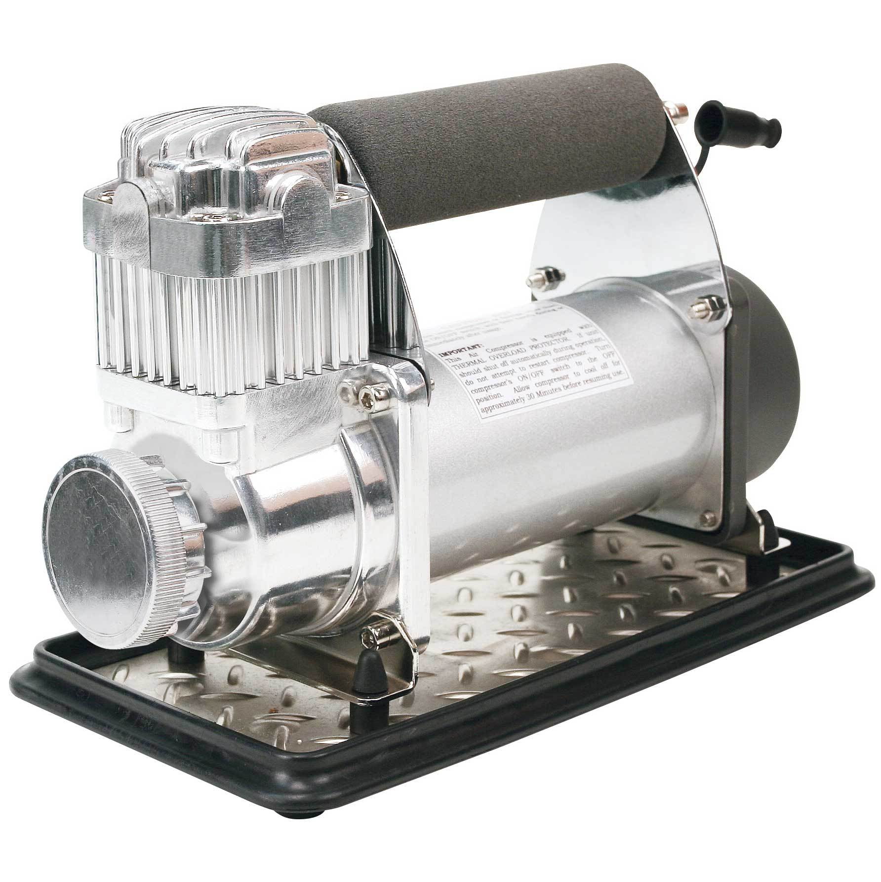 Powerful portable compressor compatible with tires up to 35 inches 12-volt permanent magnet motor with thermal overload protectors to keep compressor cool and running longer Dual battery clamps connect to your vehicle battery for convenient power; 5-in-1 inflator/deflator air hose easily attaches to tire valve stem and begins filling with a flip of a switch Fills a 35-inch tire from 0 to 30 PSI in under 6 minutes Max 150 PSI; 2.30 CFM head pressure at 0 PSI Comes with vibration-resistant diamond-plate sand tray, 3 inflation tips, 8-foot power cord, 25-foot 5-in-1 inflator/deflator air hose, inline 100-PSI gauge, deluxe carry bag, 40-amp inline fuse holder, and dual battery clamps I-beam diamond-plate sand tray provides vibration resistance and added stability Monitor tire pressure with 100 PSI inline gauge at valve attachment end without running back and forth Ideal for off-road enthusiasts and everyday commuters Specifications: CFM at 0 PSI: 2.30 CFM at 100 PSI: 1.19 Motor type: Permanent magnetic Voltage: 12 volts Maximum amp draw: 30 amps Duty cycle: 33% @ 100 PSI Max pressure: 150 PSI Power cord length: 8 feet Air hose length: 25 feet Power type: Portable electric Ingress protection rating: IP54 Product/item type: Portable air compressor Material: Steel Color: Silver Dimensions (L x W x H): 10.87 x 5.83 x 7.48 inches Weight: 10.4 pounds Manufacturer warranty: 1-year warranty